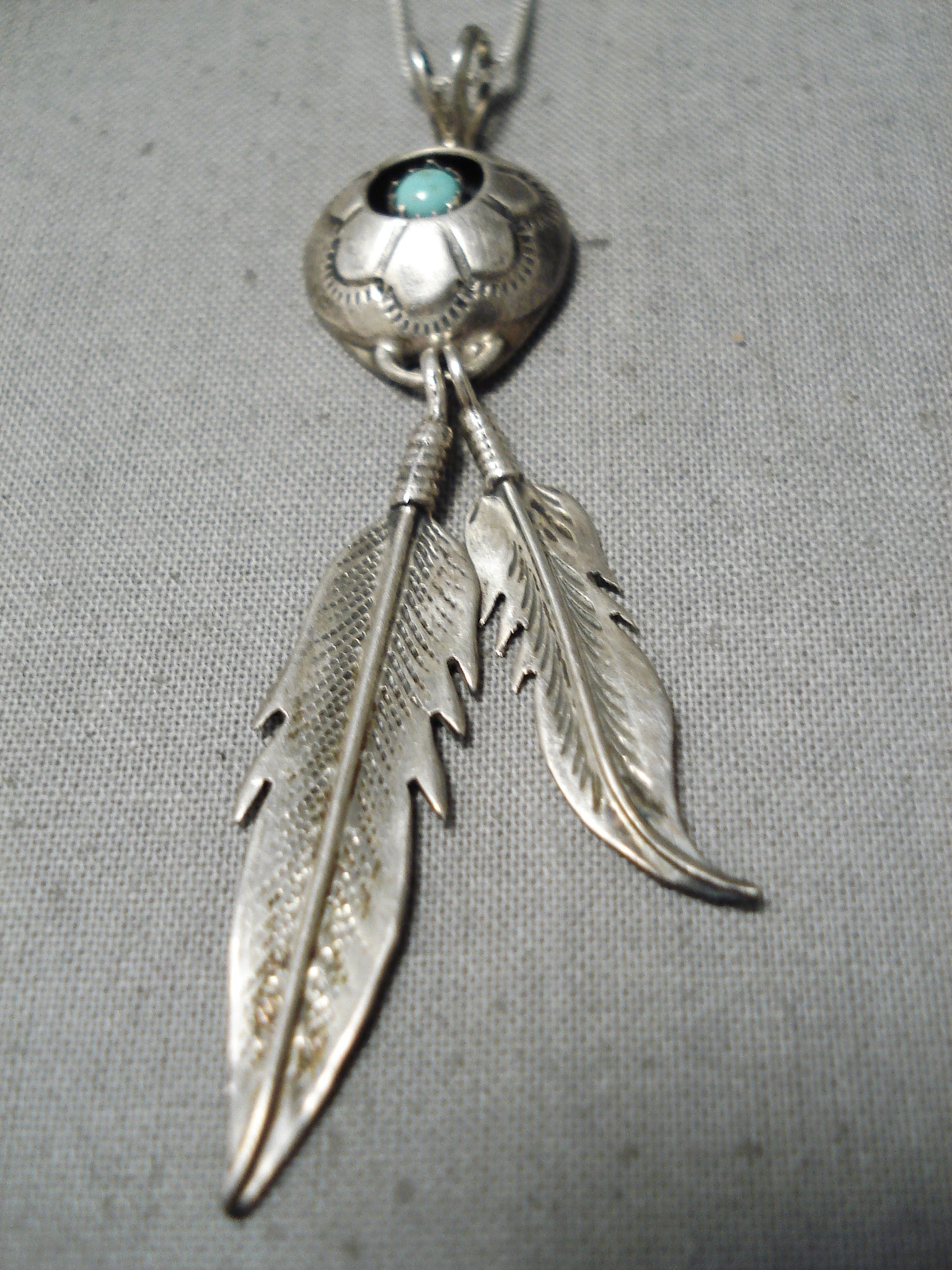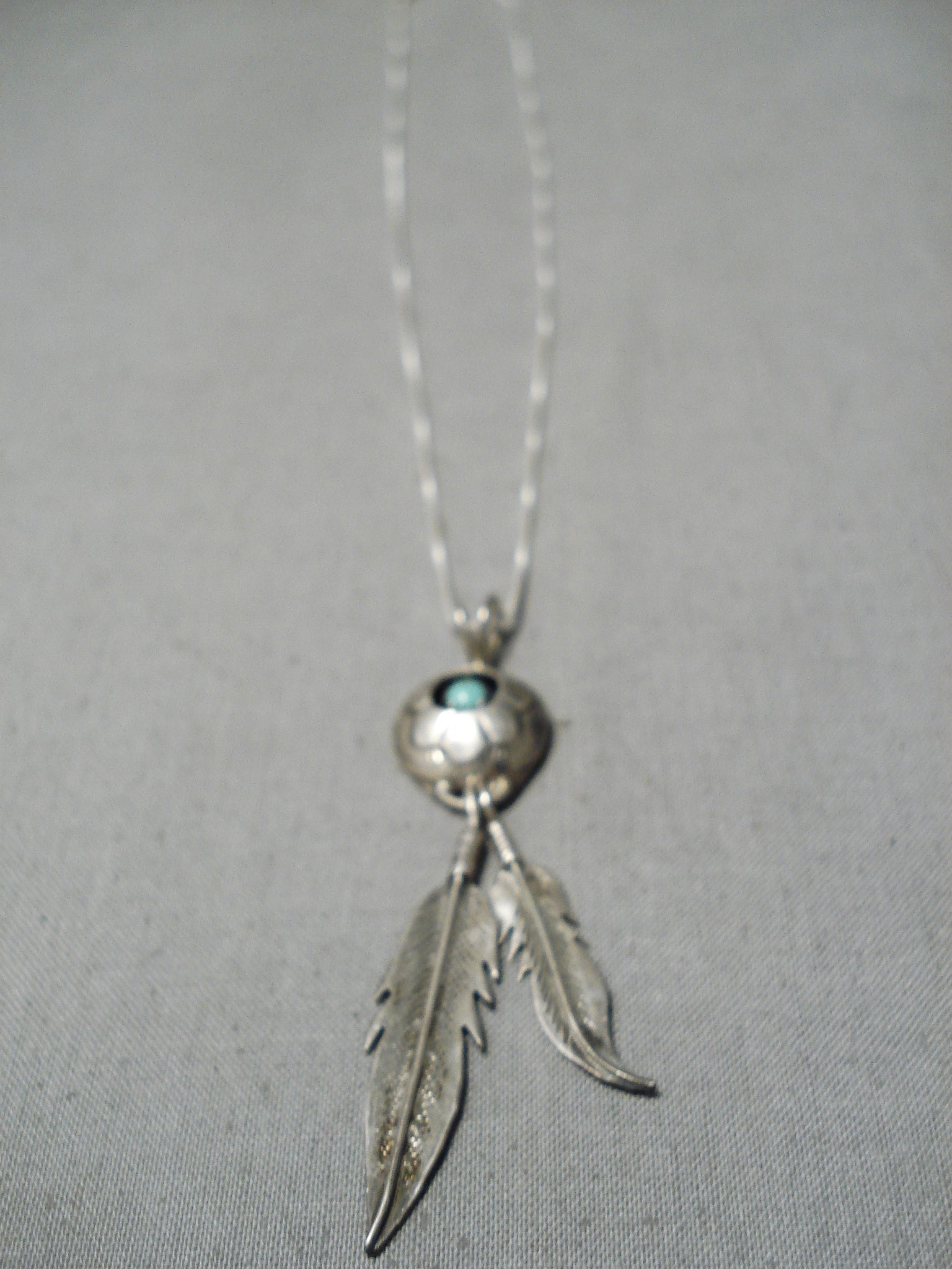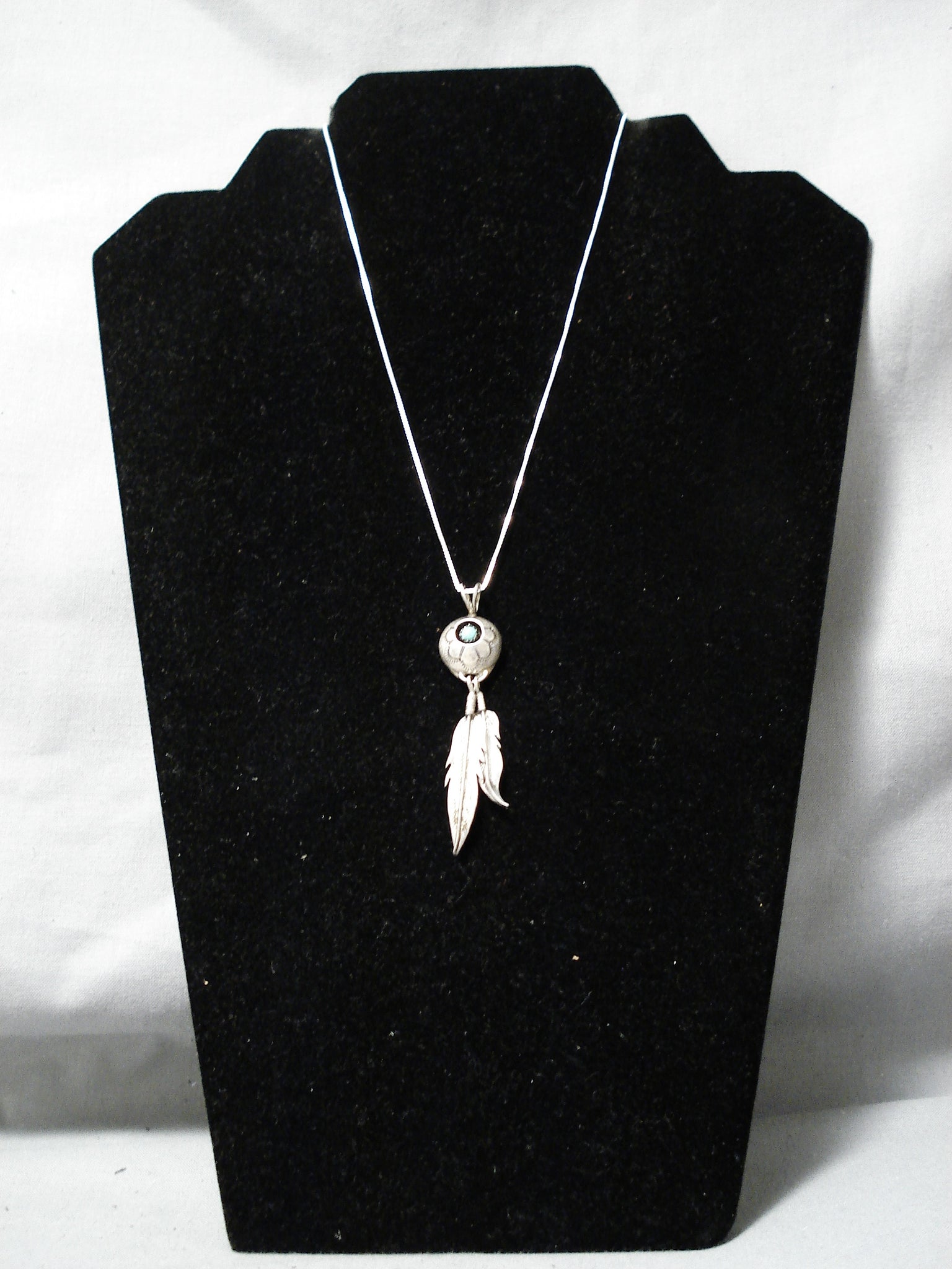 Here we have an exceptional vintage Navajo silver necklace having a handcarved round silver shadowbox pendant with a turquoise center, silver handstampings, silver bail and 2 handcarved silver feather pendants! The necklace has a thin silver chain with a handmade silver lobster clasp! Simply Amazing! The pendant measures about 2-1/4" from top to bottom. Turquoise stone measures about 1/8" x 1/8". Sterling silver, marked. The length of the necklace measures around 15". Sturdy 7 grams. Cir Mid century.