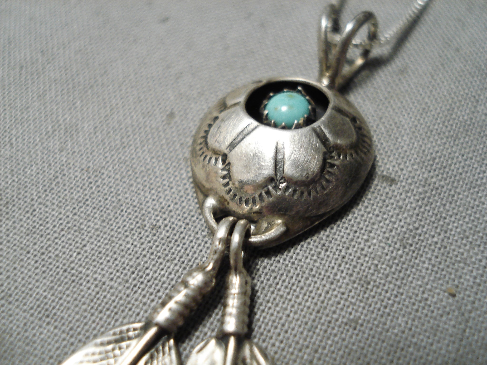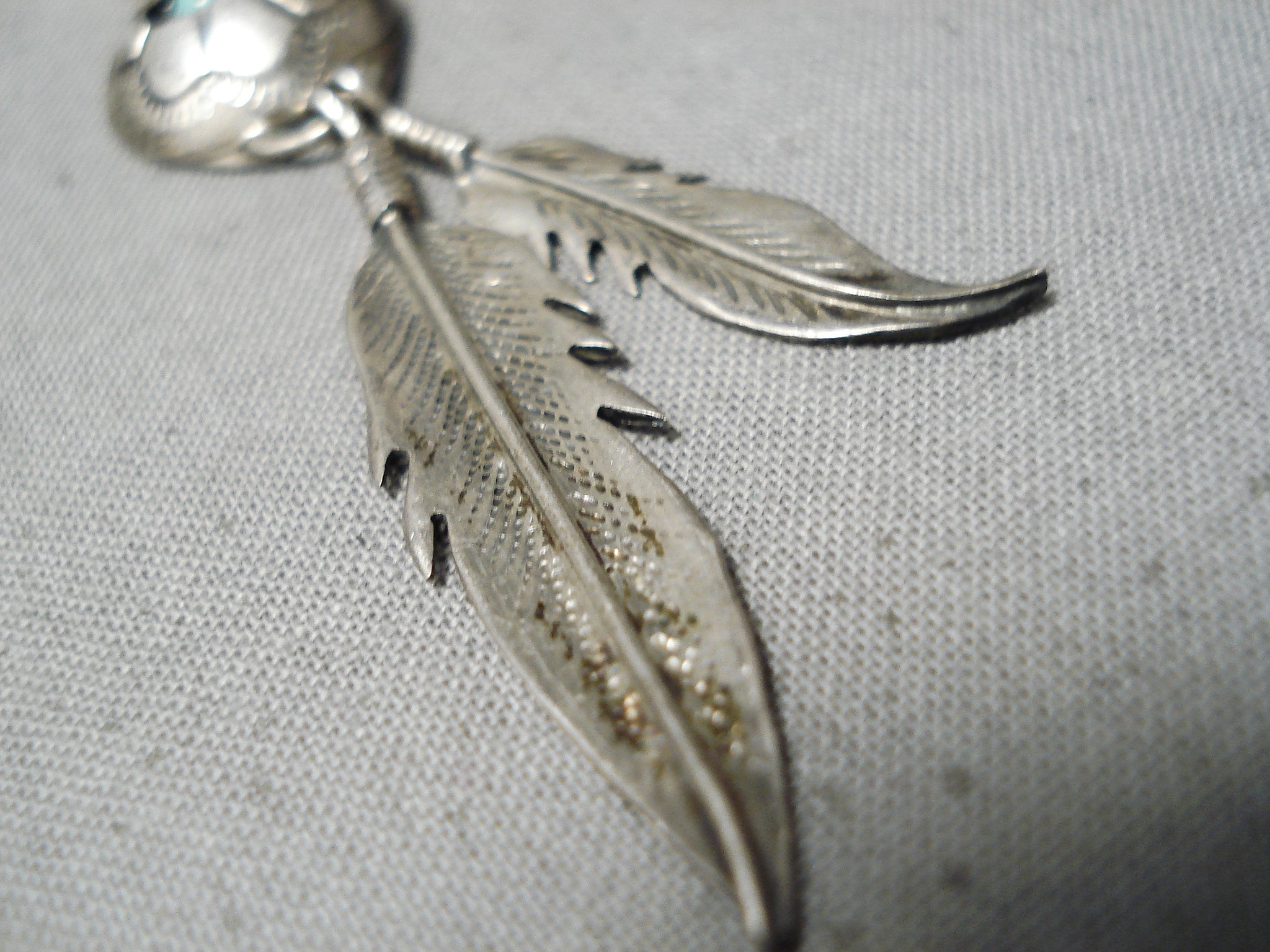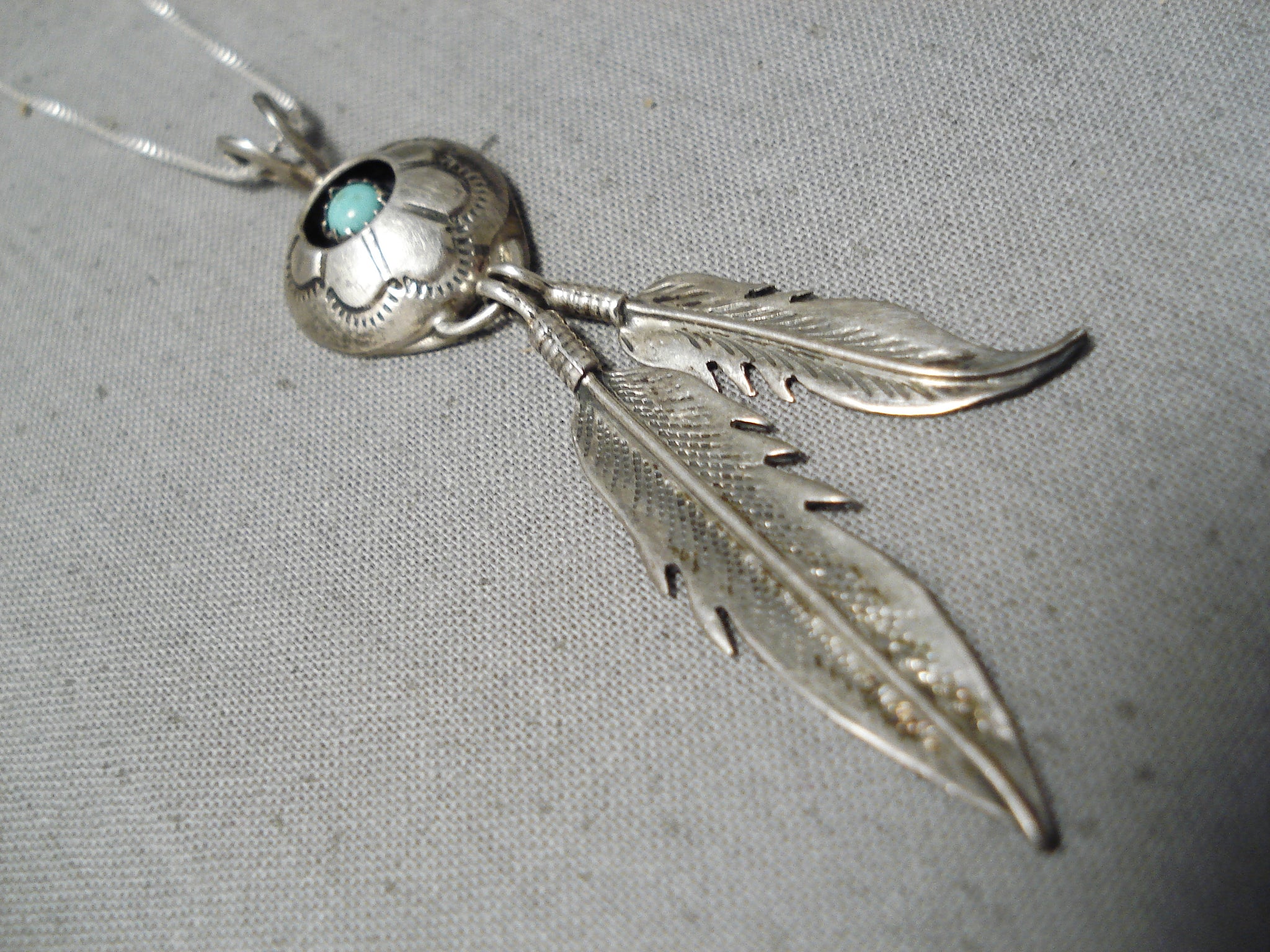 Here we have an exceptional vintage Navajo silver necklace having a handcarved round silver shadowbox pendant with a turquoise center, silver handstampings, silver bail and 2 handcarved silver feather pendants! The necklace has a thin silver chain with a handmade silver lobster clasp! Simply Amazing! The pendant measures about 2-1/4" from top to bottom. Turquoise stone measures about 1/8" x 1/8". Sterling silver, marked. The length of the necklace measures around 15". Sturdy 7 grams. Cir Mid century.