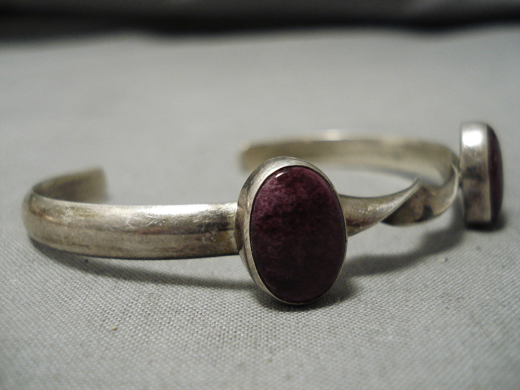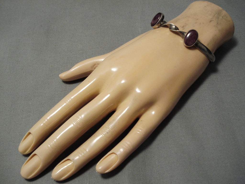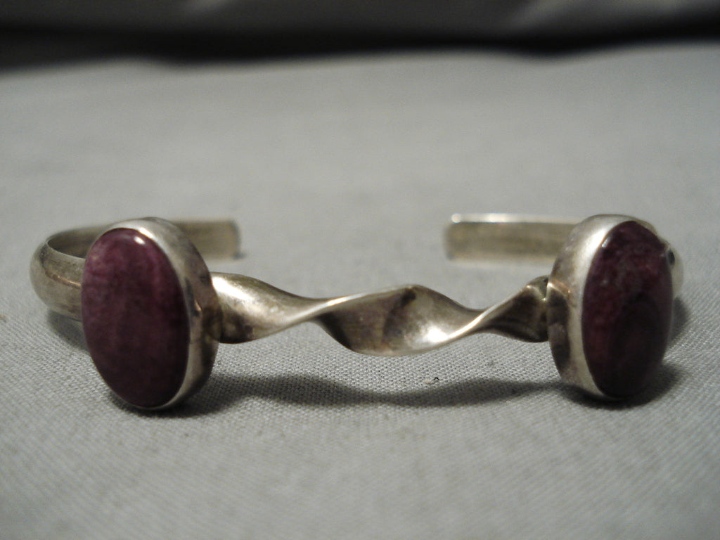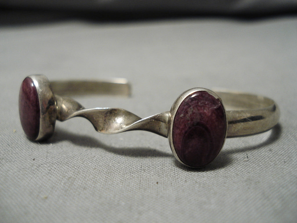 This is a superlative vintage Navajo silver bracelet. With a unique silver twist separating them in the very center of the bracelet, we have not one - but two large stunning oval sugulite stones! The stones measure around 1/2" x 3/8". The width of the bracelet measures around 9/16". Signed by Navajo artist, E D. Sterling silver, marked. The inside end to end measures around 5-7/8" with an additional 1" gap. Sturdy 16 grams.