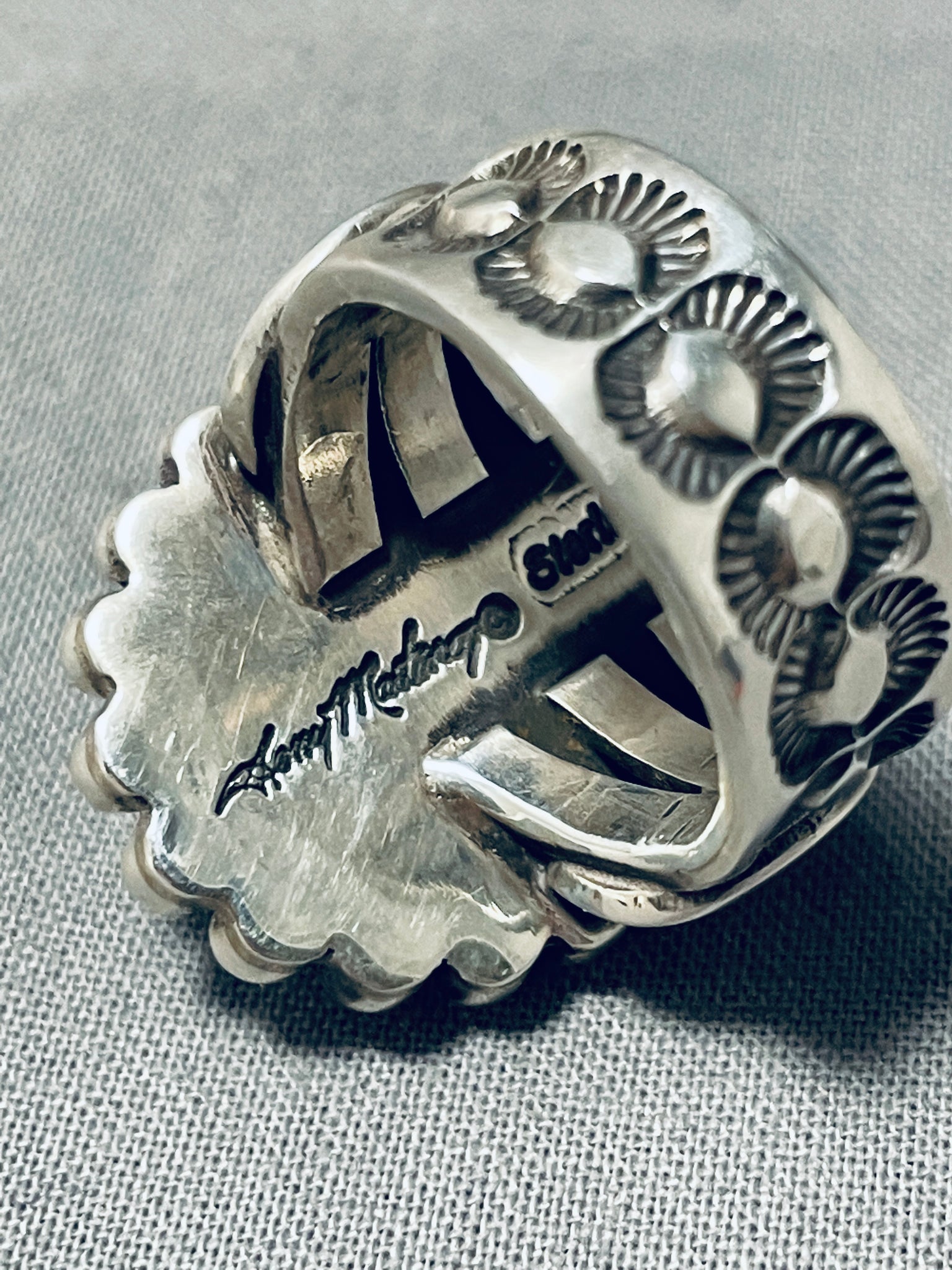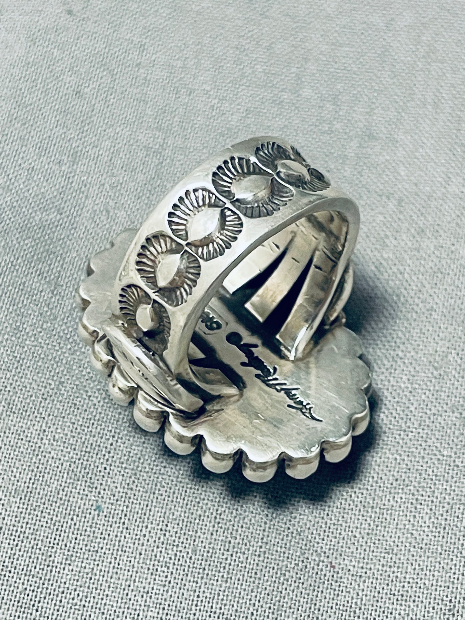 This is a wonderful Navajo large single stone silver ring. This amazing ring contains a large oval shaped Number 8 turquoise stone with surrounding stunning silver works. The surrounding silver works include a thick rope with multiple accenting silver large raindrops. The thickness of the wide silver shank is just incredible, I love the superior silver cloud stampings wrapping all the way around the shank with accenting side sun stamped flanks. The center stone measures around 3/4" x 1/2". The ring face measures around 1-1/8" x 7/8". Signed by Navajo artist, AM. The ring size is around 7. Sterling silver, marked. Sturdy 19 grams.