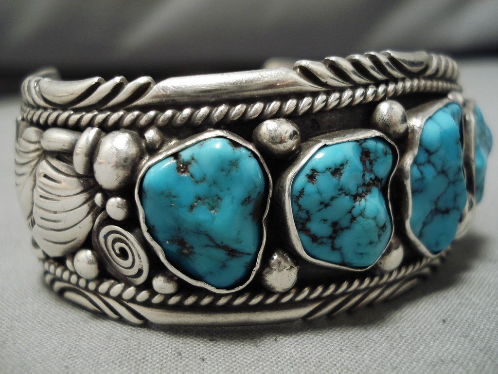 This is a magnificent Navajo five stone silver bracelet being very rare as it was handmade by the famous artist, Ben Begaye. This is one of Bens earlier pieces, making it incredibly collectible. This outstanding piece contains five large nugget turquoise stones with amazing accenting silver raindrops. Located at each end of the wonderful wide silver cuff are incredible hand carved silver leaves, swirling stems, raindrops and bridge like patterns. Bordering the cuff are deep waving silver works with accenting ropes. The center stone measures around 3/4" x 1/2". The width of the bracelet measures around 1-1/8". Signed by Navajo artist, Ben Begaye . Sterling silver, marked. Cir. 1970's+. The inside end to end measures around 5-1/4" with an additional 1-3/4" gap. Sturdy 60 grams.