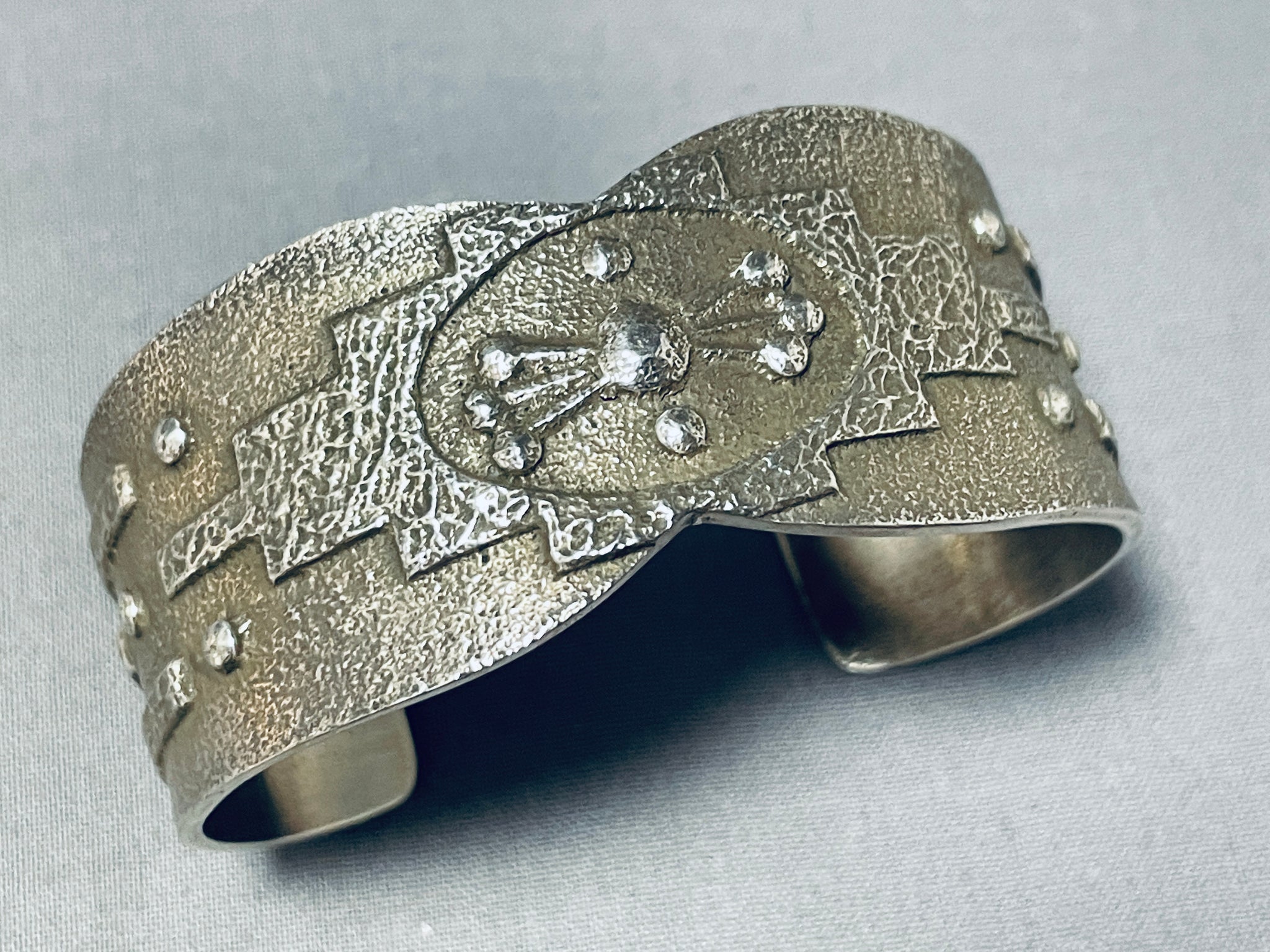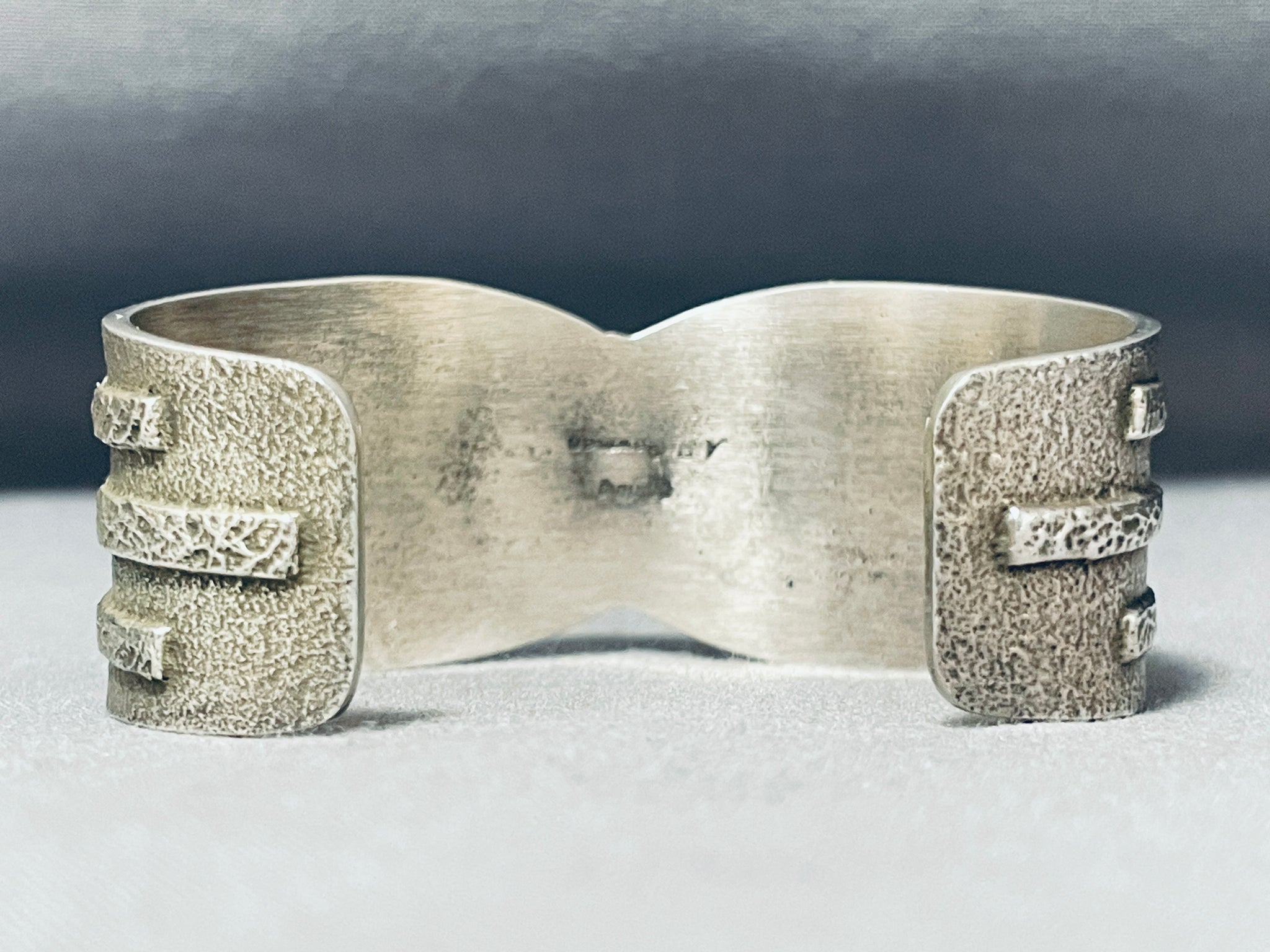 Superb Native American Navajo Signed Sterling Silver Geometric Heavy Bracelet