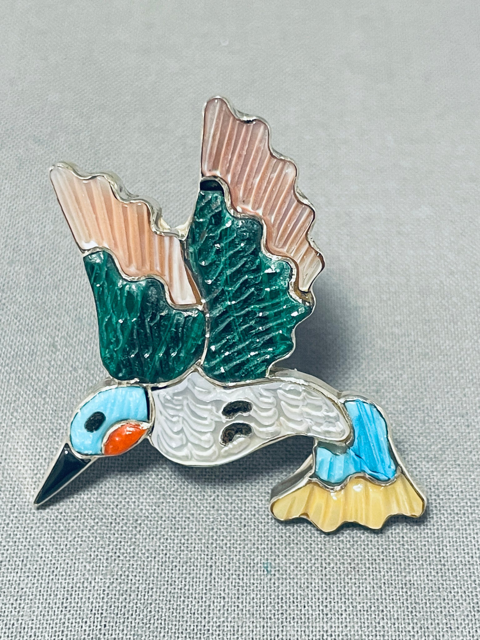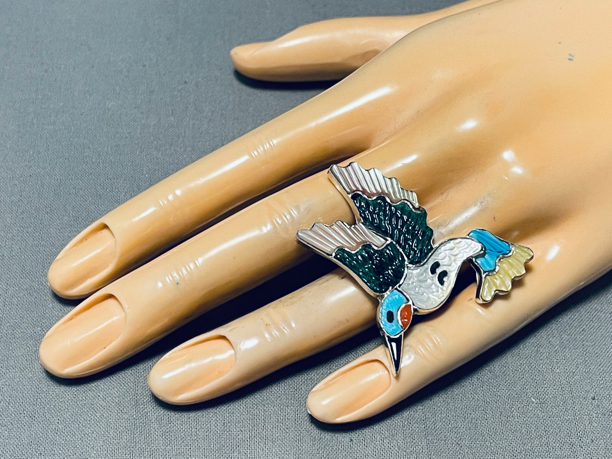 Superb Native American Zuni Signed Textured Inlay Turquoise Jet Sterling Silver Bird Ring