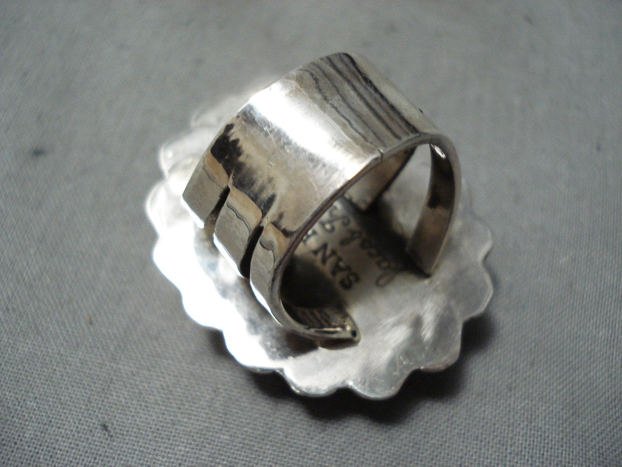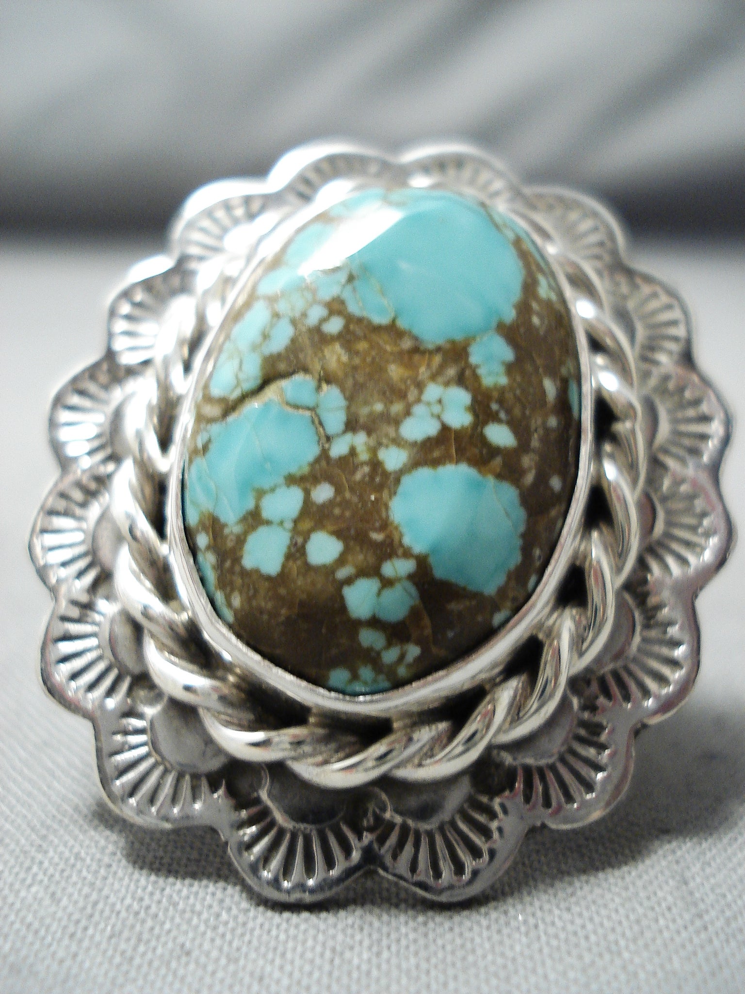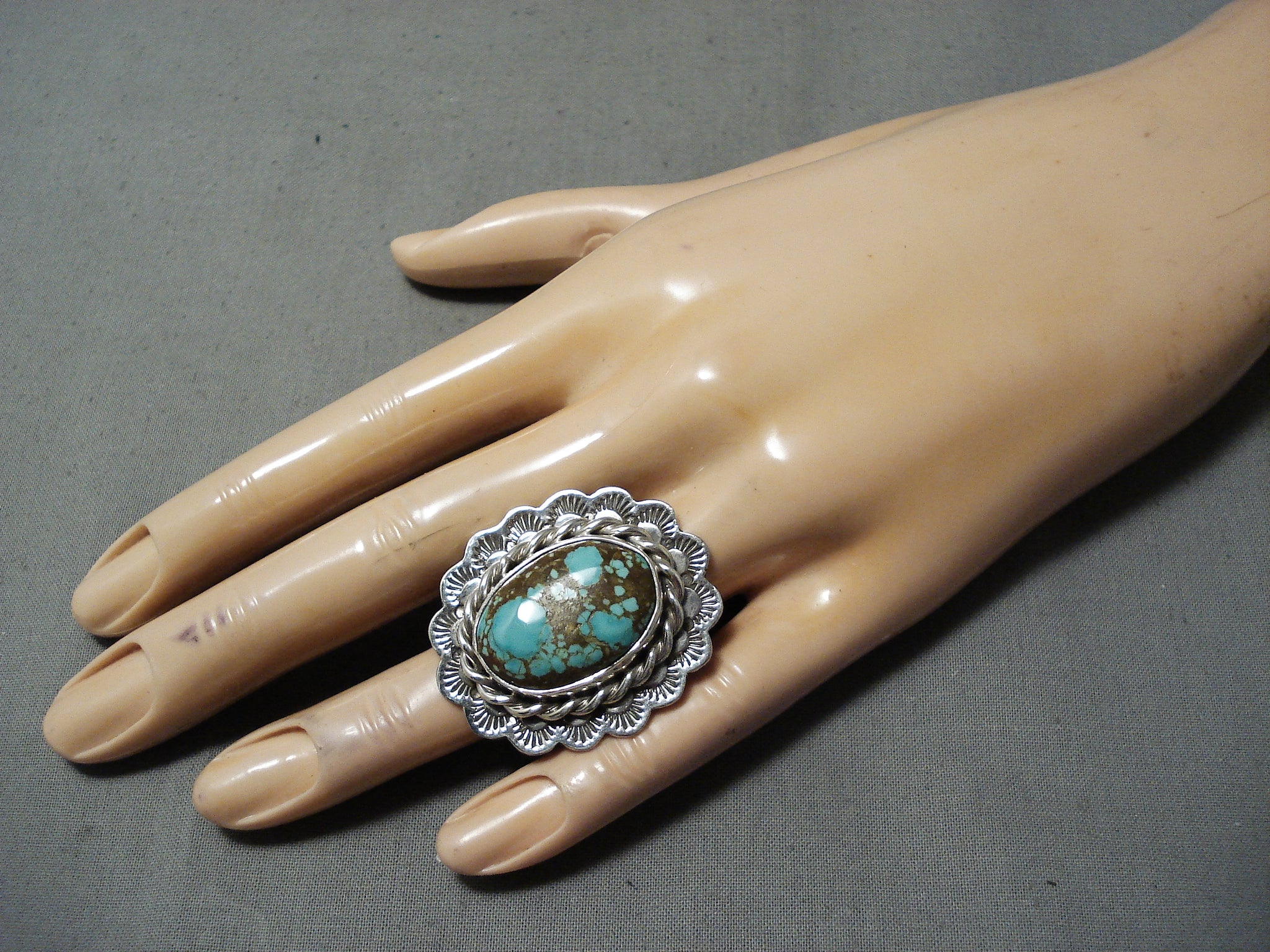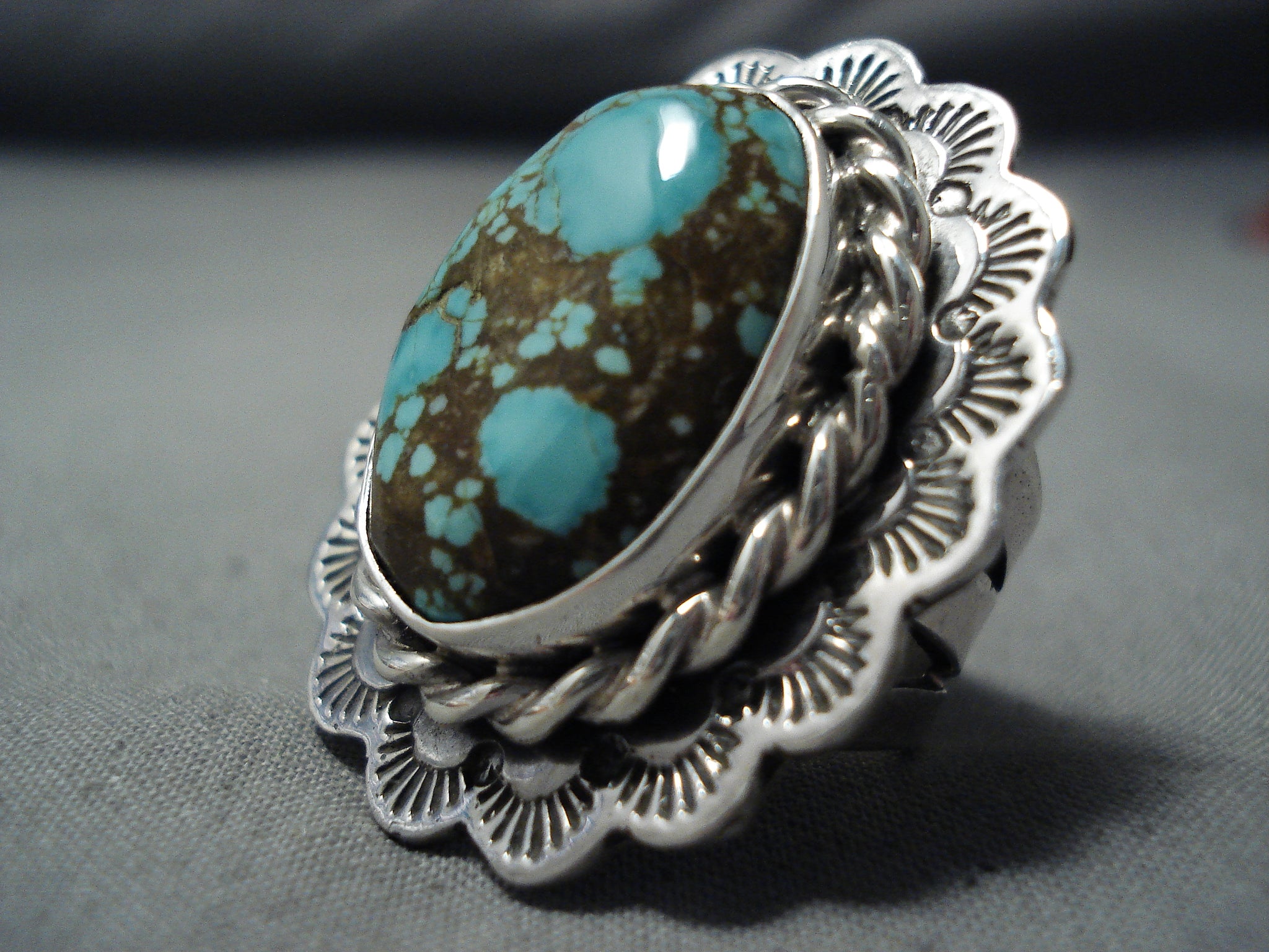 Here we have an impressive San Felipe silver ring having a #8 turquoise oval surrounded by handcarved twisted silver rope, a handcarved scalloped silver border with silver handstampings and a handcarved graduated triple silver rail band! Truly Stunning Piece! The center stone measures around 7/8" x 5/8". The ring face measures around 1-1/2" x 1-1/4". Signed by San Felipe artist, Jake Francosa. The ring size is around 8. Sterling silver, marked. Sturdy 23 grams.