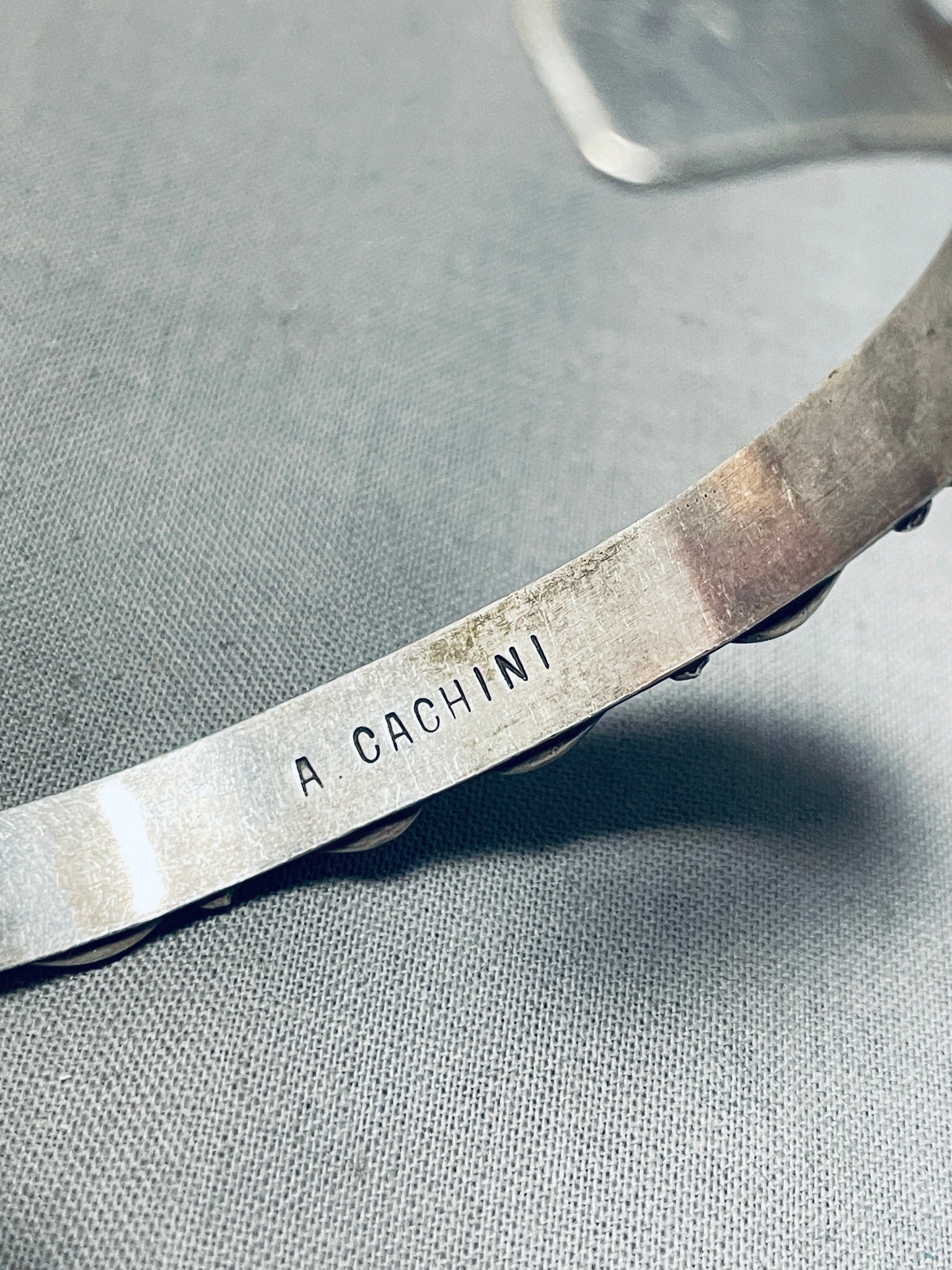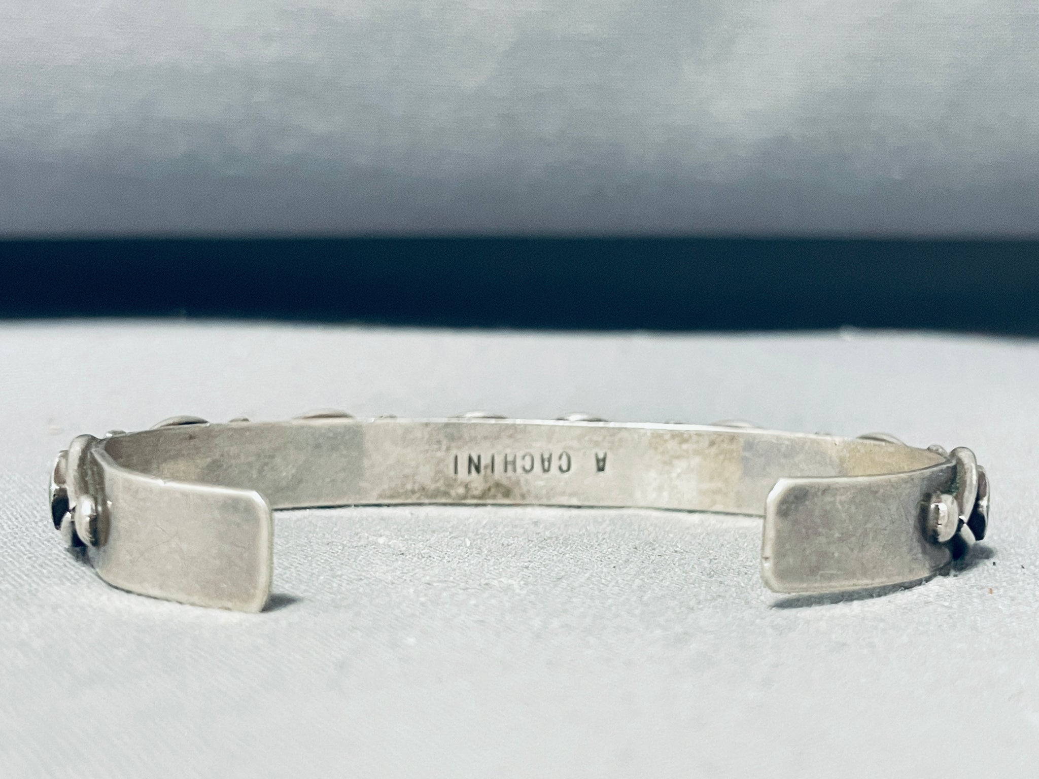 The stones measure around 1/8" x 1/8". The width of the bracelet measures around 1/4". Signed by Zuni artist, A. Cachini. Sterling silver. The inside end to end measures around 5-1/8" with an additional 1-1/8" gap. Sturdy 14 grams.