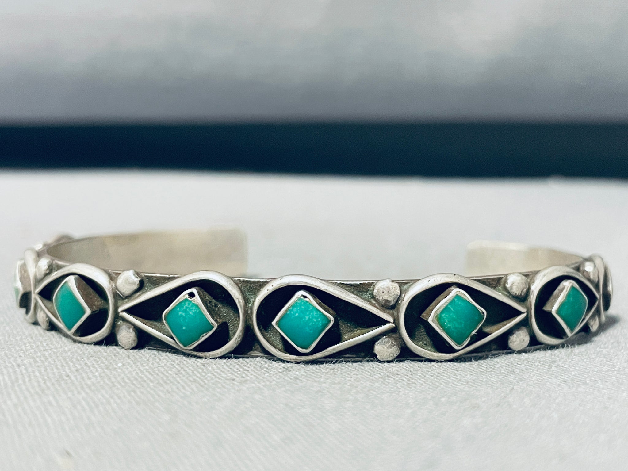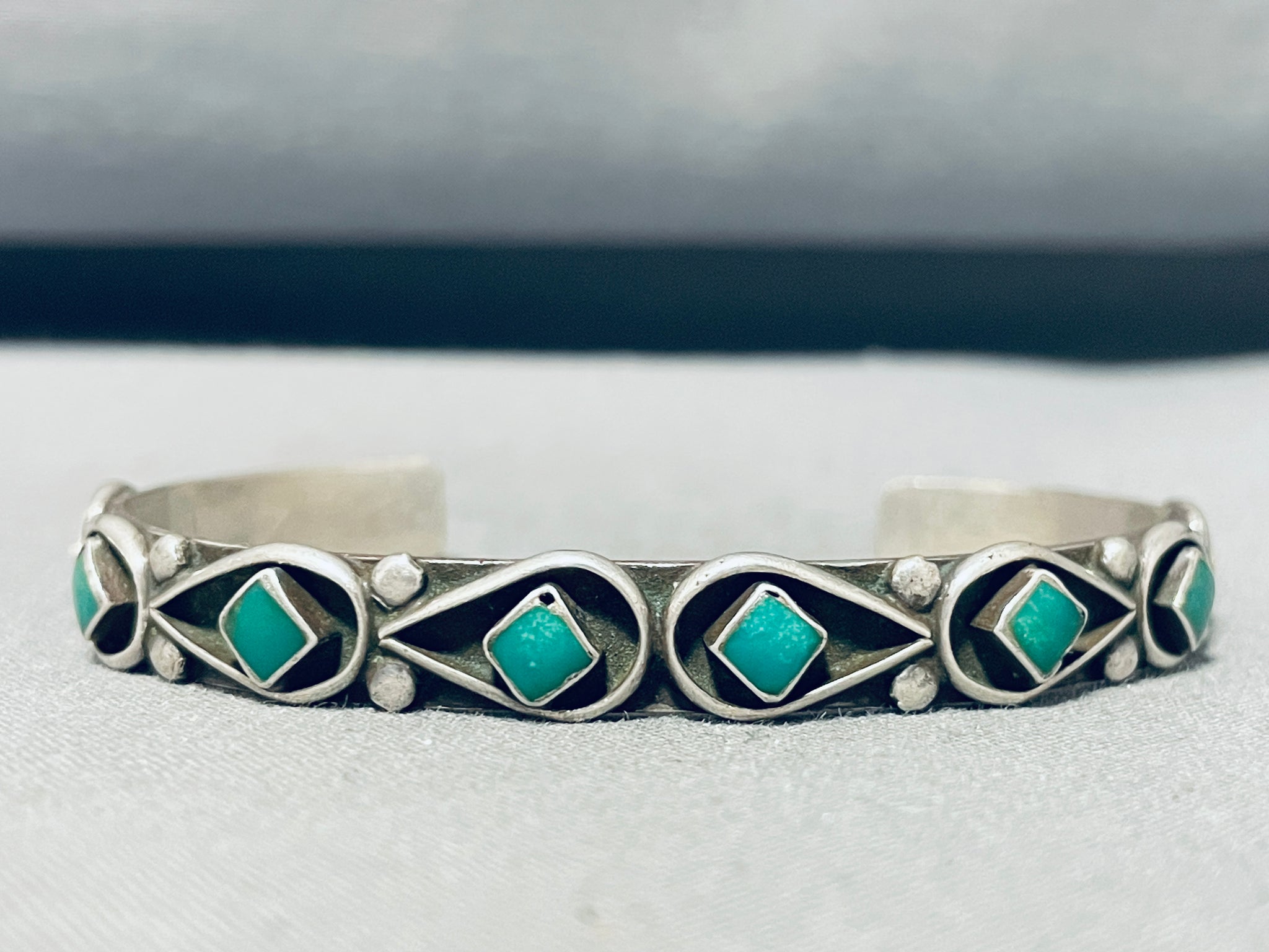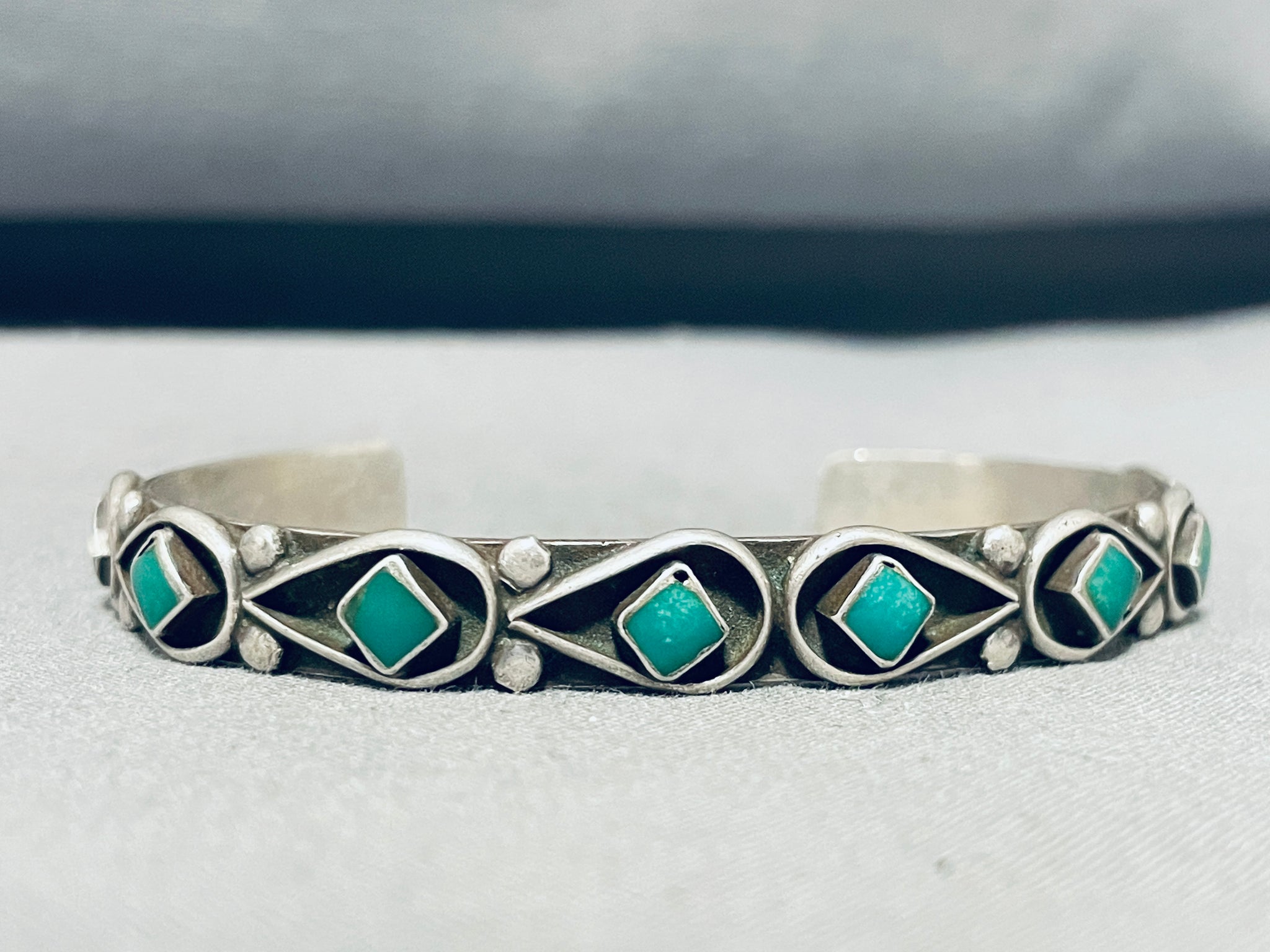 This is a fascinating vintage Zuni silver bracelet featuring 8 Cerrillos turquoise squares surrounded by silver teardrop borders with dual silver beads on a handcarved solid silver cuff! Simply Stunning!