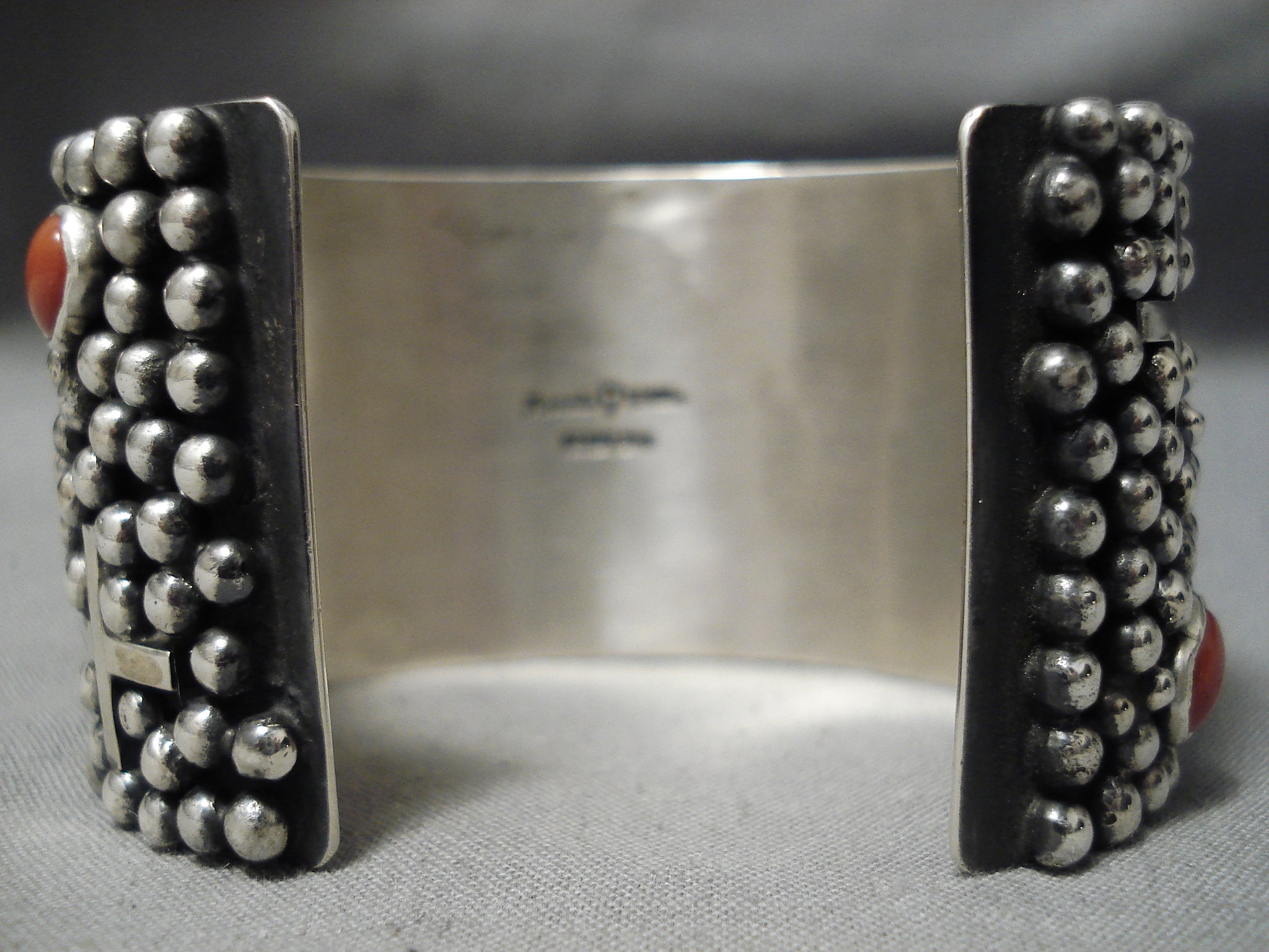 A fascinating vintage Navajo silver bracelet. Set against a dark backdrop, massive amounts of bright silver beads completely decorate this wide cuff like stars in the sounthwestern night sky! Silver crosses and diagonals of 3 coral stones make their presence known as they give this piece impressive depth and dimension! The center stone measures around 5/16" x 1/4". The width of the bracelet measures around 1-1/2". Signed by Navajo artist, Ron Willie. Sterling silver, marked. The inside end to end measures around 5-1/2" with an additional 1-1/8" gap. Sturdy 124 grams.