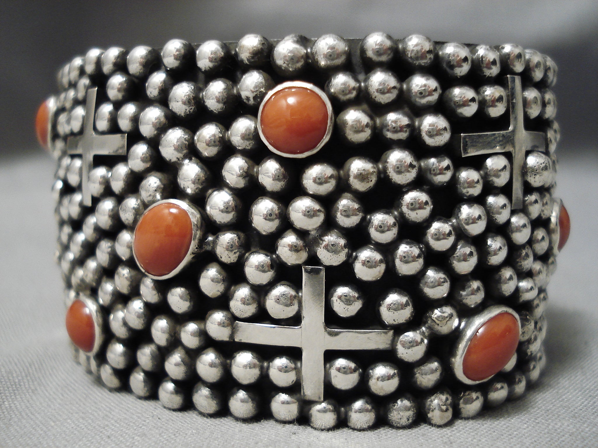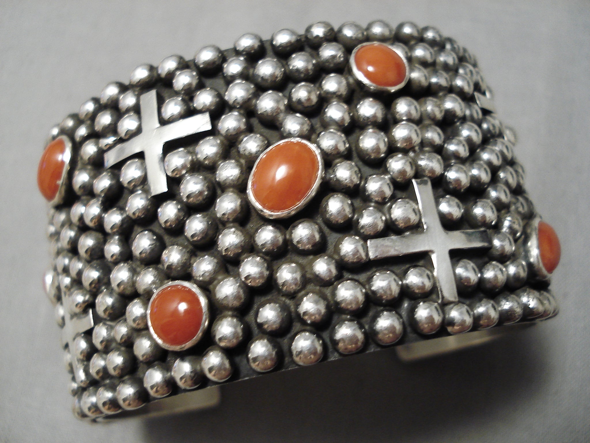 Superior Christian Cross Native American Navajo Domed Coral Sterling Silver Bracelet