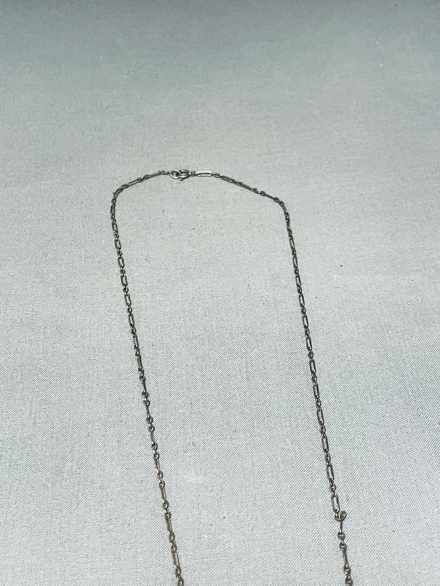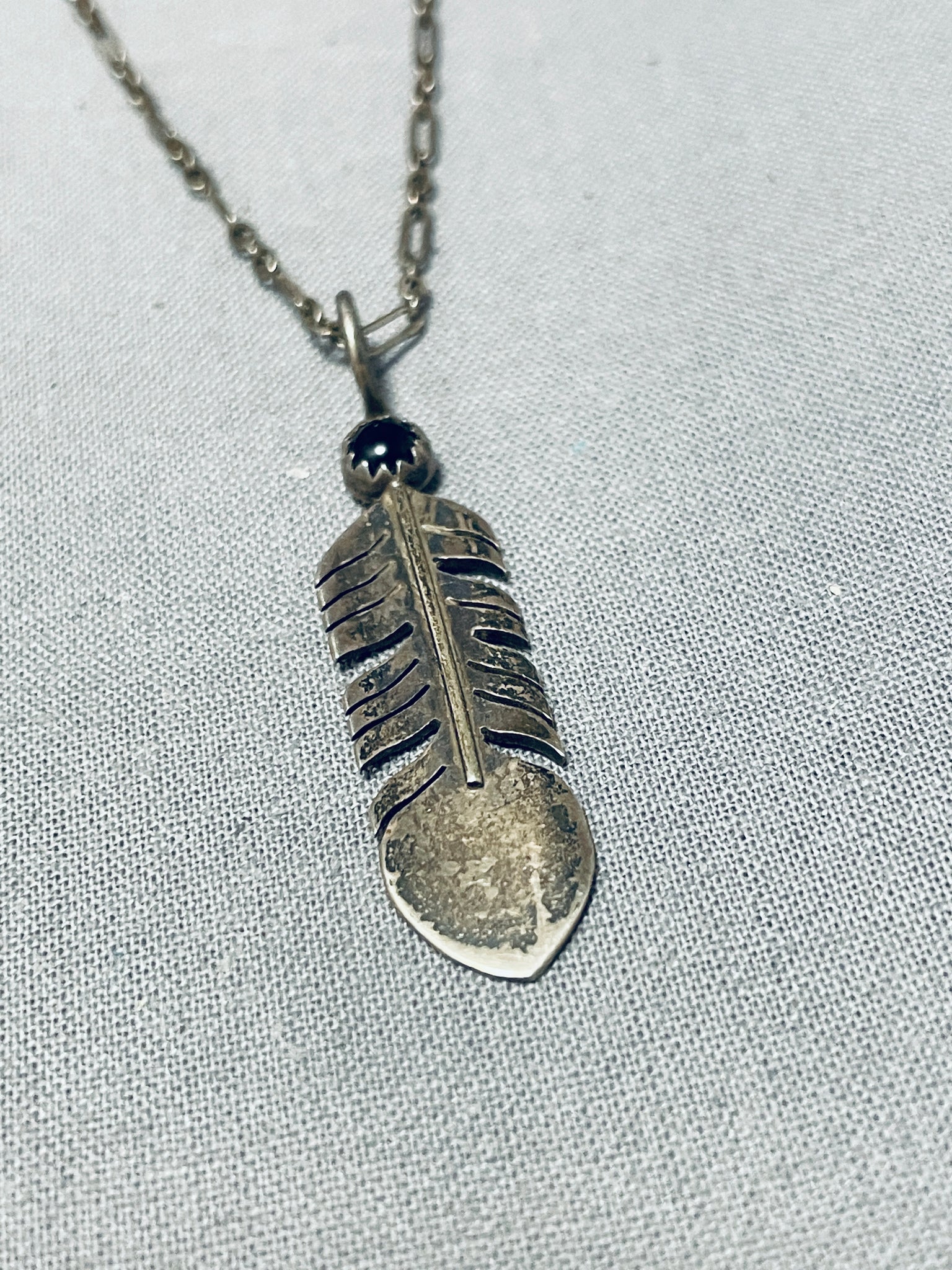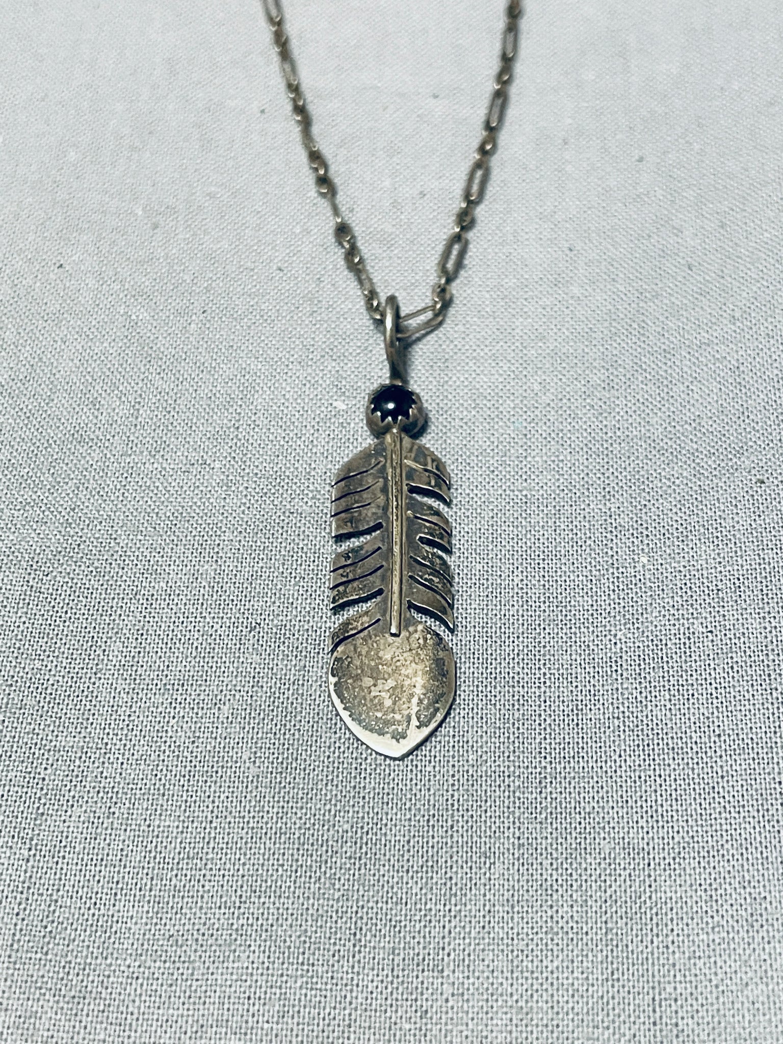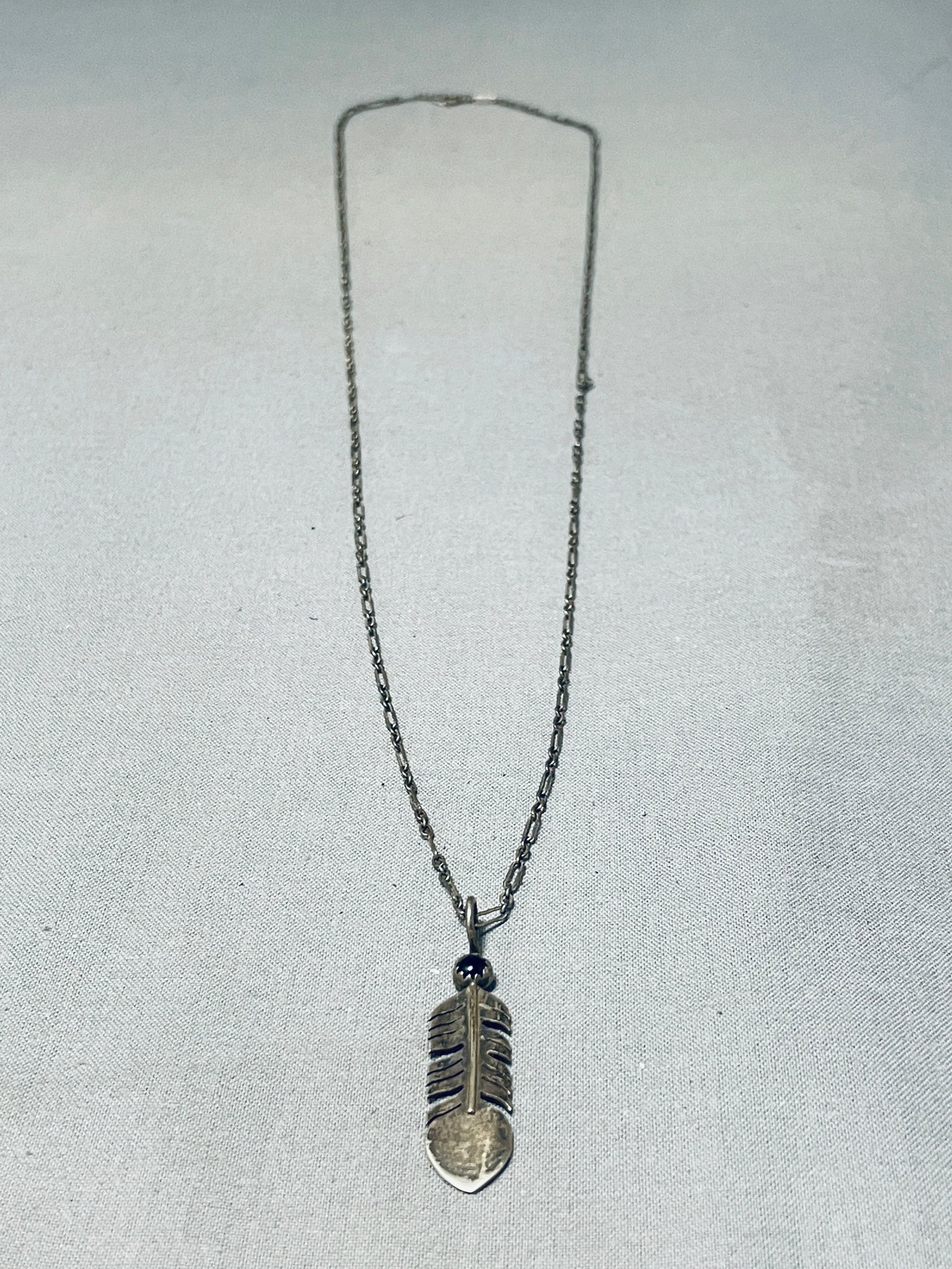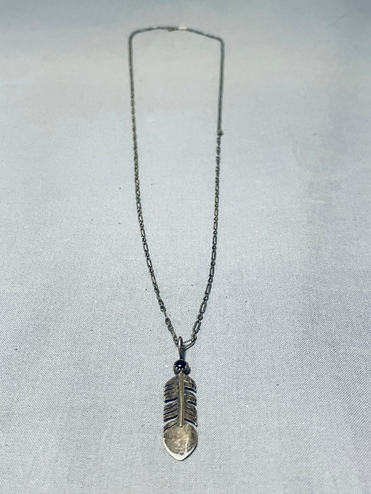 This is a wonderful vintage Navajo silver necklace. The pendant of this piece hosts a detailed feather with a 1/8" round jet stone at the top! Oh - and be sure to notice the beautiful handmade chain of the necklace! Sterling silver, marked. Signed by Navajo artist, JM. The length of the necklace measures around 29". Sturdy 4 grams.