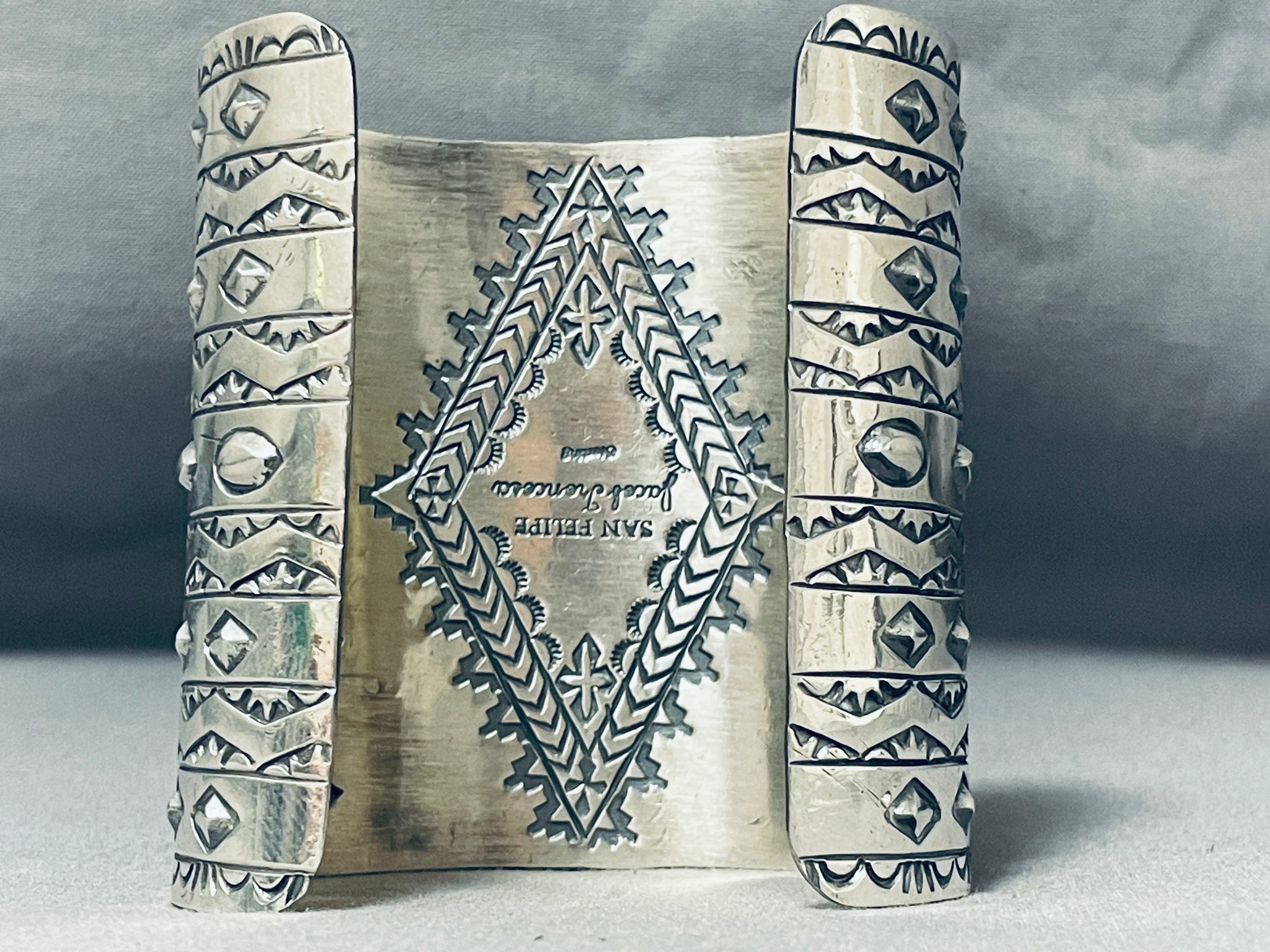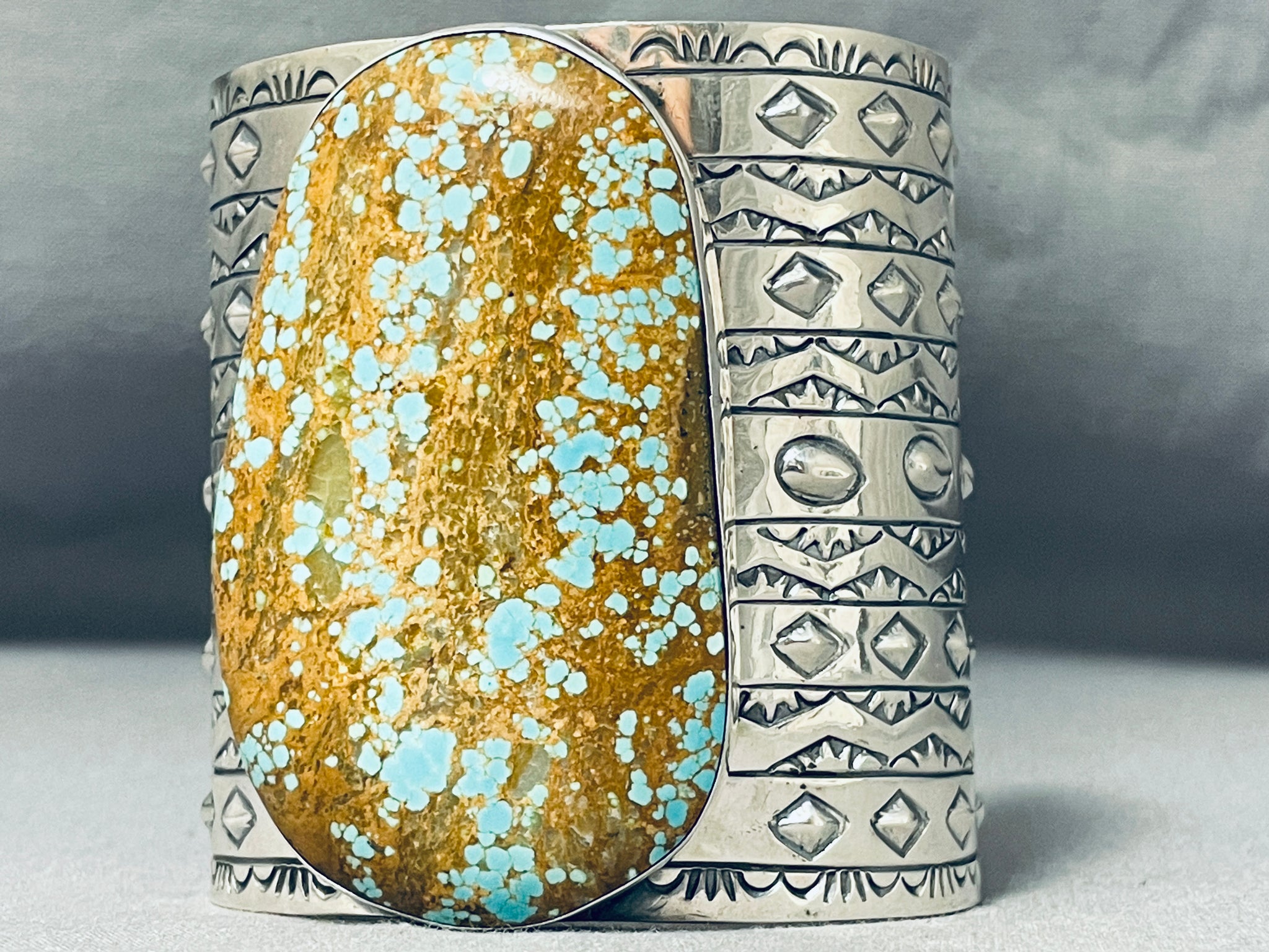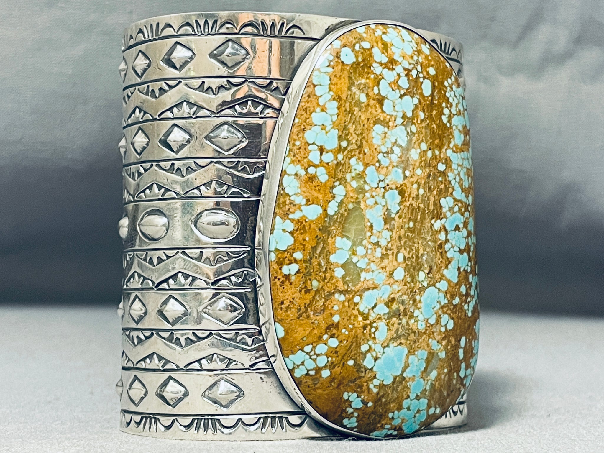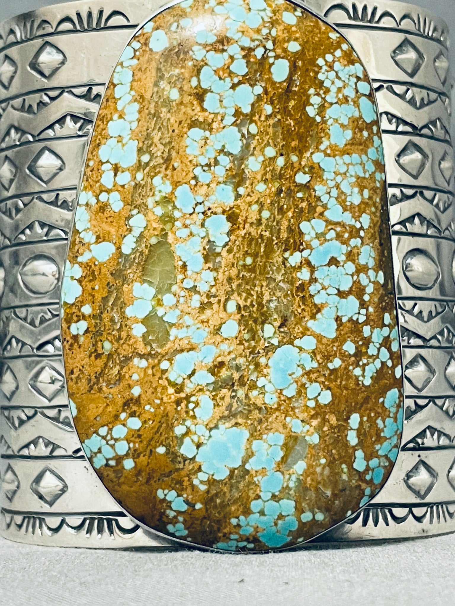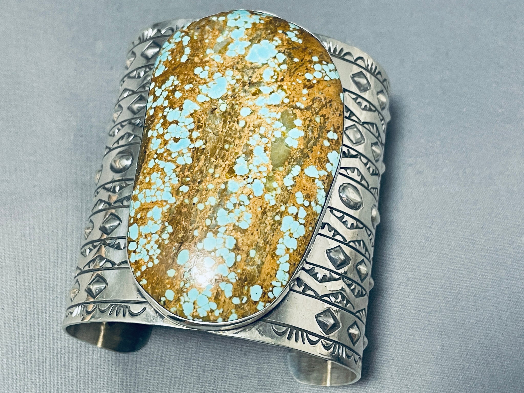 This is a tremendous Native American very large single stone wide silver cuff bracelet. This impressive bracelet contains one of the largest single Number 8 turquoise stones we have ever seen on a bracelet measuring a whopping 2-7/8" X 1-3/4". Running down both ends of the very wide silver cuff are incredible silver works that consist of plant works, wave works, line segments, teepee patterns and repoussed shells. I absolutely love the detailing on this bracelet. Even the inside of the cuff contains beautiful stampings that include pueblo patterns, teepee patterns and sun stampings. The width of the bracelet measures around 2-7/8". Signed by artist, Jake Troncosa. Sterling silver, marked. Cir. 1980's+. The inside end to end measures around 6" with an additional 1-1/2" gap. Sturdy 163 grams.