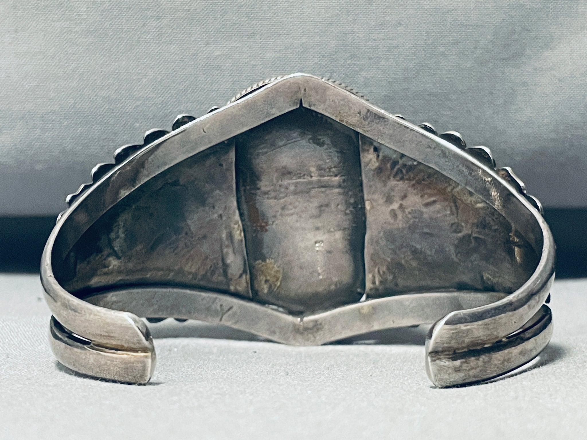 This is an astonishing vintage Navajo large single stone silver bracelet. This fascinating bracelet consists of a large fat teardrop shaped spiderweb turquoise stone. The size of the stone is just amazing and measures around 1-3/4" X 1-1/4". Surrounding the stone is a tightly coiled silver rope. Resting at the sides of the impressive silver bracelet are superior large sun bursting silver flanks. The large flanks are just outstanding. This bracelet contains a sturdy and thick double silver shank cuff that graduates in width towards the center. The width of the bracelet measures around 2". Signed by Navajo artist, Y. Sterling silver, marked. Cir. 1970's+. The inside end to end measures around 6-1/2" with an additional 1-1/4" gap. Sturdy 89 grams.