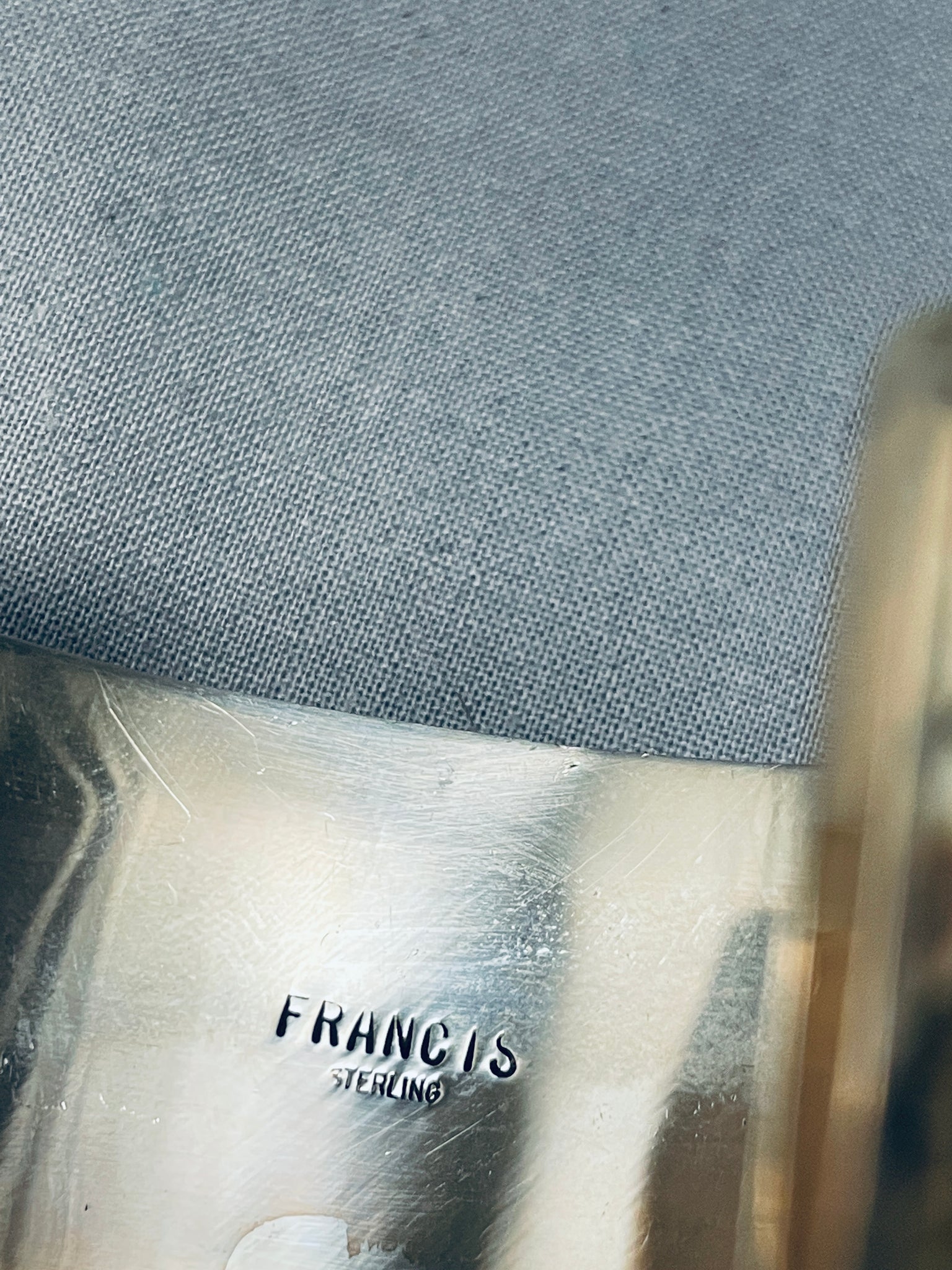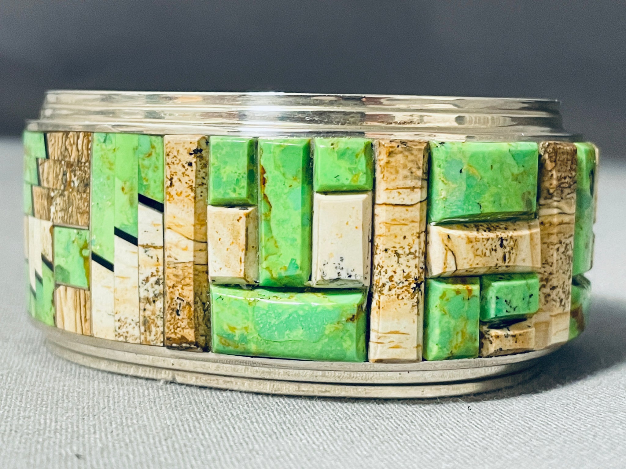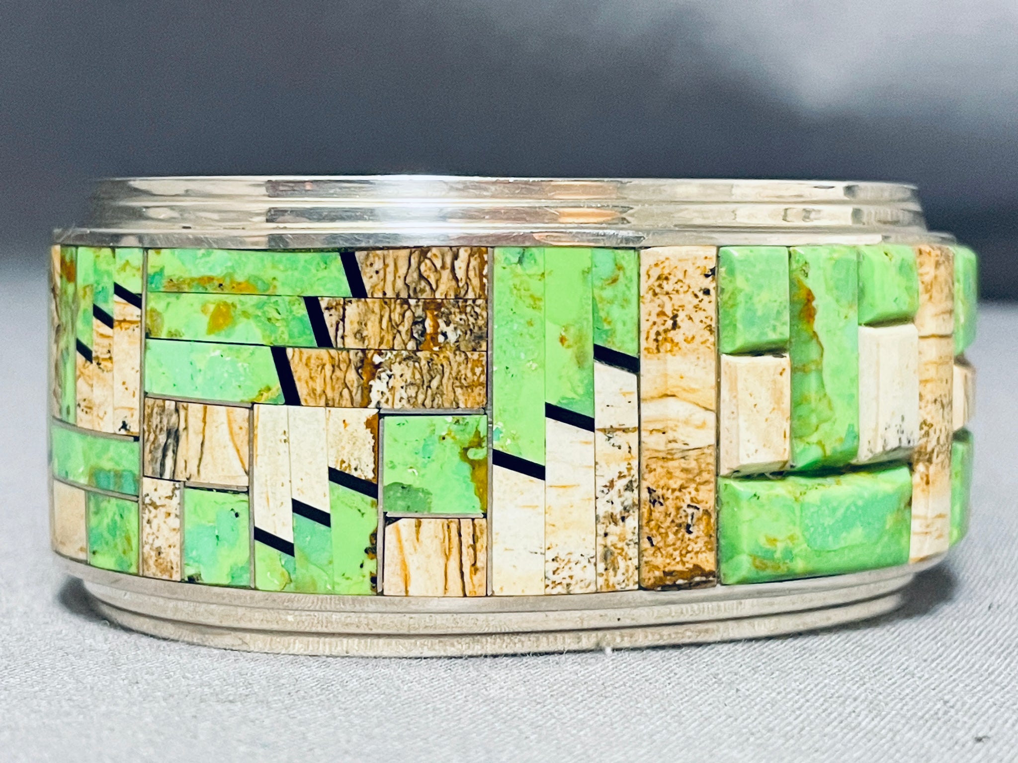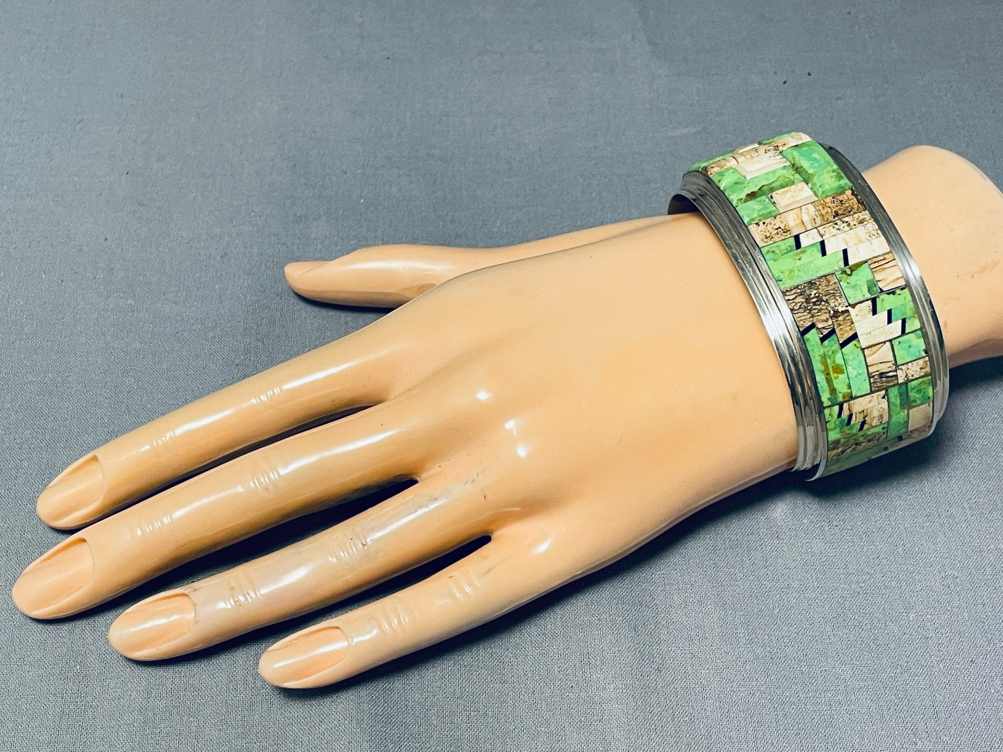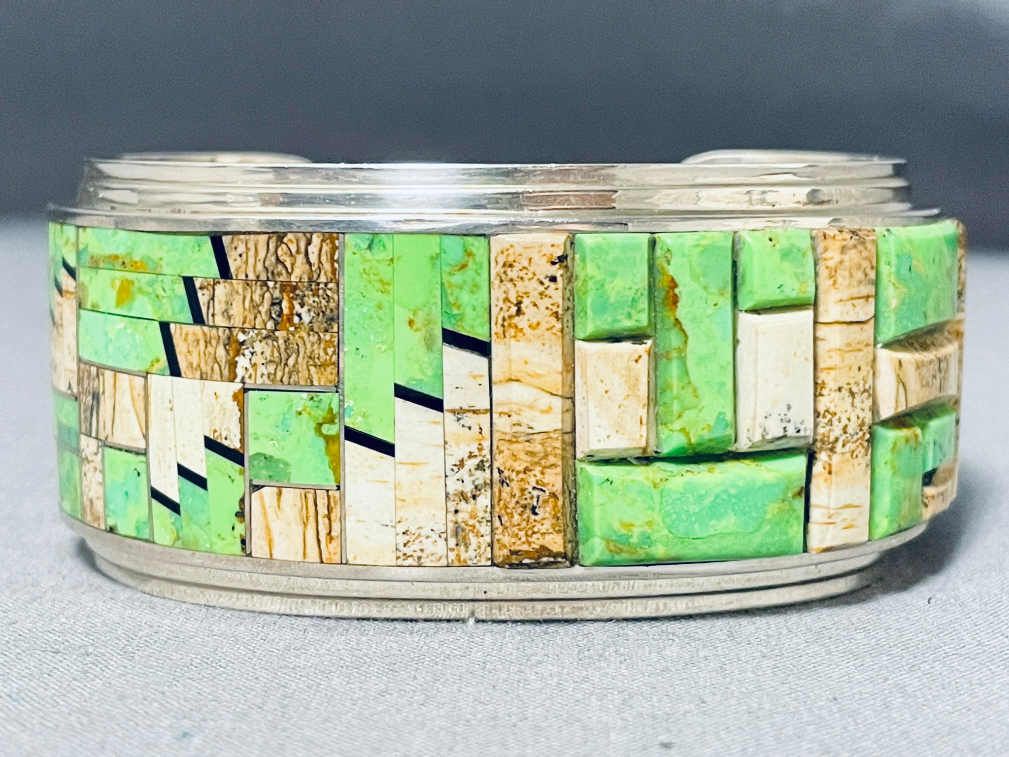 This is a fascinating Navajo very intricate inlaid silver cuff bracelet. This remarkable bracelet contains phenomenal inlay that consists of gaspeite, onyx and tan shell. I absolutely love how half of the cuffs inlay work protrudes out from the cuff giving the design a remarkable 3D look. I also love how the edges of the cuff contains stepping patterns that run from one end to the other. This bracelet is incredible. The width of the bracelet measures around 1-1/4". Signed by Navajo artist, Mel Francis. Sterling silver, marked. Cir. 1980's+. The inside end to end measures around 6" with an additional 1-1/4" gap. Sturdy 64 grams.
