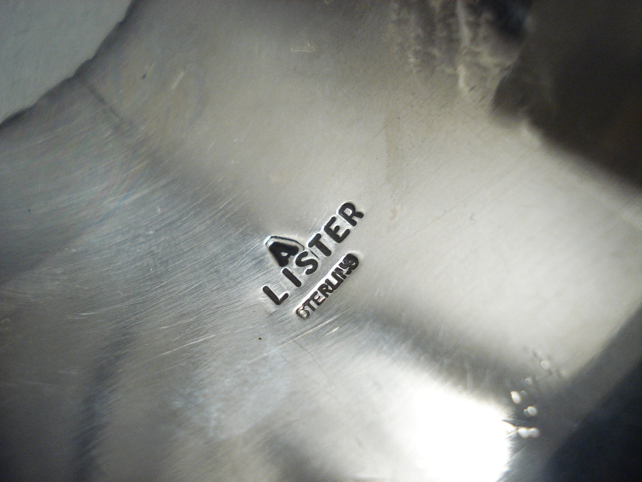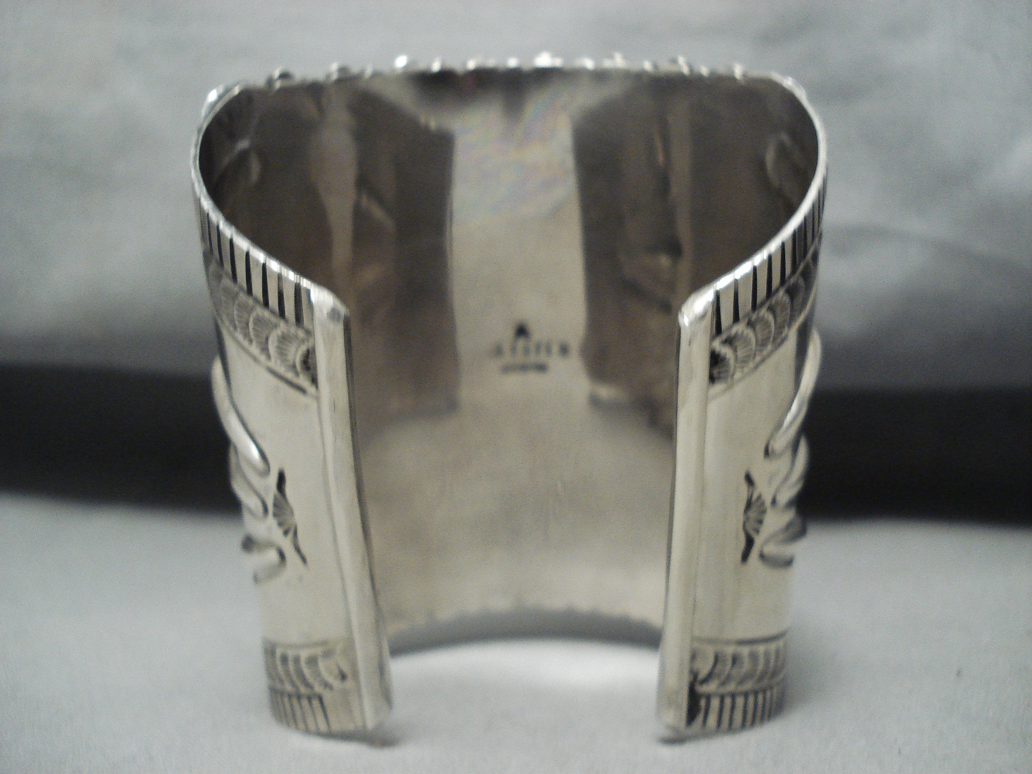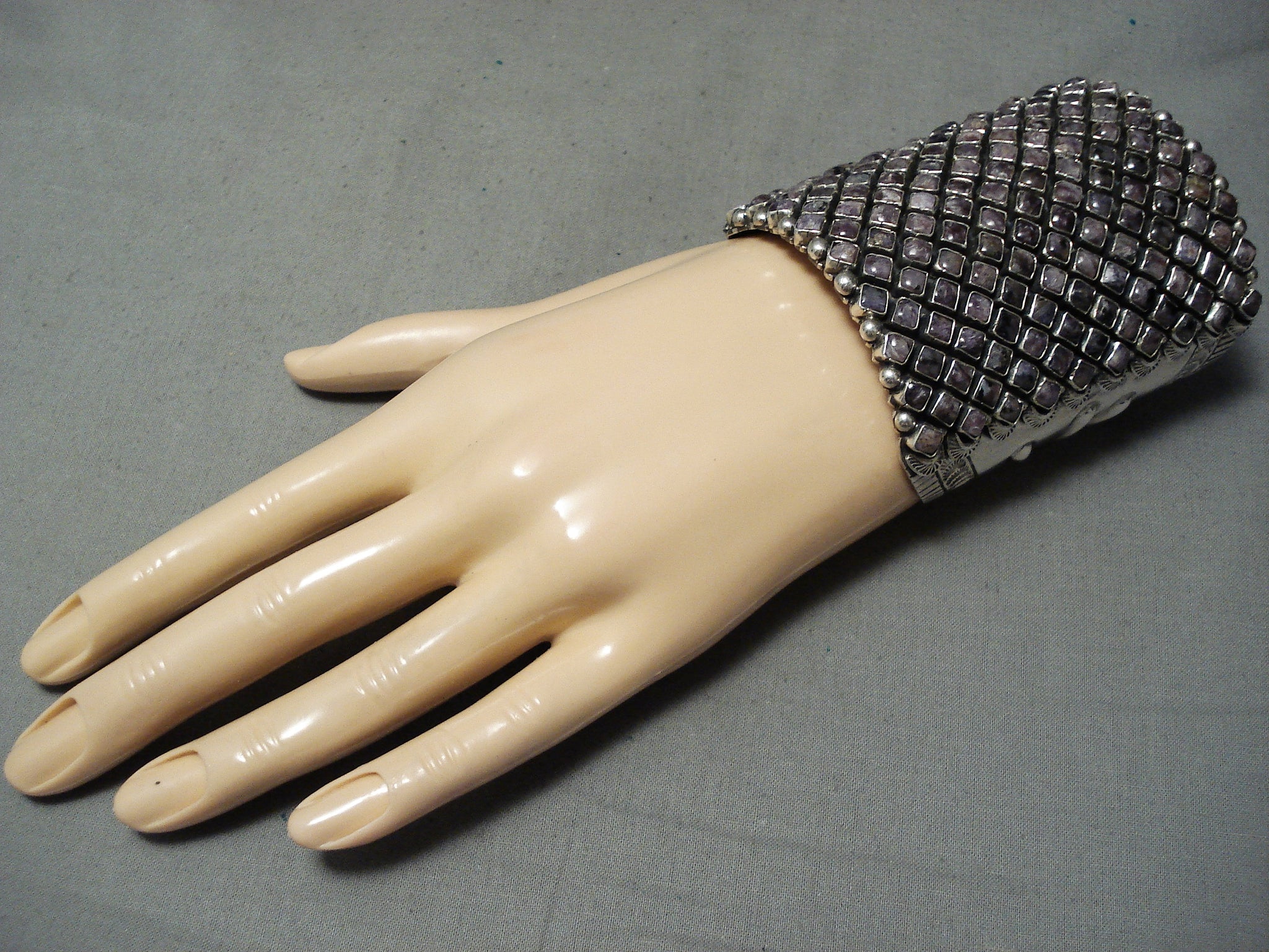 This is a breathtaking vintage Navajo huge and wide silver bracelet handmade by the famous artist, Alice Lister. This phenomenal bracelet contains 19 impeccable rows of beautiful purple sugulite stones. Bordering the edges of the cuff by the stones are superior silver raindrops. Resting at the sides of the cuff are amazing handmade silver fans. Running down both ends of the cuff are incredible channel works with accenting sun stampings and repoussed shells. The stones measure around 3/16" x 3/16". The width of the bracelet measures around 3". Signed by Navajo artist, Alice Lister . Sterling silver, marked. The inside end to end measures around 5-1/2" with an additional 1" gap. Sturdy 157 grams.