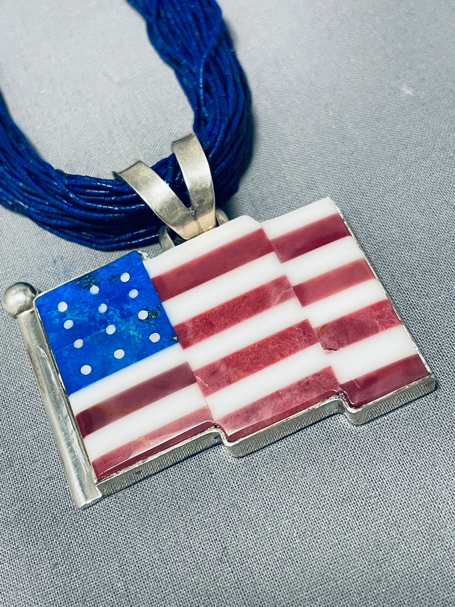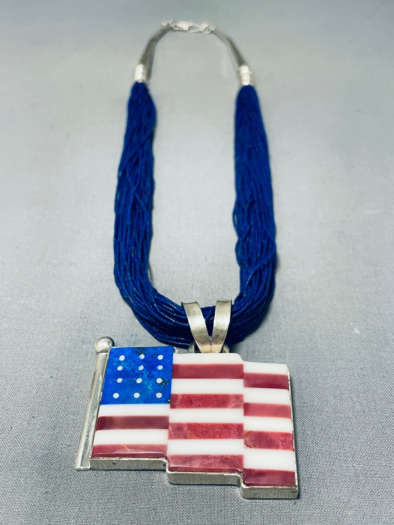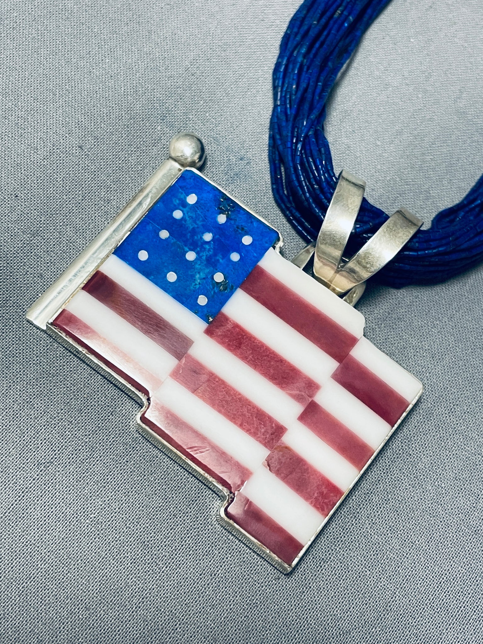 The most intricate lapis heishi we have ever seen on a Navajo necklace, very important. This is a tremendous Navajo inlaid American flag silver pendant necklace. This necklace is absolutely impeccable not only because it consists of a very detailing and intricate inlaid American flag but also because it contains 50 fabulous strands,YES 50 STRANDS of phenomenal hand cut precise lapis stones. Resting at the ends of the incredible necklace are round silver beads, long fluted silver cones and a traditional silver clasp. The detailing of this necklace is absolutely mind blowing. Resting at the bottom is a superior hand inlaid American flag that consists of coral, mother of pearl and lapis. The pendant measures around 2-1/4" X 2-1/4" including the bail. Sterling silver, marked.. Signed by Navajo artist, Cal Desson (top 5 inlayers). The length of the necklace measures around 27". Sturdy 86 grams.