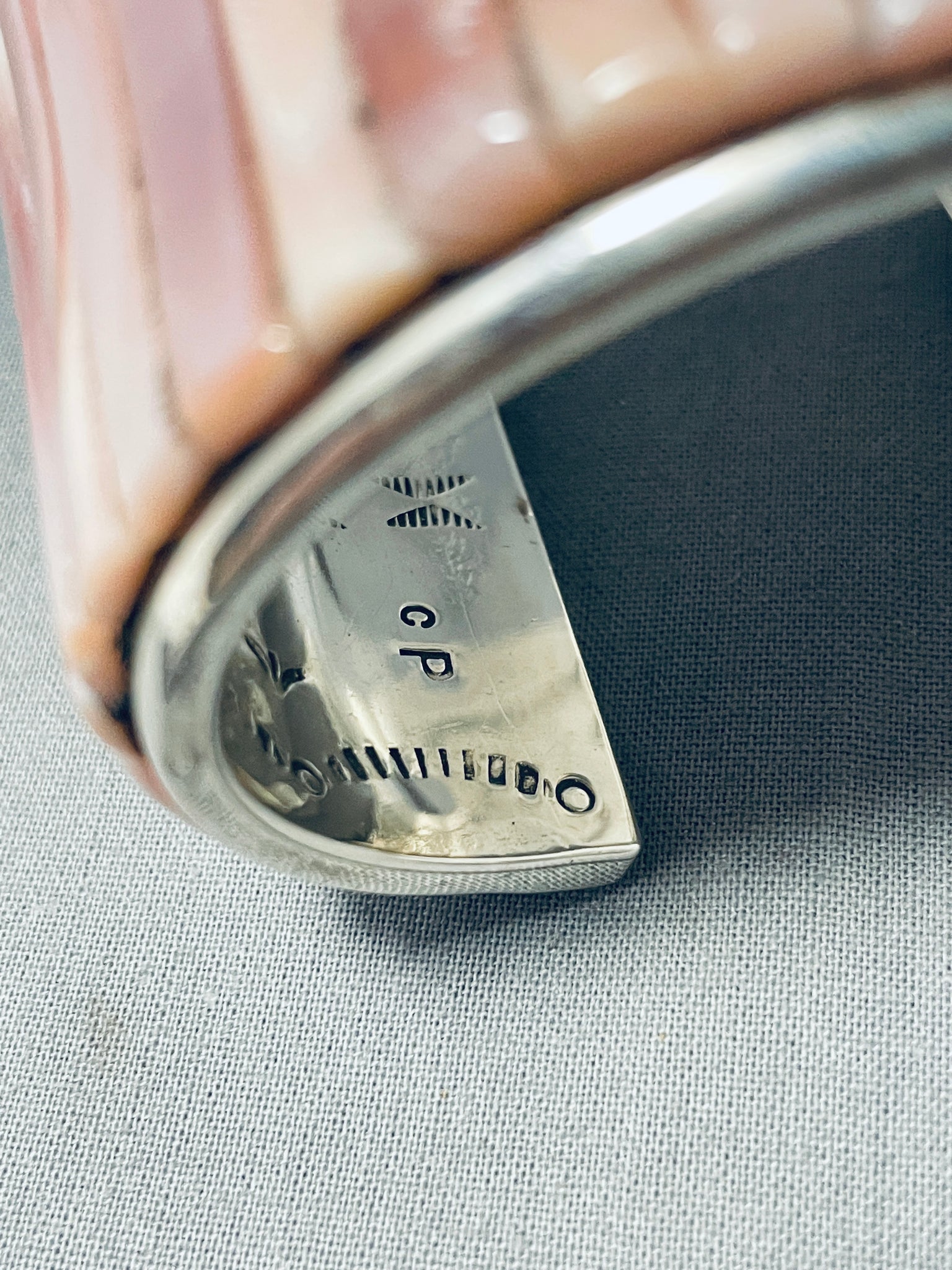This is a fabulous Navajo bracelet featuring rows of pink mother of pearl stones on a solid silver cuff with handstampings along the inside! The stones measure around 1-1/2" x 1/4". The width of the bracelet measures around 1-5/8". Signed by Navajo artist, CP. Sterling silver, marked. The inside end to end measures around 5" with an additional 1" gap. Sturdy 125 grams.