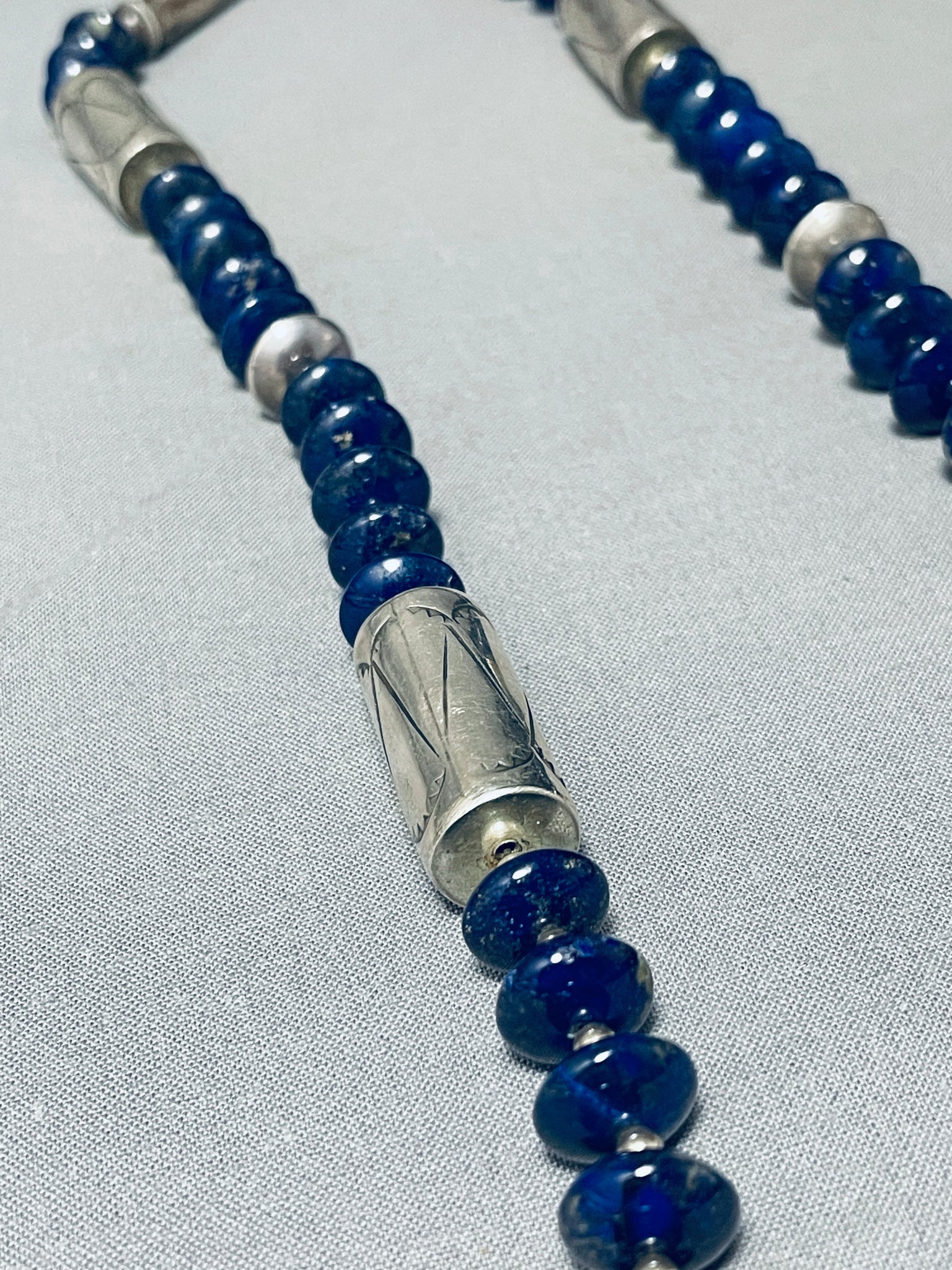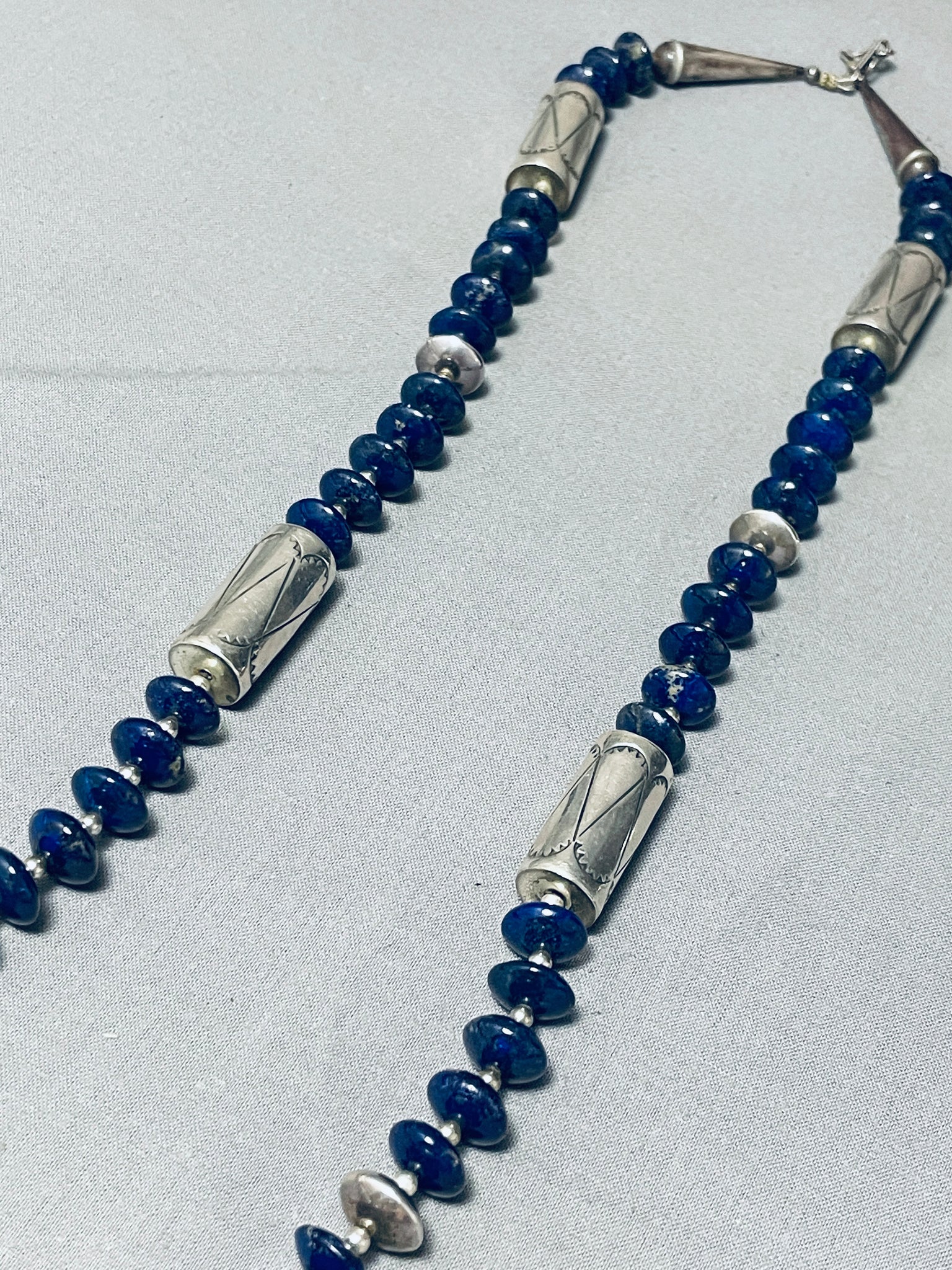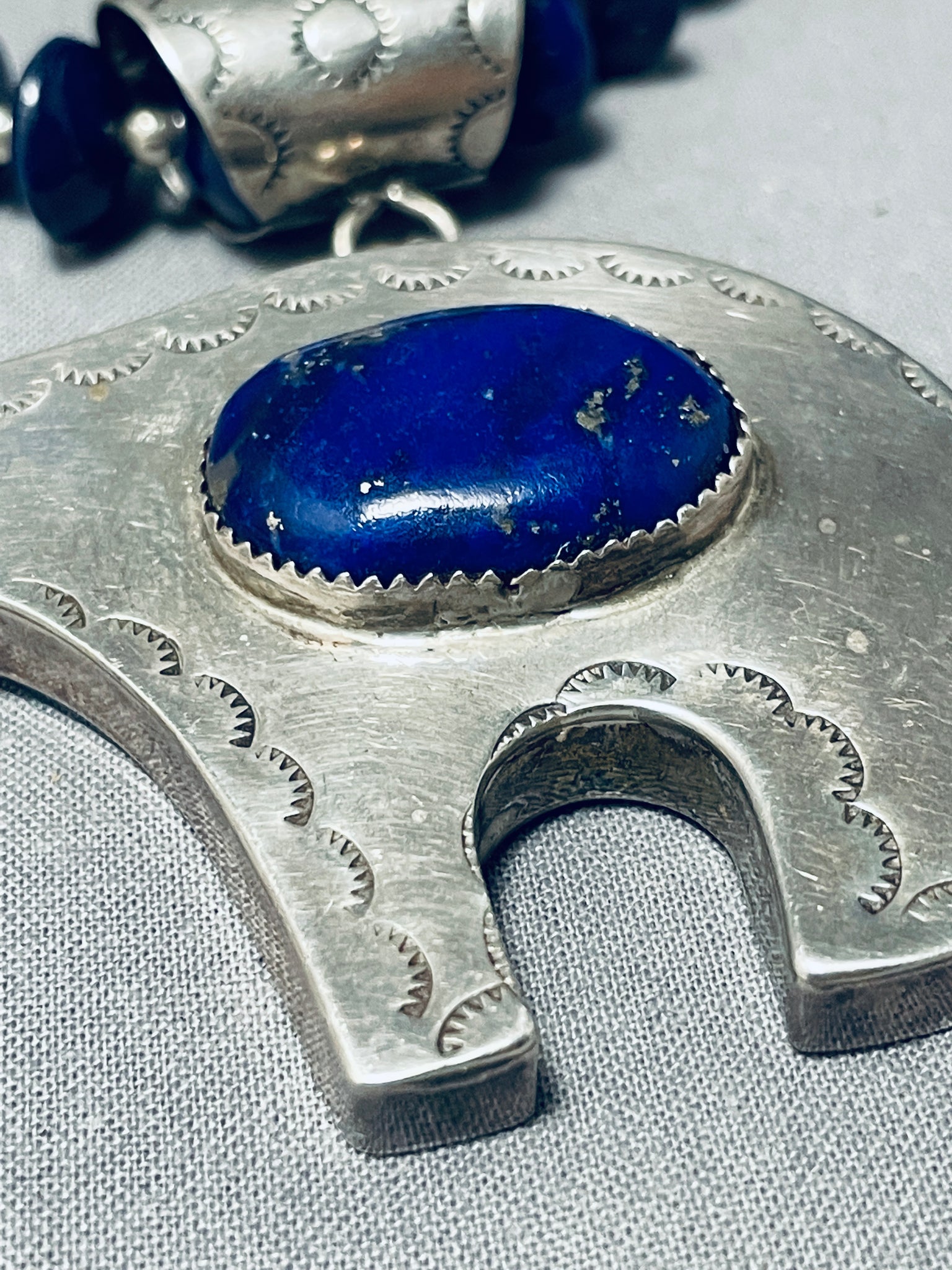 This is a magnificent Navajo lapis and silver huge pendant necklace. This museum quality piece contains a marvelous bottom thick silver pendant that measures around 3" X 2-1/4" including the large silver bail. I absolutely love all of the impeccable disc shaped lapis stones that rest throughout the entire necklace. Situated throughout the lapis stones are incredible round silver beads and even disc shaped silver beads. Located throughout the lapis and silver beads are large phenomenal silver drum beads with accenting balloon patterns. Resting at the ends are stunning silver cones with a traditional silver clasp. Even on the bottom silver pendant is a large dome shaped lapis stone that measures around 1" X 5/8". I absolutely love the intricacy and detailing this necklace contains. Sterling silver. Cir. 1970's+. Signed by Navajo artist, Matt C. The length of the necklace measures around 31". Sturdy 123 grams.