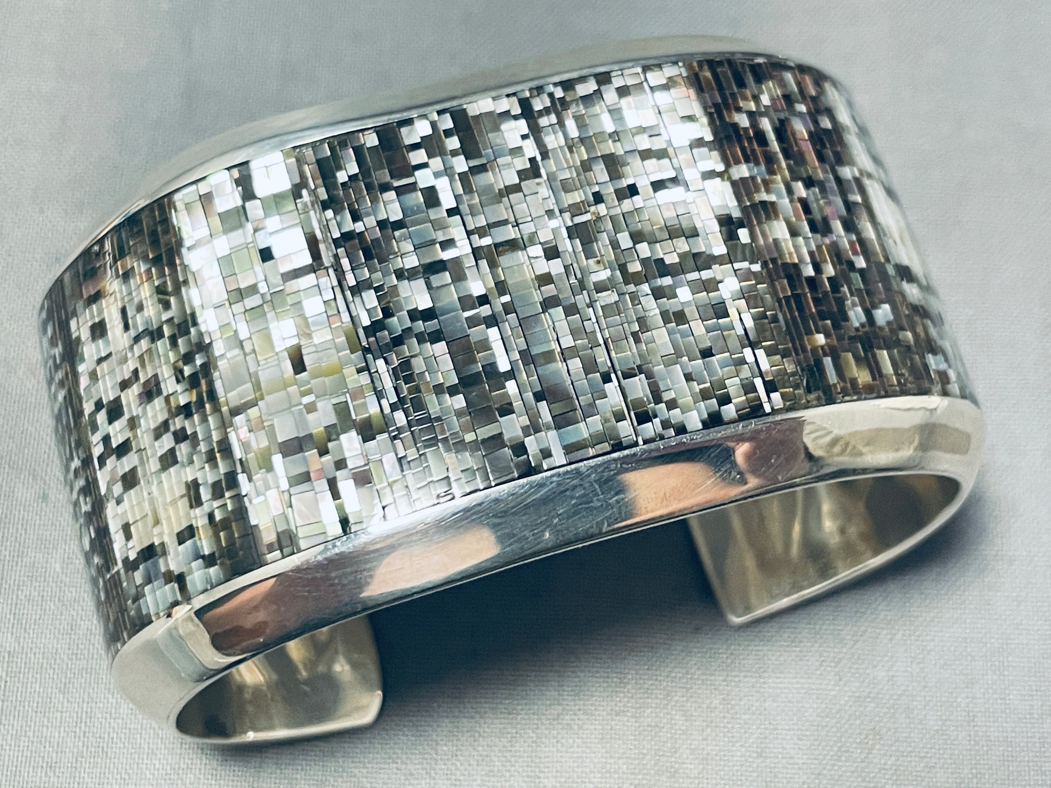 Notice how each and every square was hand cut and hand placed, the best! This is an impressive Zuni inlaid thick and sturdy silver cuff bracelet. This phenomenal bracelet contains amazing and very intricate inlaid stones and shells that inlcude brown shells and mother of pearl. The way the stones and shells are intricately situated throughout the cuff is just spectacular and so precise and detailed. This bracelet is very thick and sturdy. The width of the bracelet measures around 1-3/8". Signed by Zuni artist, Colin Coonsis. Sterling silver. Cir. 1980's+. The inside end to end measures around 5-1/4" with an additional 1" gap. Sturdy 78 grams.