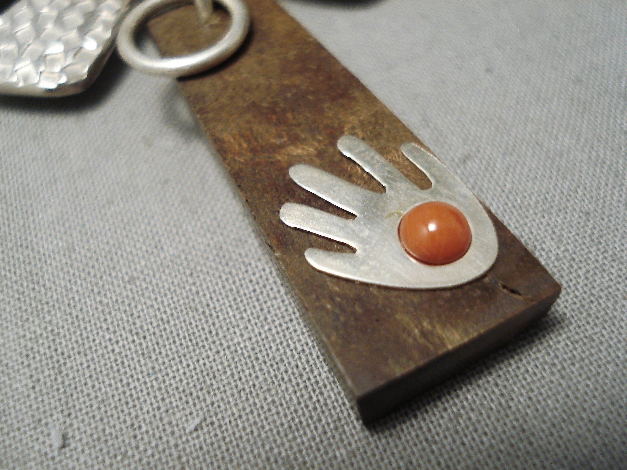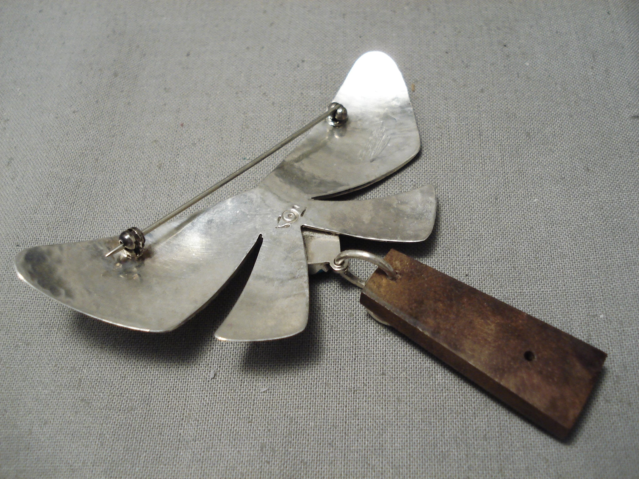 We are proud to offer this unique vintage Navajo silver pin. Wonderful peaceful symbolism here with this piece! At the heart of this lovely butterfly sets a striking turquoise stone. Then also from mother earth, dangling below we have a silver circle of life and a wooden trapezoid with a silver hand. And upon the hand is the beautifully contrasting bright red coral stone. Very nice! The center stone measures around 3/4" x 3/8". Sterling silver. Signed by Navajo artist, Natasha Peshlakai208. The pin measures around 3" x 2-3/4". Sturdy 18 grams.