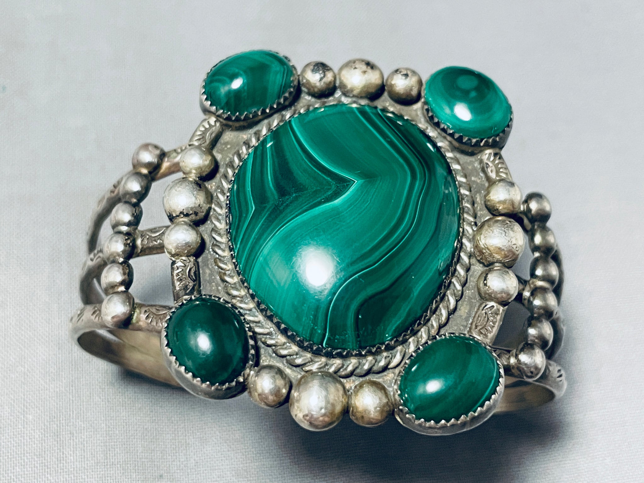 This is an exceptional vintage Navajo five stone silver bracelet. This amazing bracelet contains five outstanding large malachite stones with the center being the largest. Accenting the stones are marvelous large handmade silver raindrops with accenting sun stampings and a thick silver rope. This bracelet includes a wonderful thick and sturdy triple silver shank cuff that graduates in width towards the center. Resting at the sides of the cuff are curved silver raindrop flanks. The height at the center of the bracelet measures around 1-3/4" and the width at the center of the triple silver shank cuff measures around 1-1/4". The center stone measures around 1-1/4" x 1". Sterling silver. Cir. Mid century . The inside end to end measures around 5-1/4" with an additional 1" gap. Sturdy 50 grams.