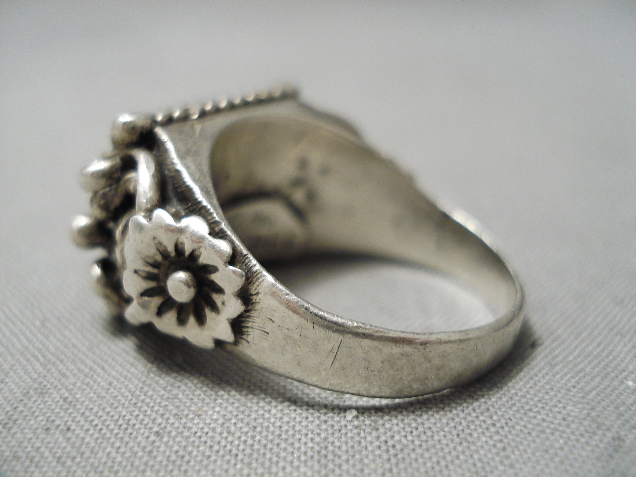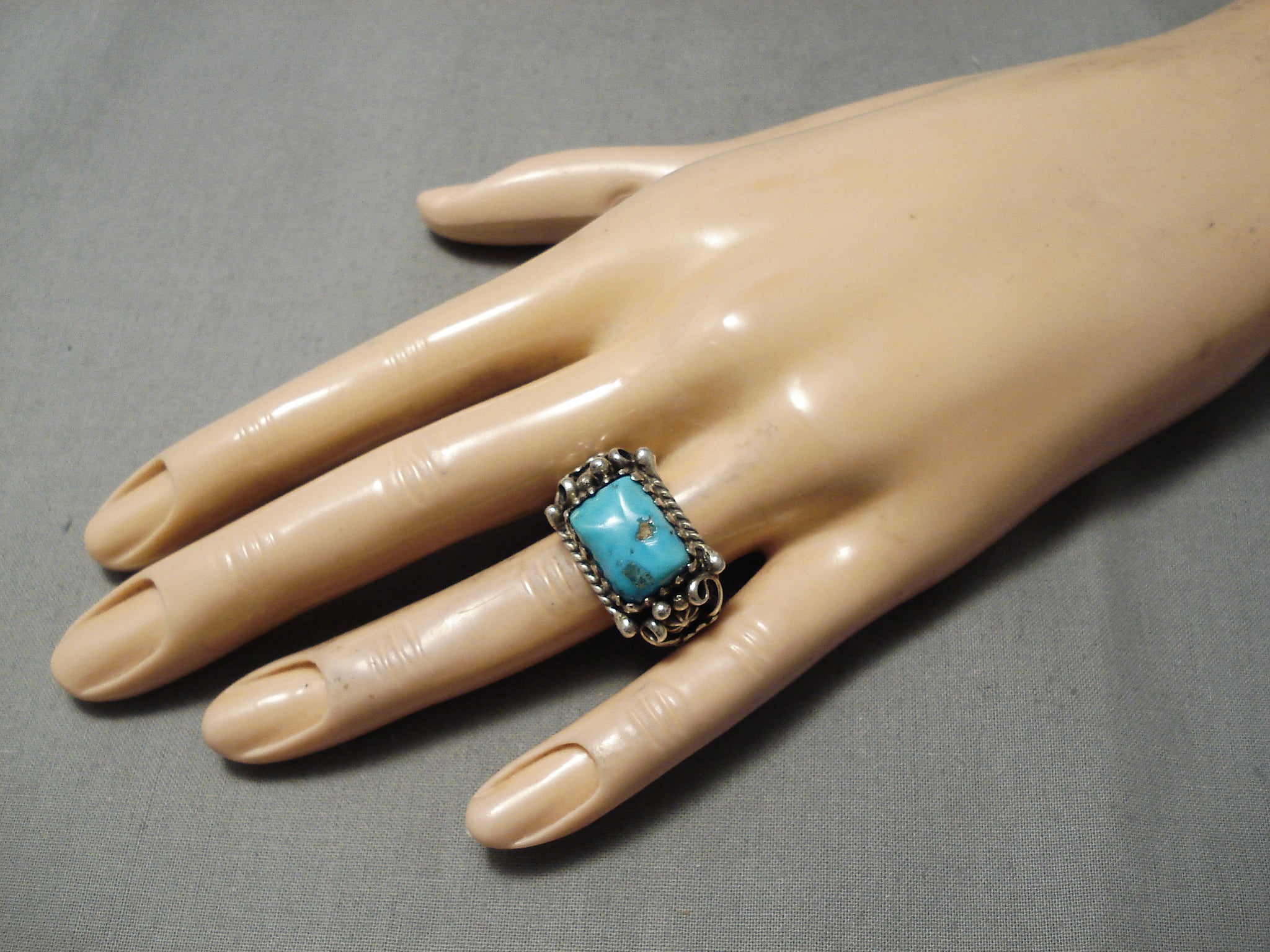 This is a magnificent vintage Navajo single stone silver ring. This ring is very heavy and thick and consists of remarkable silver works. The silver works consist of ropes, raindrops, swirling stems, shells and flowers. The center turquoise stone appears to be from the old Sleeping Beauty turquoise mine. The center stone measures around 1/2" x 3/8". The ring face measures around 5/8" x 1". Signed by Navajo artist, LT Chee. The ring size is around 10.5. Cir. 1970's+. Sterling silver, marked. Sturdy 16 grams.