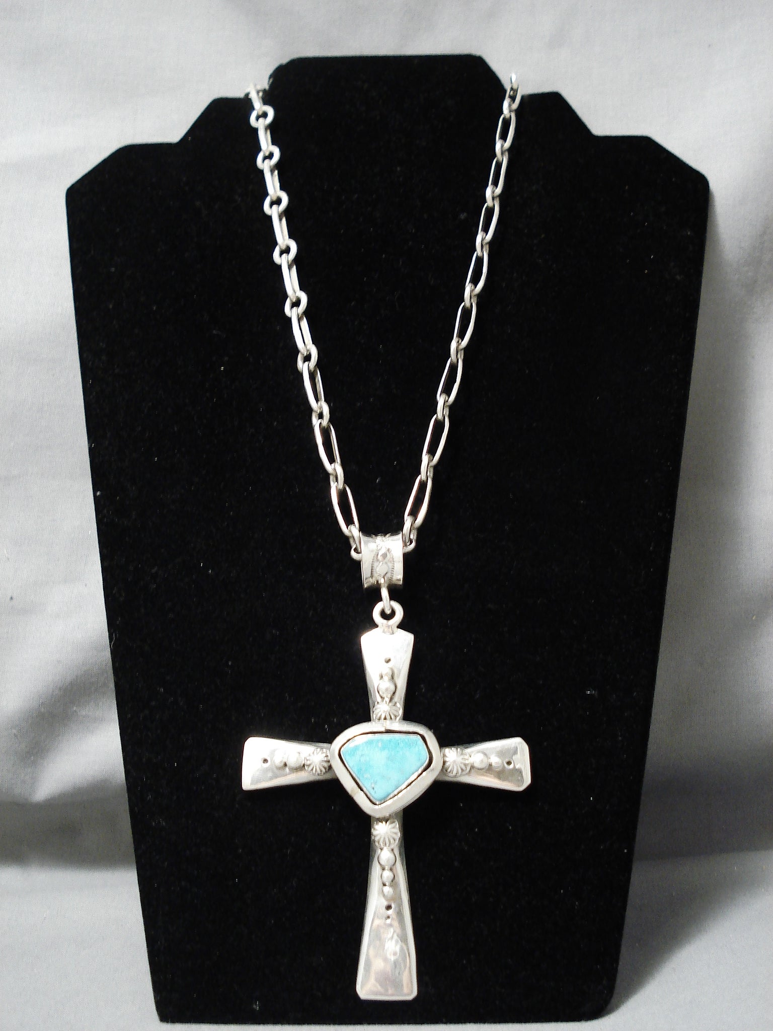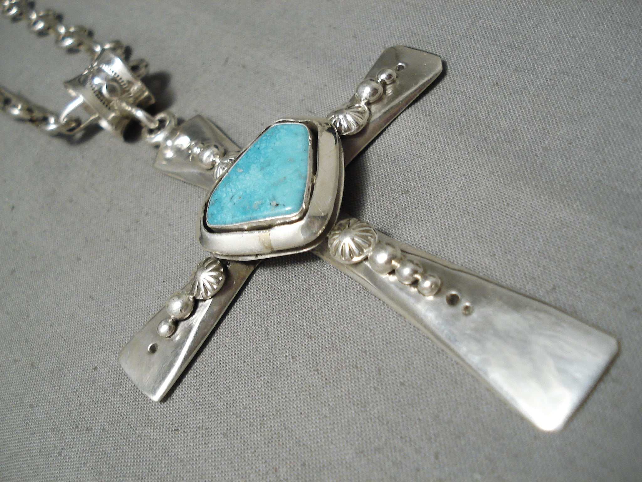 Thick Heavy Sturdy Native American Navajo Sterling Silver Turquoise Cross Necklace