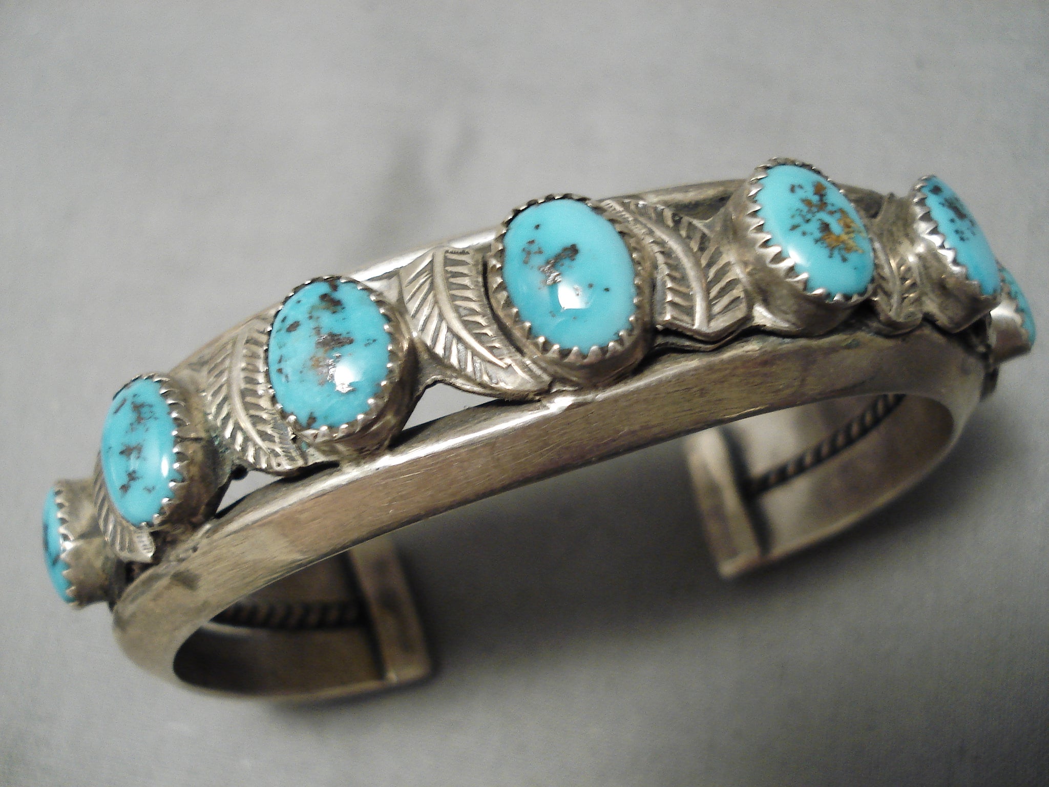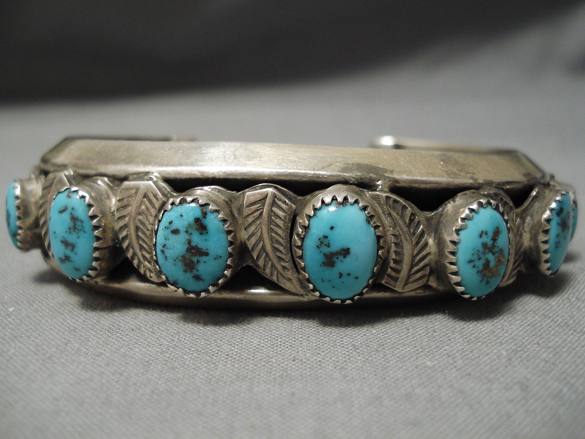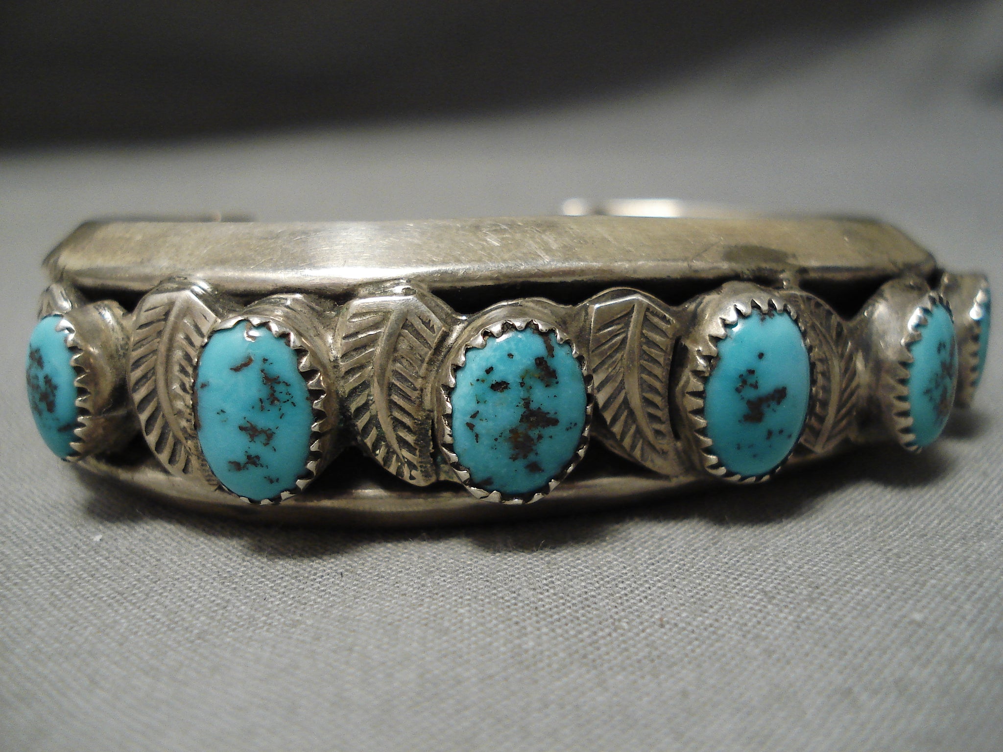 Thick Heavy Vintage Native American Navajo Turquoise Sterling Silver Leaf Bracelet Old