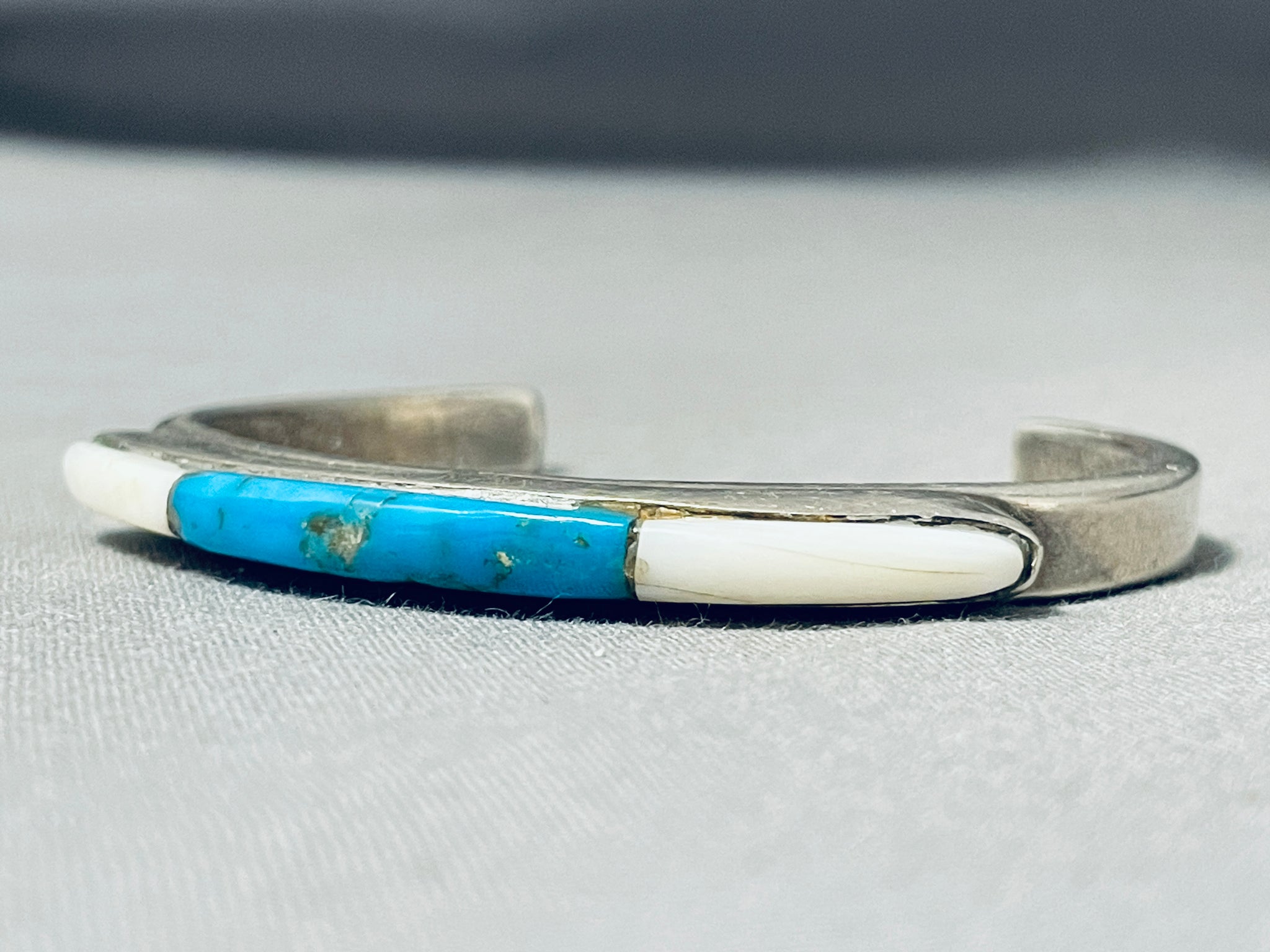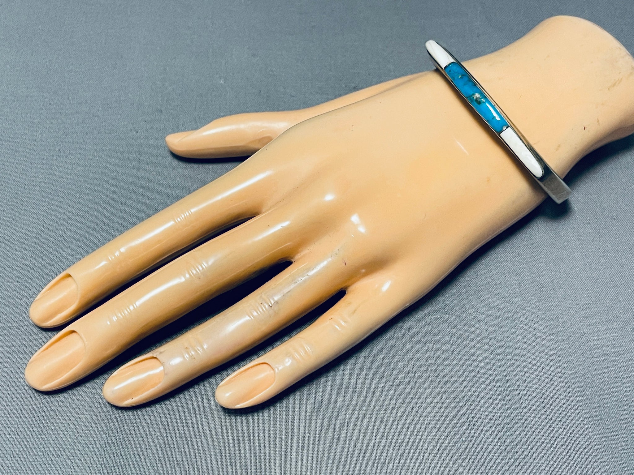 Thick Vintage Native American Navajo Turquoise Inlay Sterling Silver Inlay Bracelet