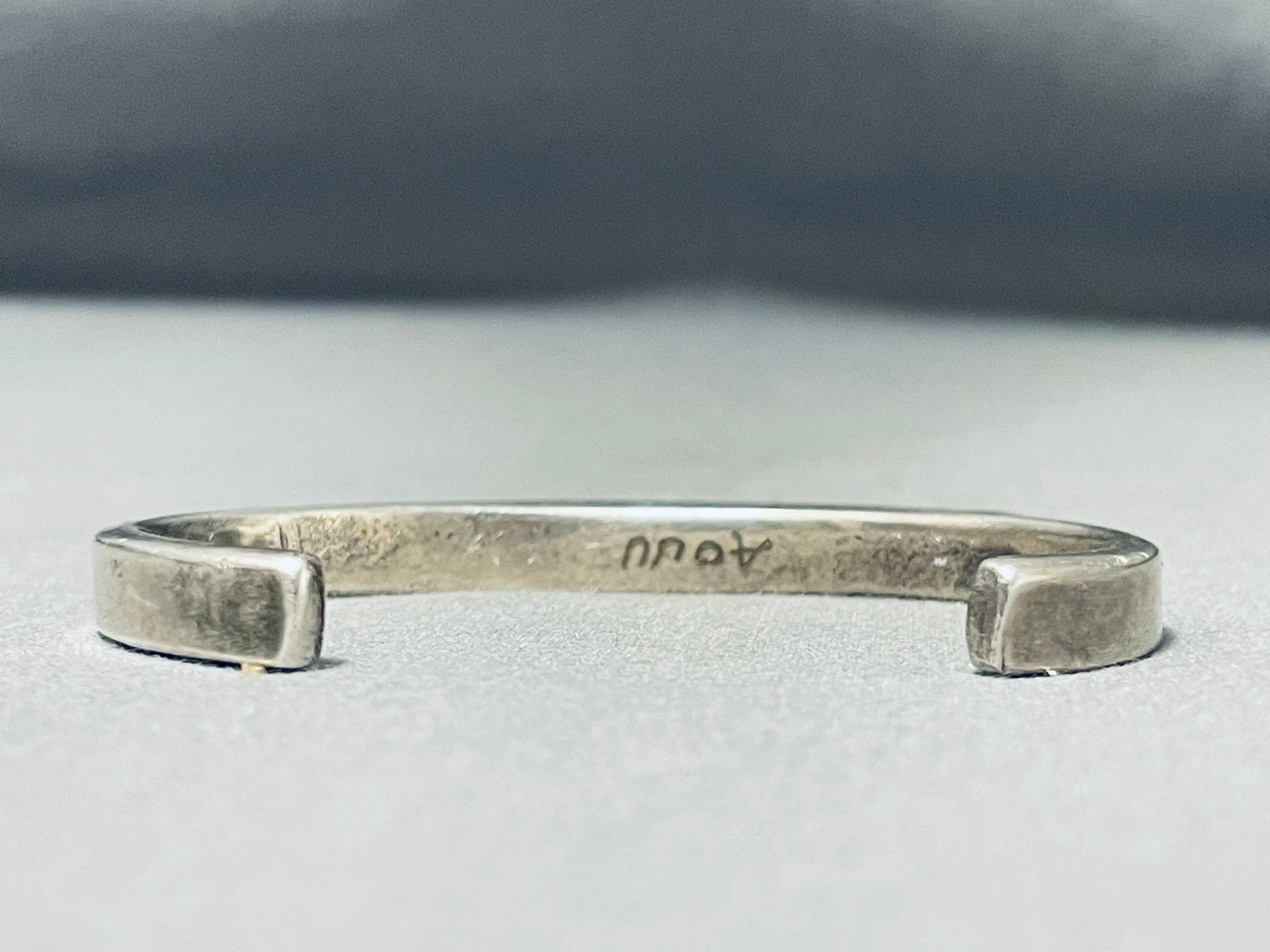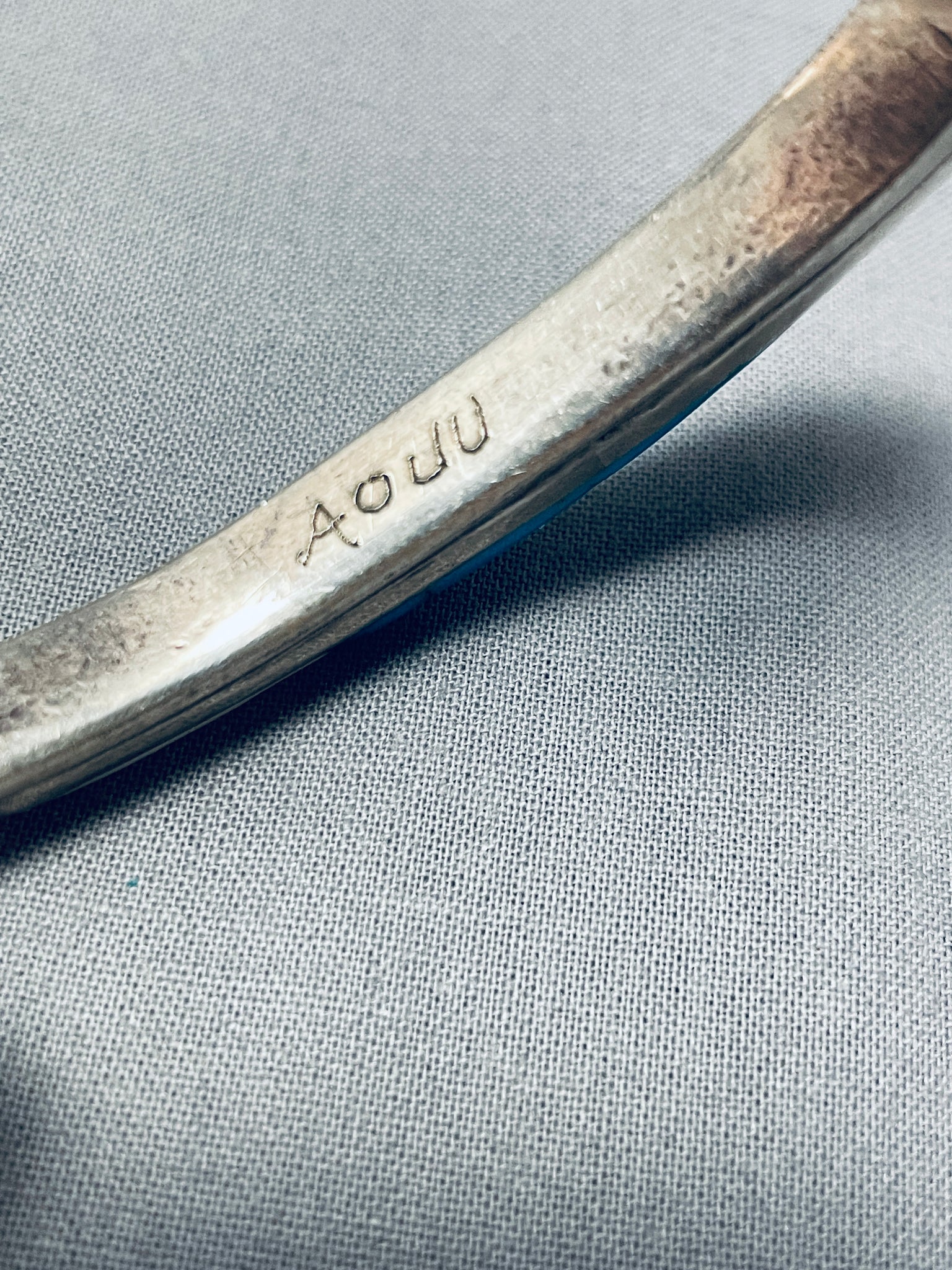This is a marvelous vintage Navajo inlaid thick silver cuff bracelet. This amazing bracelet contains three protruding inlaid sections that consist of two accenting mother of pearl shells and a center blue turquoise stone. The center blue turquoise measures around 1" X 3/16". I love how the center of the cuff is extra thick measuring around 1/2". The width of the bracelet measures around 1/4". Signed by Navajo artist, AOUU. Sterling silver. Cir. 1970's+. The inside end to end measures around 5-1/4" with an additional 1-1/2" gap. Sturdy 35 grams.