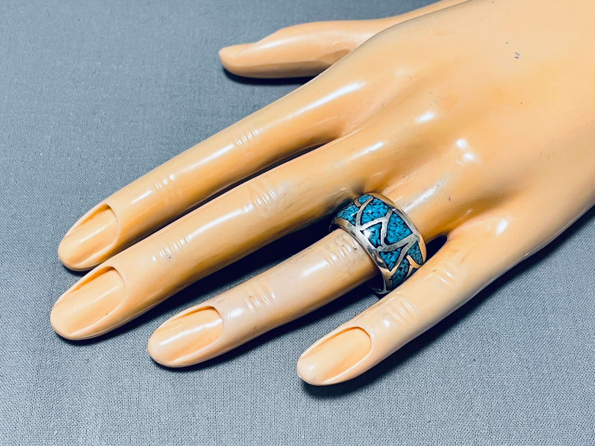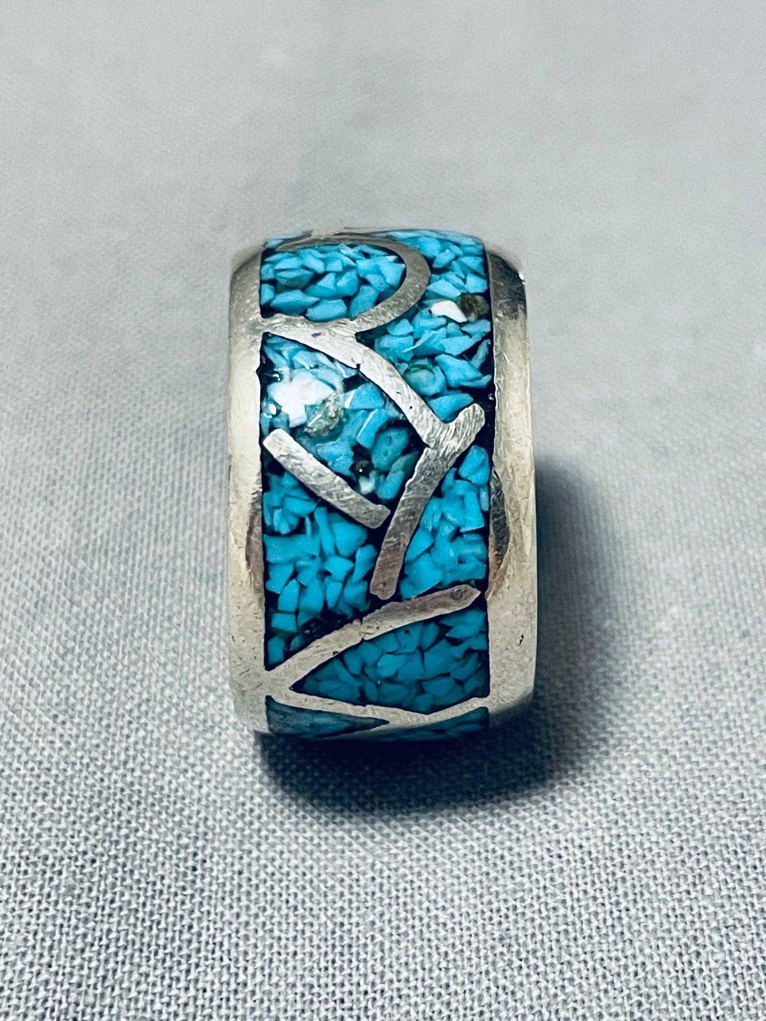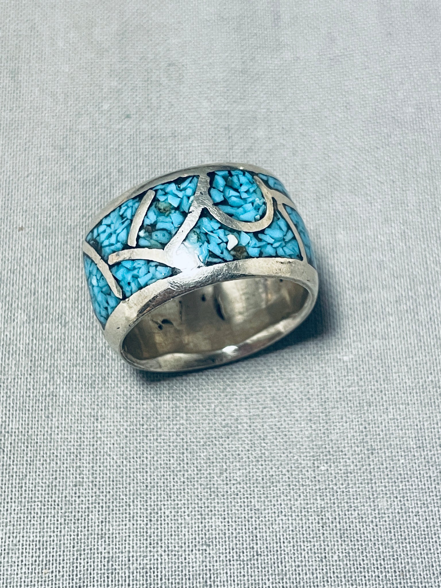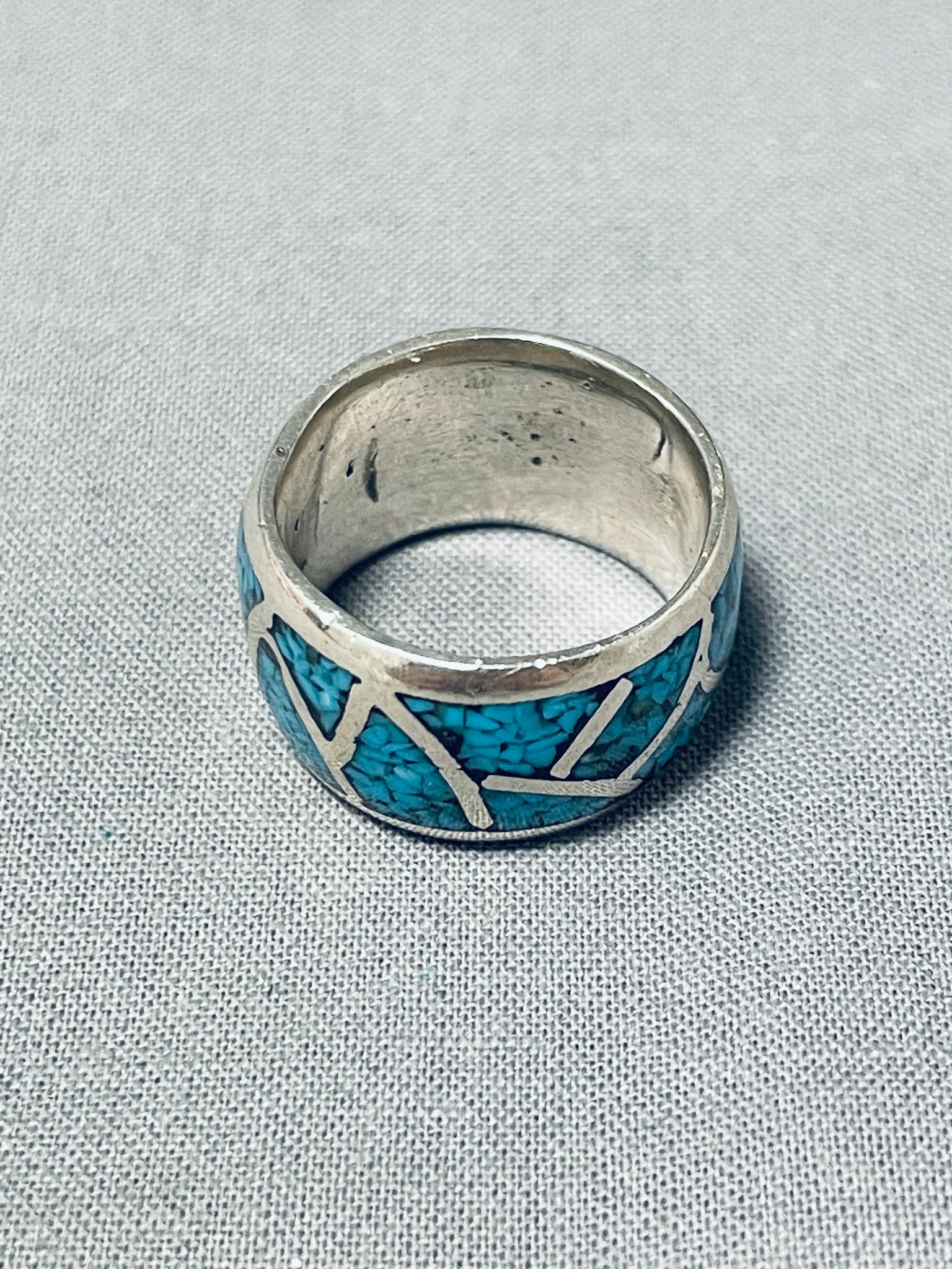 Thick Vintage Native American Navajo Turquoise Inlay Sterling Silver Ring Old