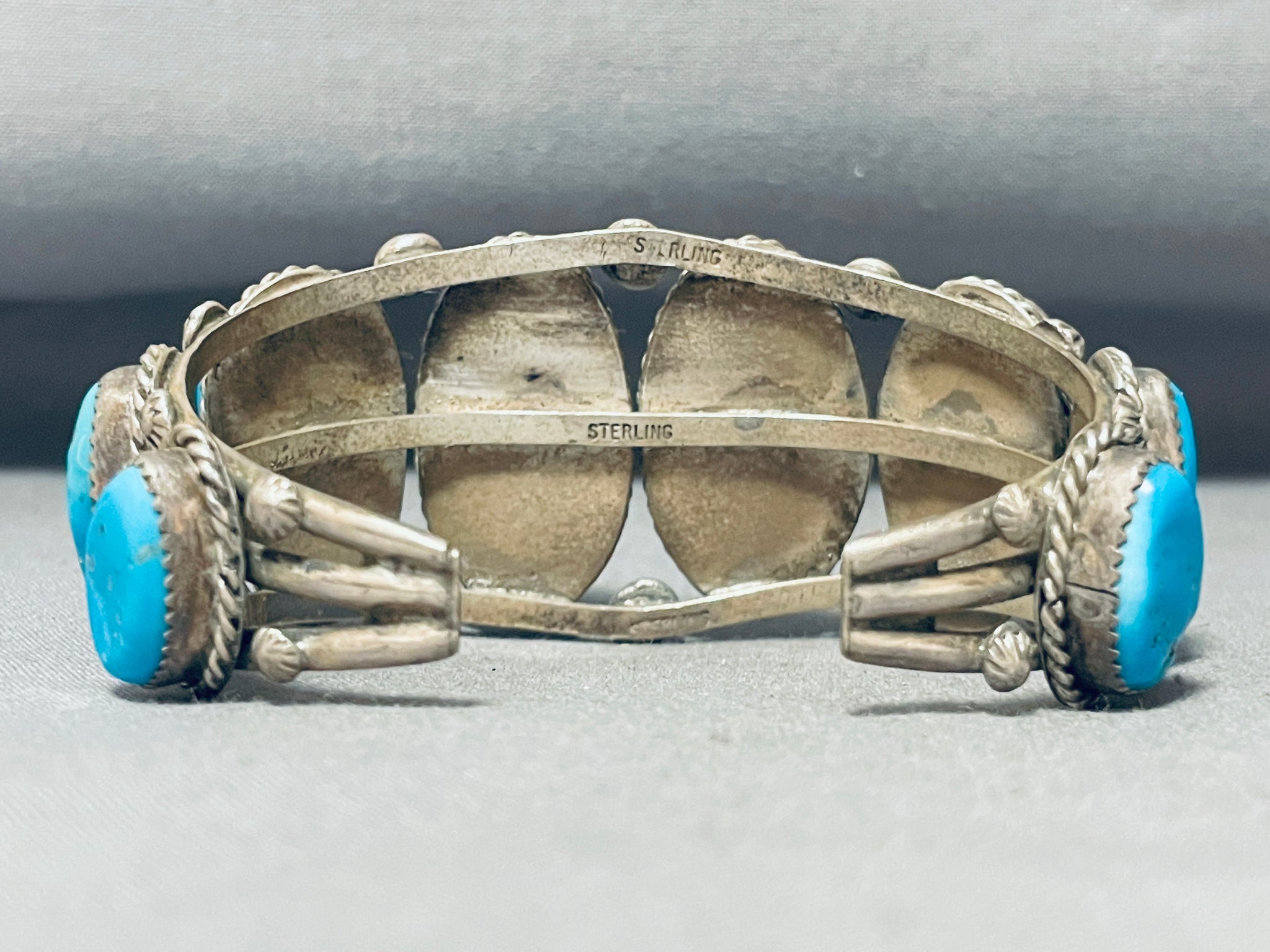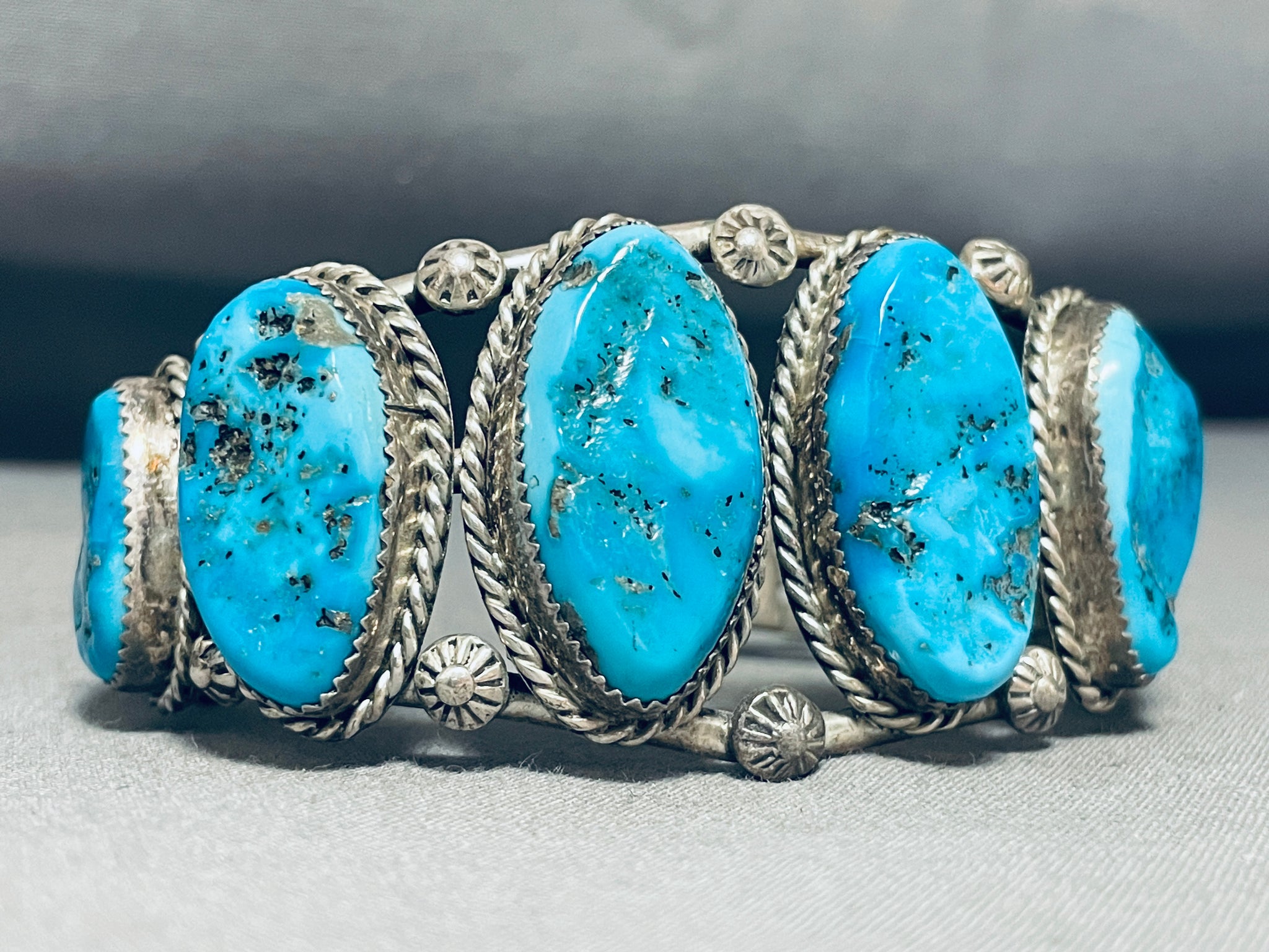This is a fascinating vintage Navajo turquoise row silver bracelet. This impeccable bracelet contains 8 outstanding large graduating chunky Morenci turquoise nuggets. The nuggets beautifully graduate in size towards the center. Surrounding each stone are incredible silver ropes. Located throughout the stones are wonderful large handmade silver shells. This incredible bracelet includes a superior triple silver shank cuff with end terminal caps. I love the detailing and workmanship on this bracelet. The center stone measures around 1-1/4" x 1/2". The width of the bracelet measures around 1-1/2". Sterling silver, marked. Cir. Mid century . The inside end to end measures around 5-3/4" with an additional 1" gap. Sturdy 68 grams.
