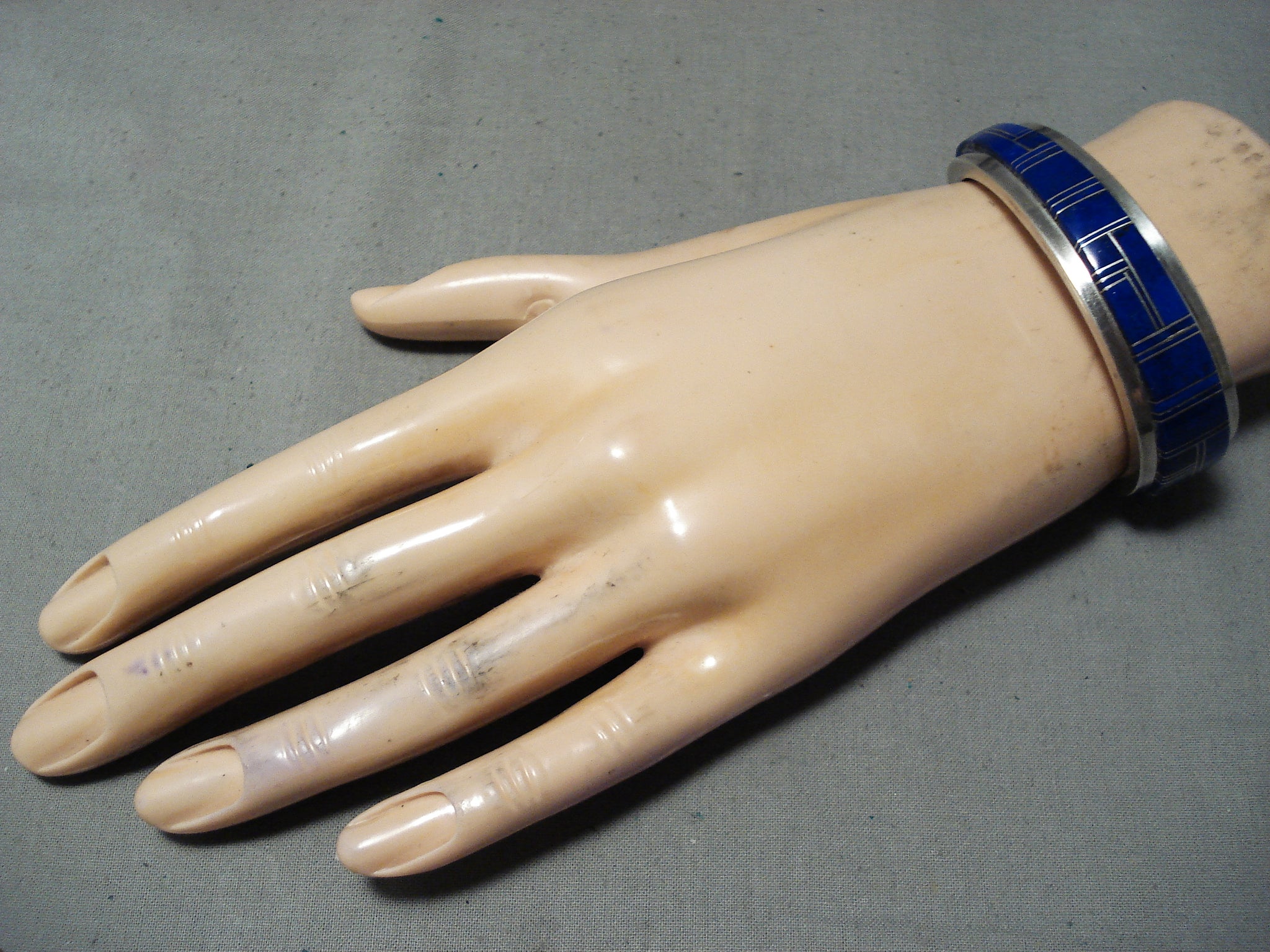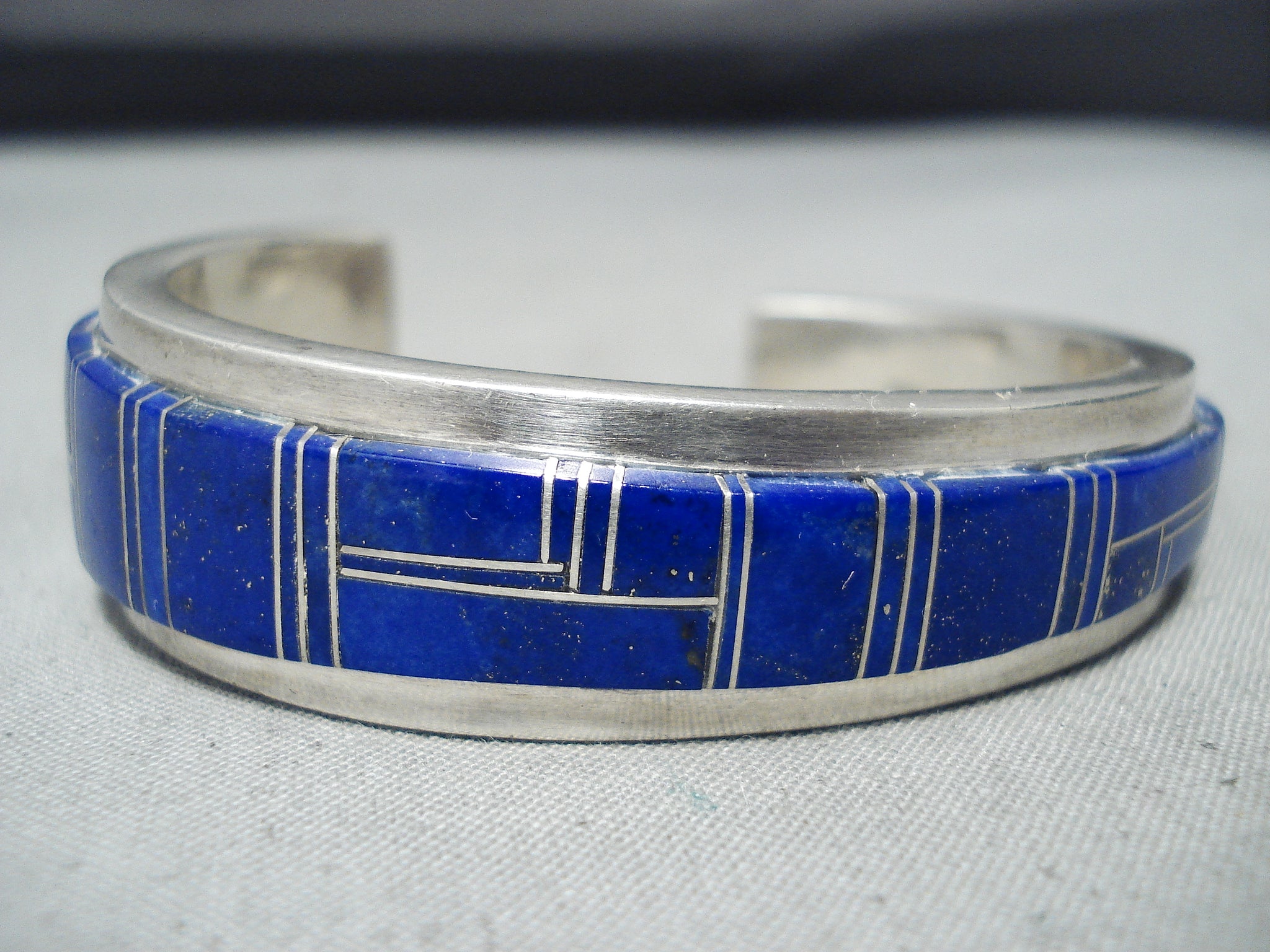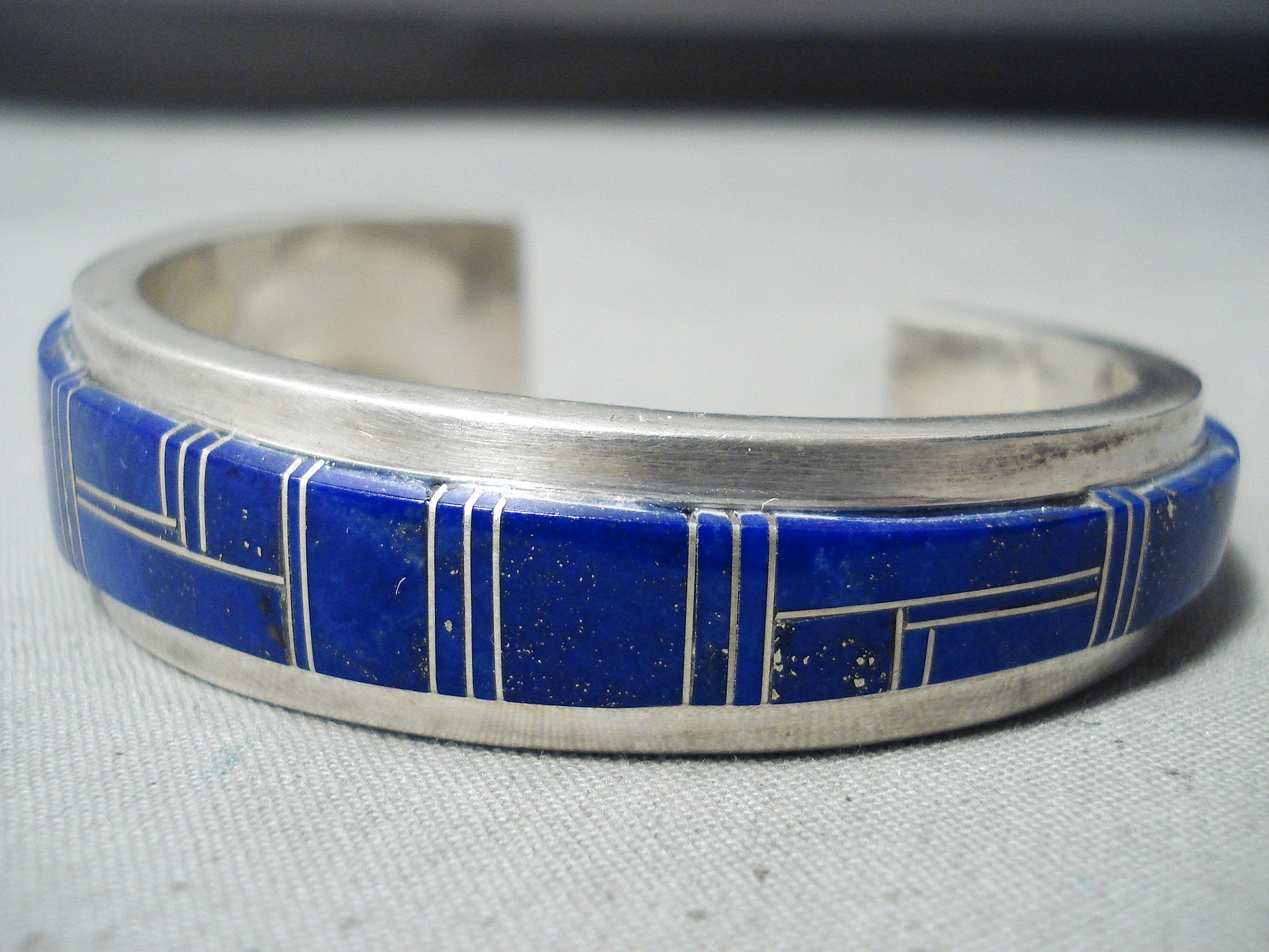Thicker Heavy Vintage Native American Navajo Lapis Sterling Silver Inlay Bracelet