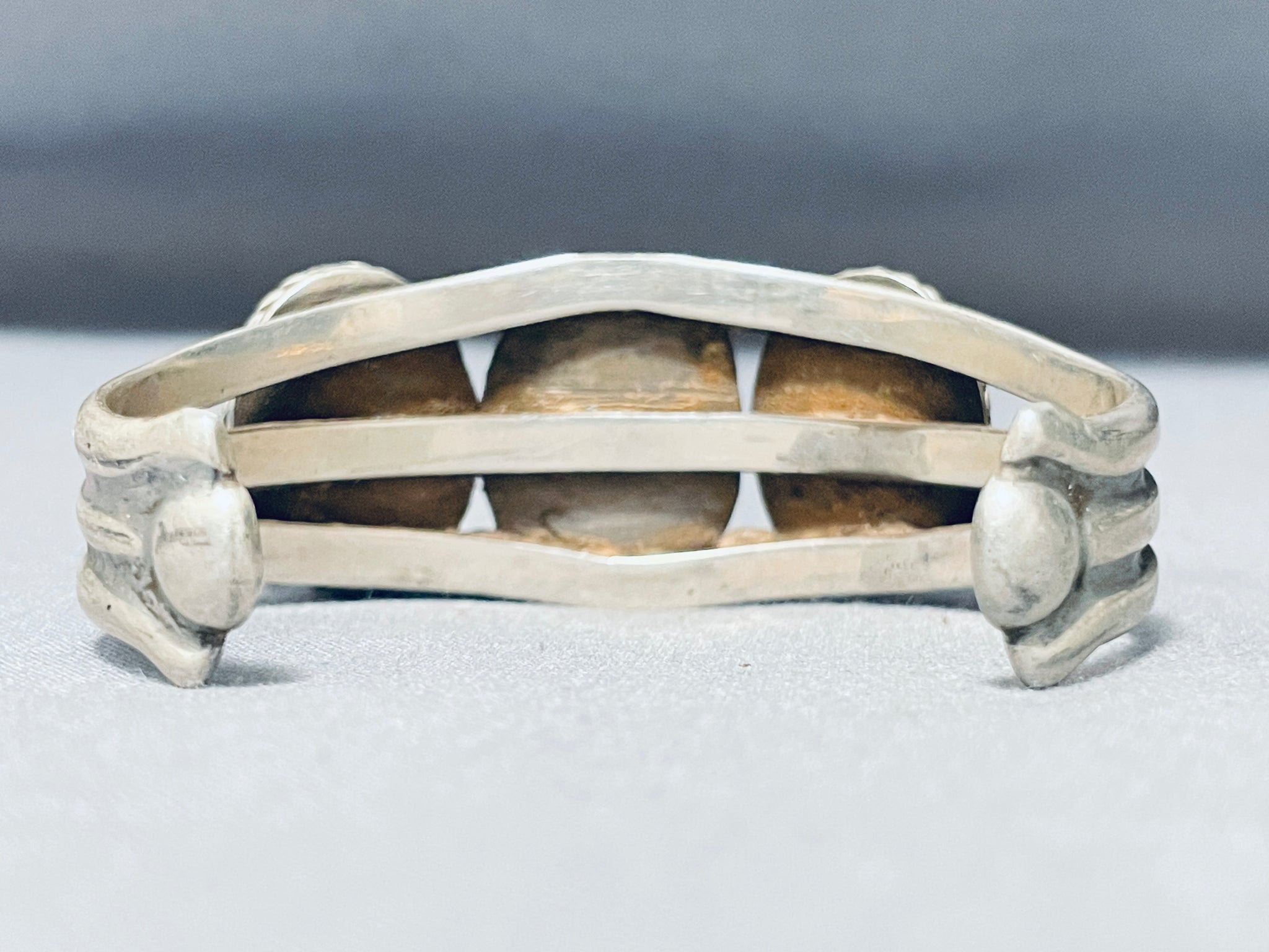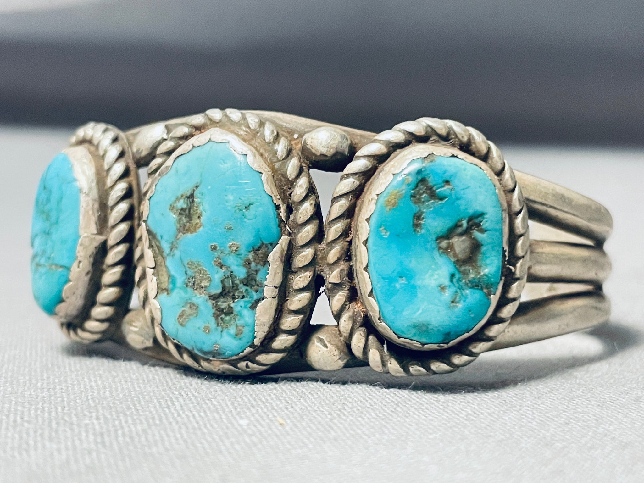 This is an incredible vintage Navajo three stone silver bracelet. This wonderful bracelet contains three beautiful Pilot Mountain turquoise stones. Surrounding each stone are magnificent thick sturdy silver ropes with accenting raindrops. This bracelet includes a superior heavy and sturdy thick triple silver shank cuff. The center stone measures around 3/4" x 1/2". The width of the bracelet measures around 1". Sterling silver, marked. Cir. Mid century . The inside end to end measures around 4-3/4" with an additional 1-1/4" gap. Sturdy 46 grams.