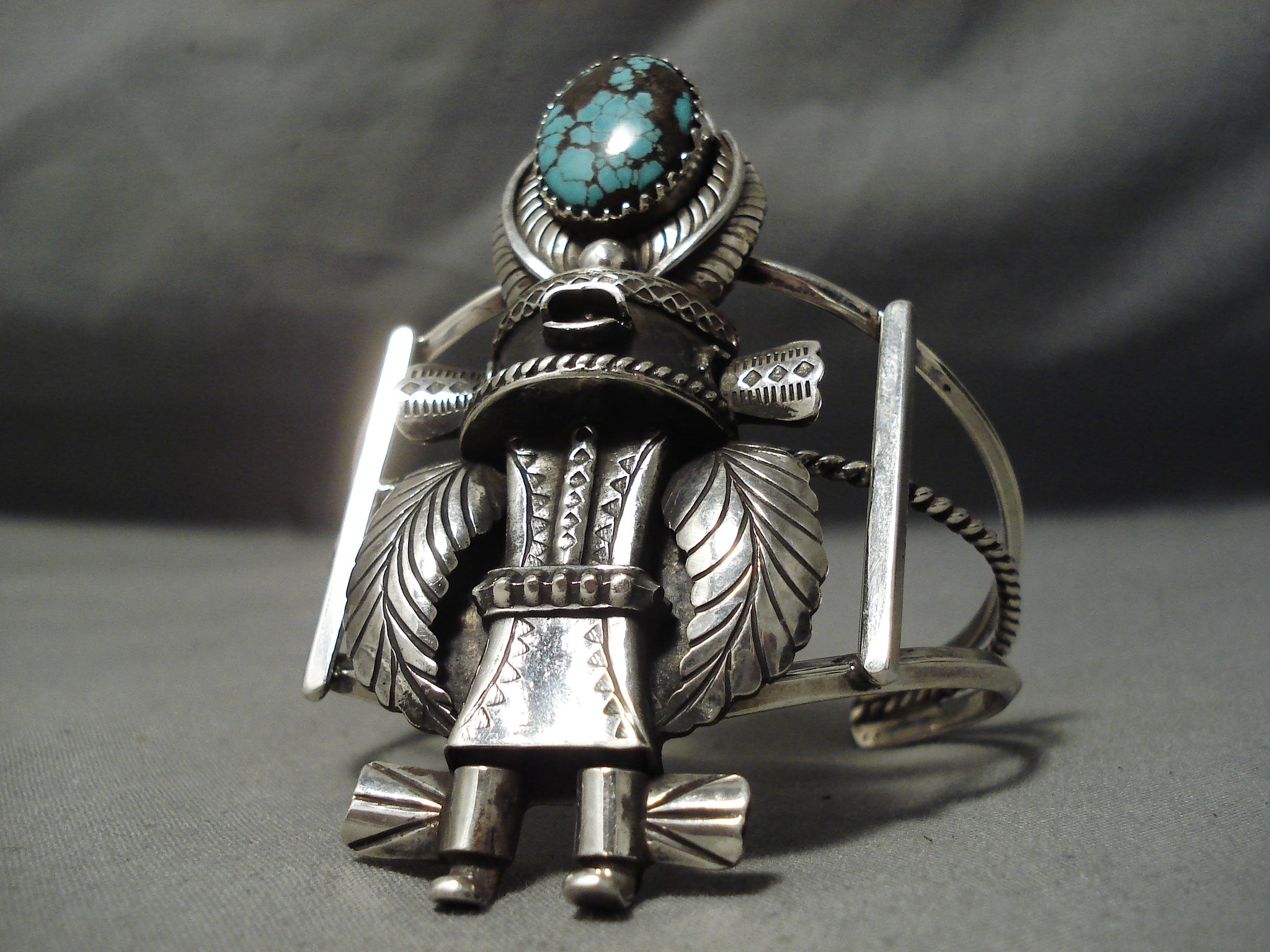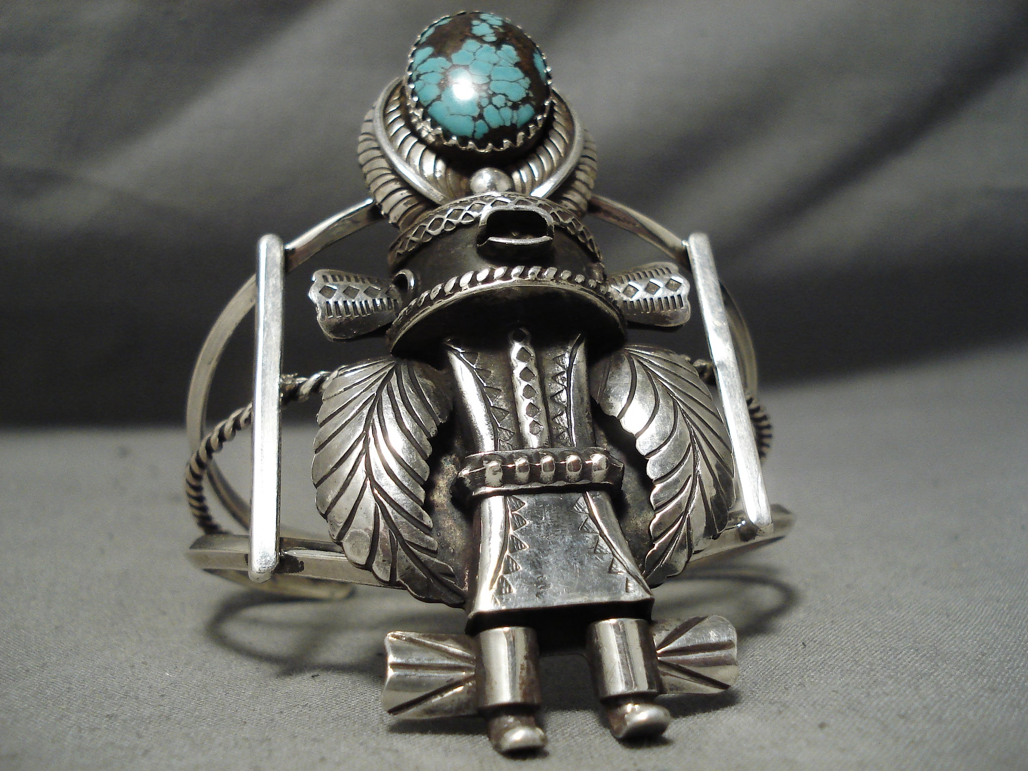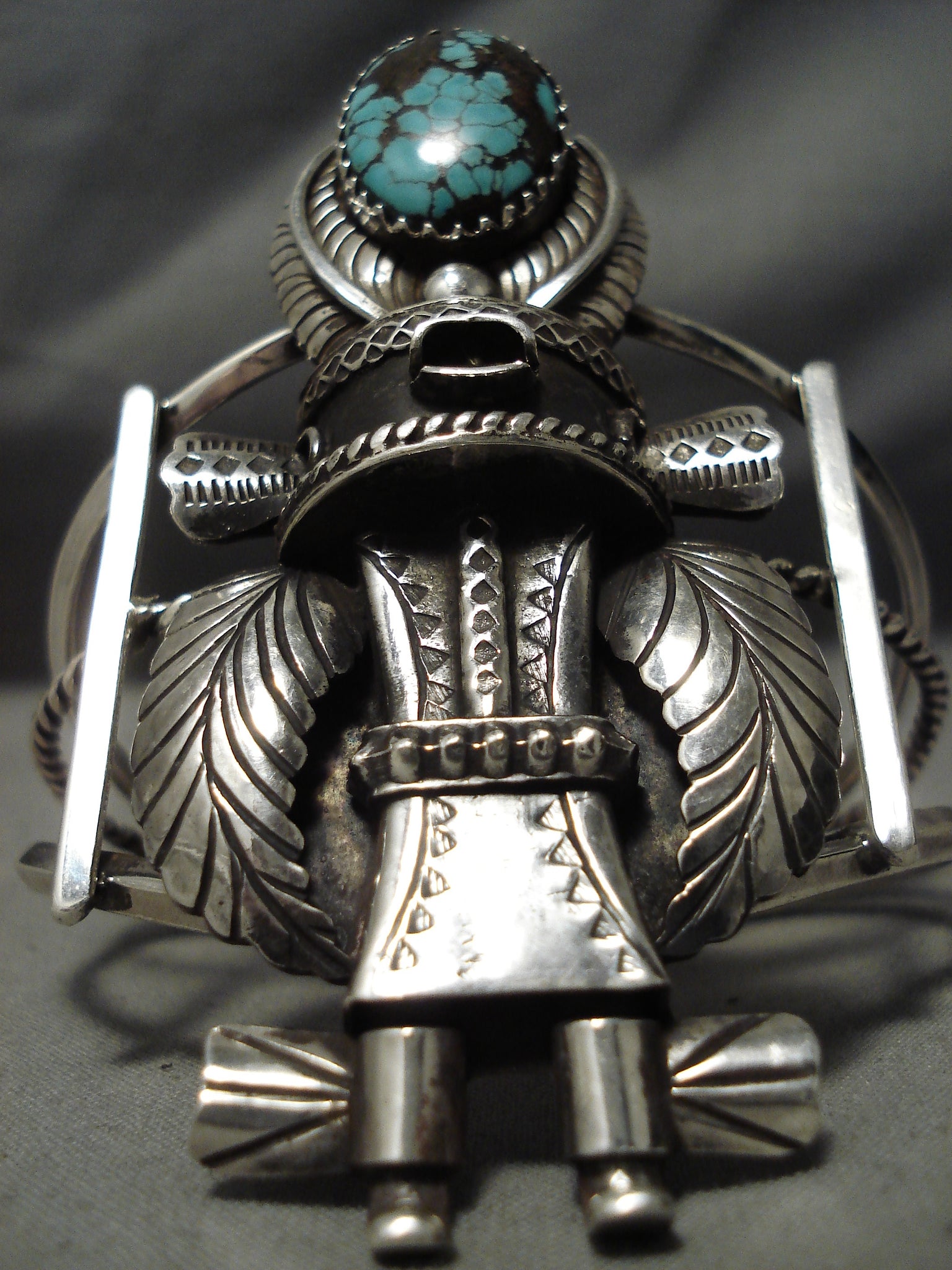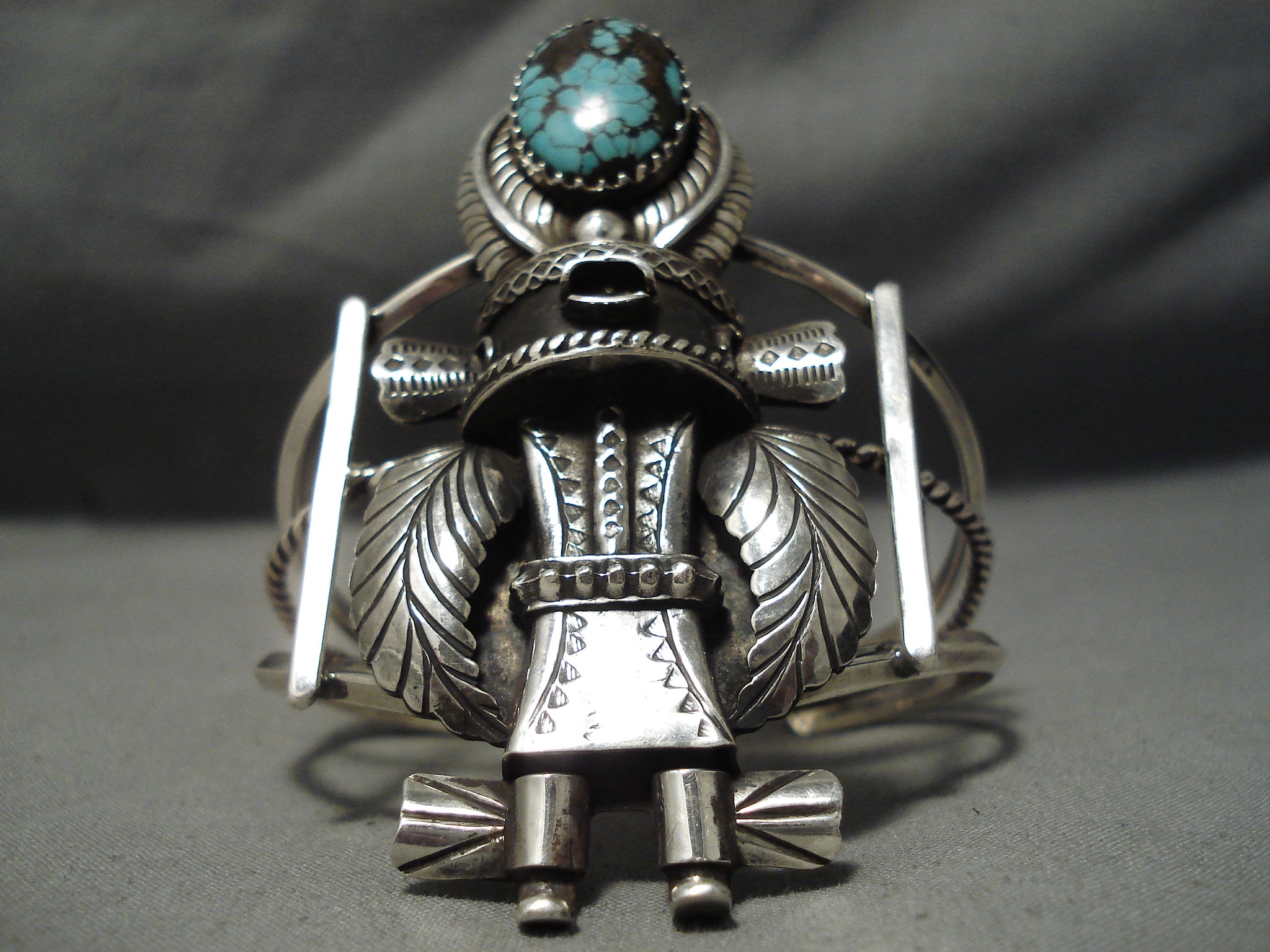 Towering Huge Vintage Native American Navajo Turquoise Sterling Silver Kachina Bracelet
