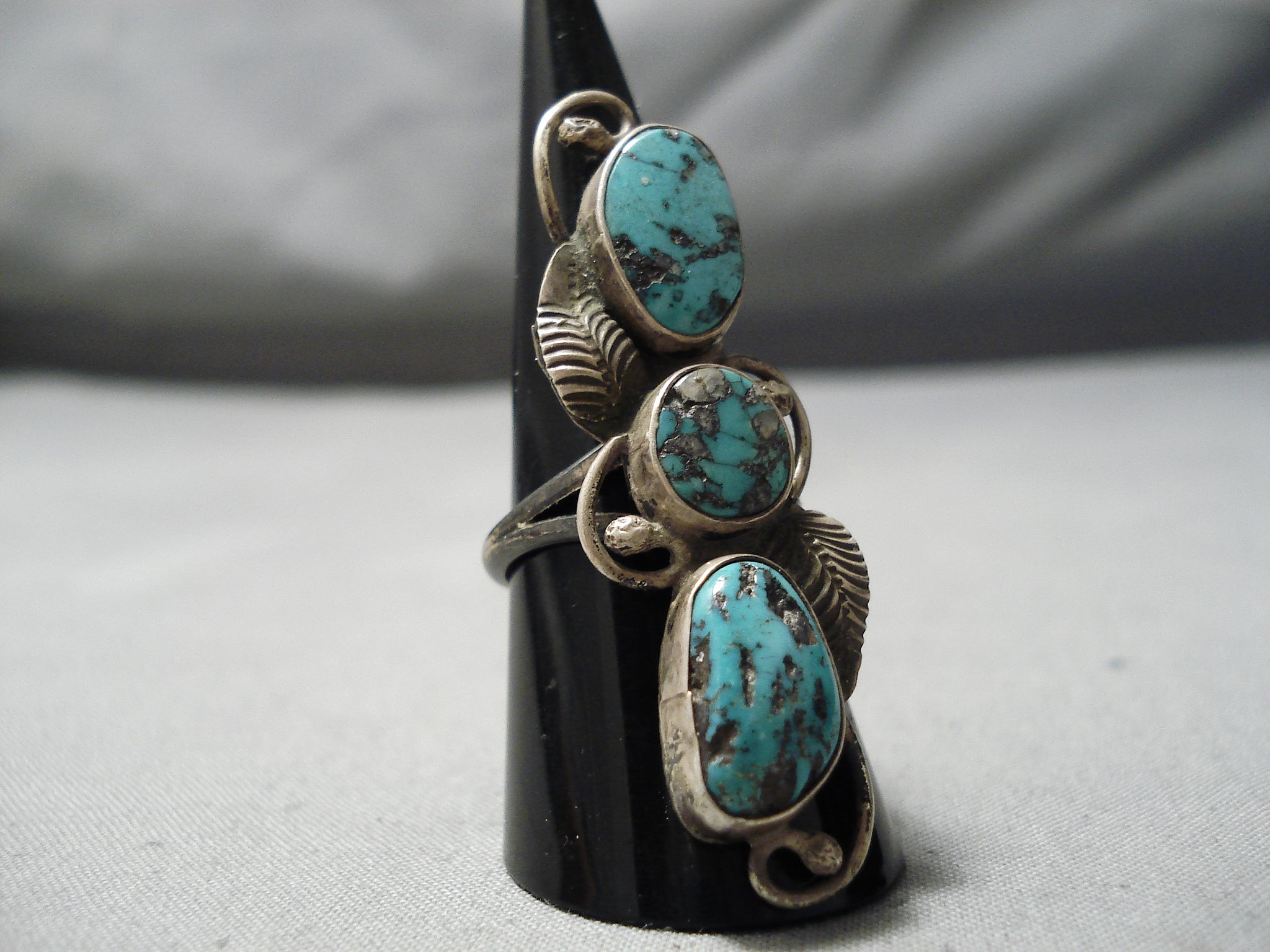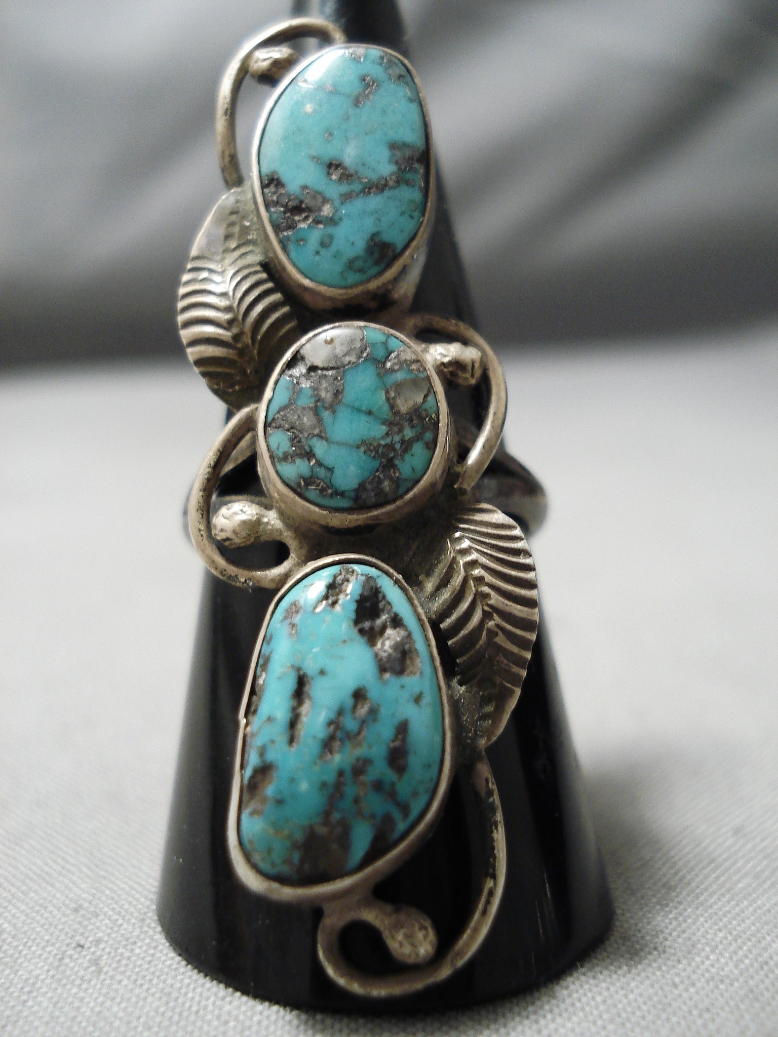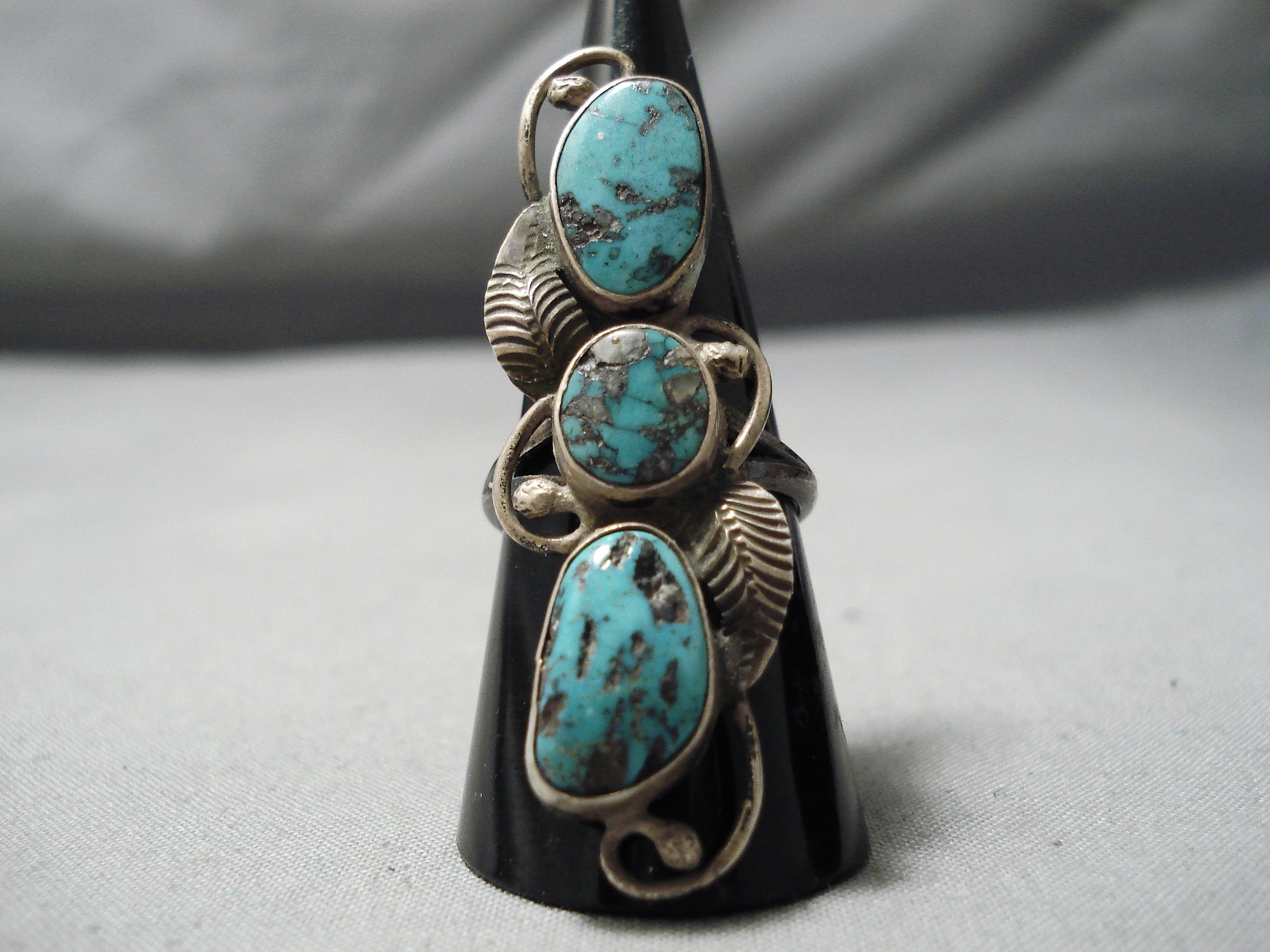 This is an amazing vintage Navajo three stone silver ring. This piece contains three incredible Royston turquoise stones. Surrounding the stones are beautiful hand carved silver leaves. Accenting the ring are stunning silver works that consist of hand carved leaves, stems and raindrops. The largest stone measures around 1/2" x 1/4". The ring face measures around 2" x 5/8". The ring size is around 7.5. Cir. Mid century . Sterling silver. Sturdy 7 grams.