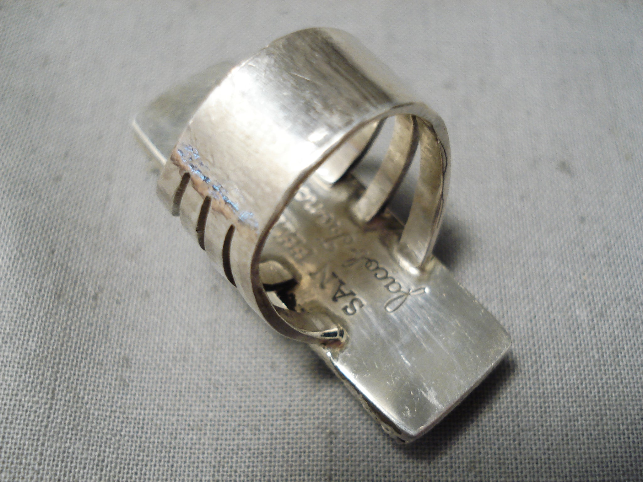 This is a superior San Felipe large single stone silver ring. This amazing ring contains a large rectangular shaped Pilot Mountain turquoise stone. The surrounding silver bezel of the ring is stunning as it is of a beautiful crown pattern. The ring is very thick and sturdy containing a wonderful quadruple silver shank that graduates into a single shank towards the back. The center stone measures around 1-1/2" x 1/2". The ring face measures around 1-1/2" x 1/2". Signed by San Felipe artist, Jake Troncosa. The ring size is around 6. Cir. 1980's+. Sterling silver, marked. Sturdy 11 grams.