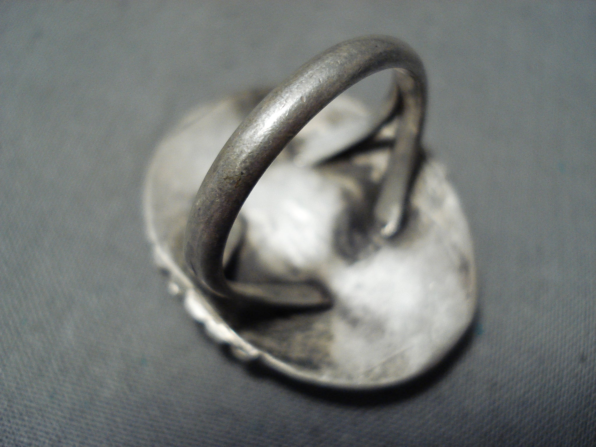 This is an incredible vintage Navajo ring featuring an Old Kingman turquoise stone surrounded by handcarved silver rope, silver borders, and handcarved silver beads, all on a graduated double rail silver band that reduces to a solid silver band! The center stone measures around 1" x 5/8". The ring face measures around 1-1/4" x 1". The ring size is around 7. Sterling silver. Sturdy 11 grams. Cir. mid century
