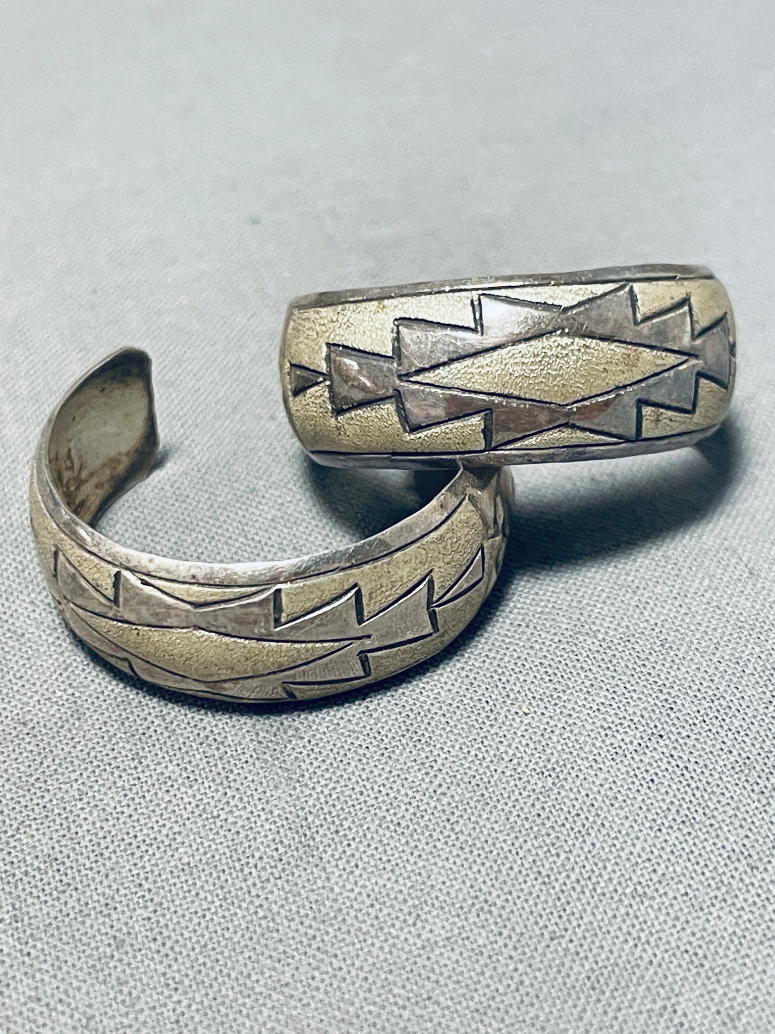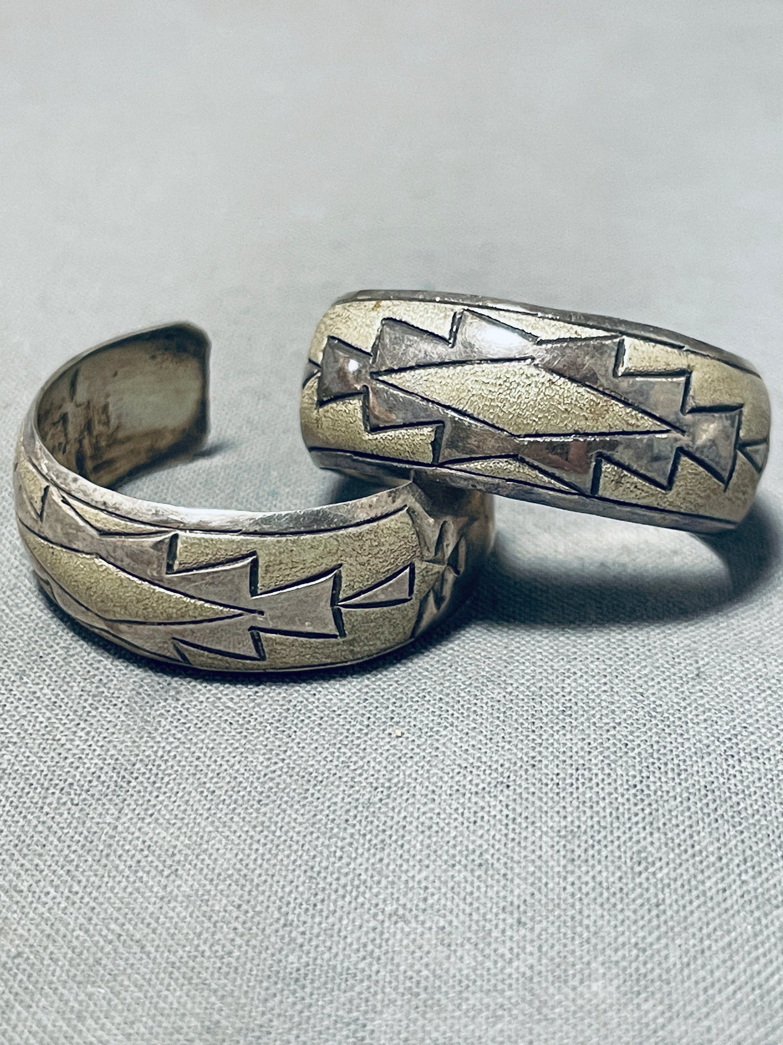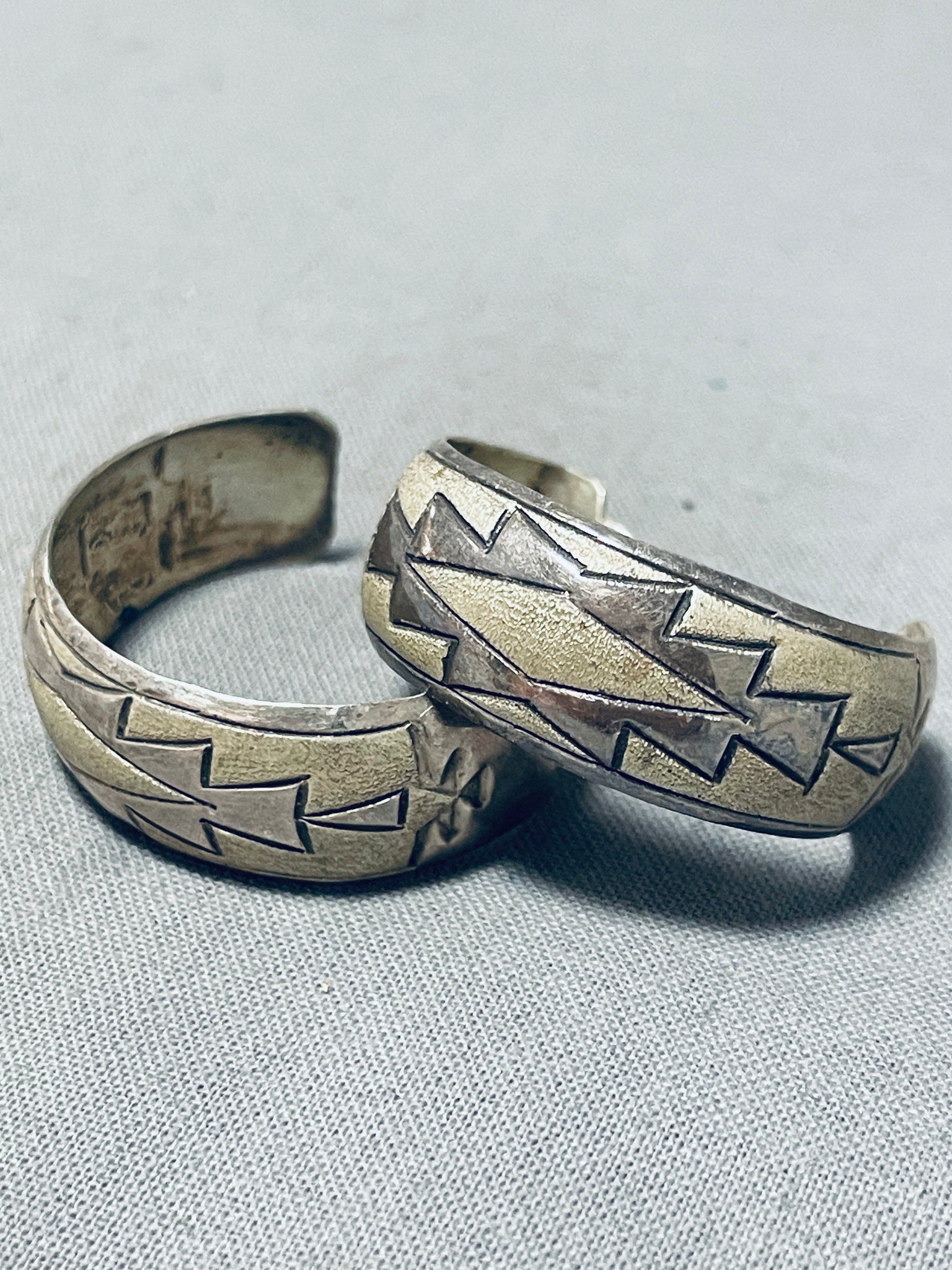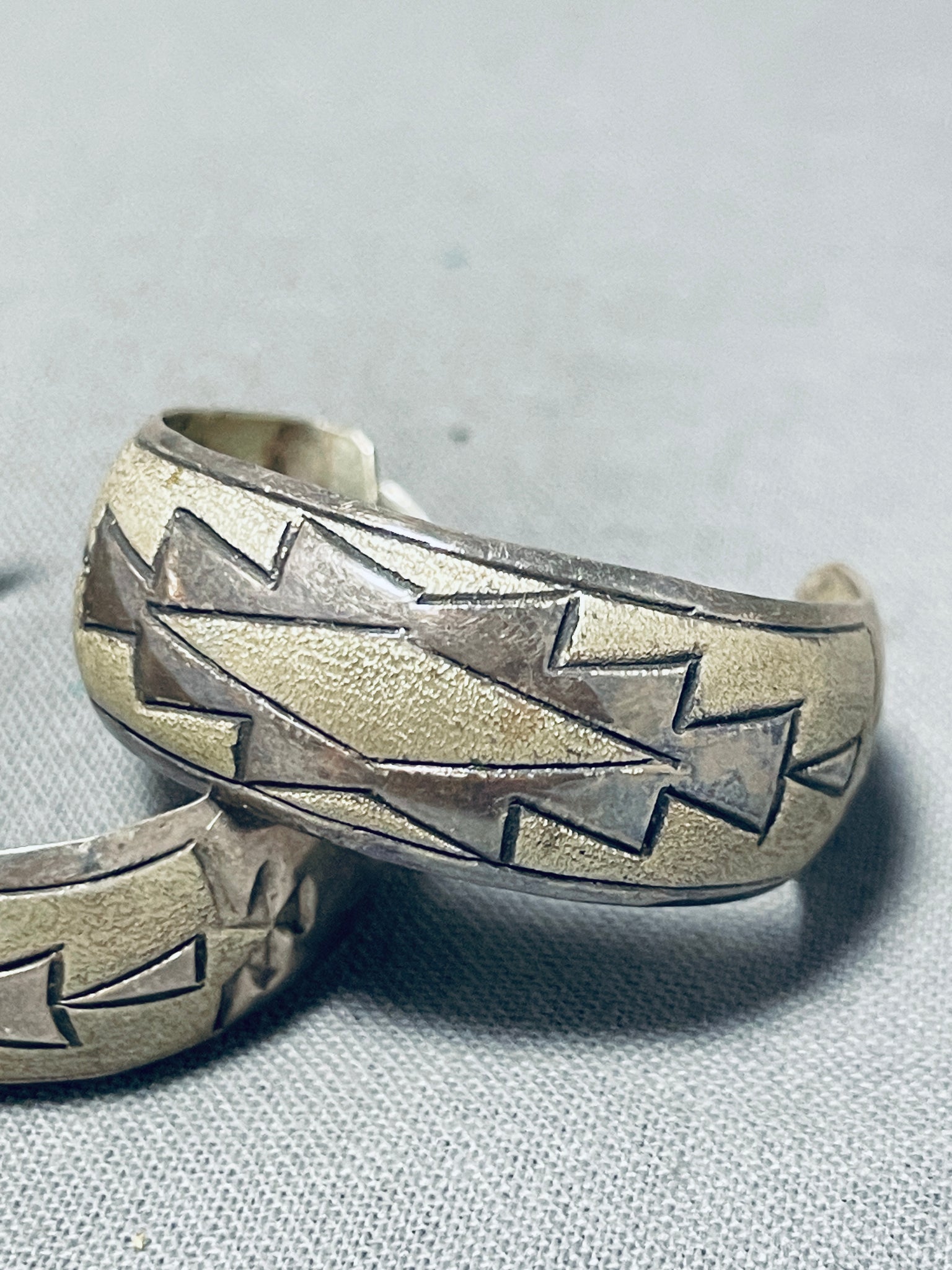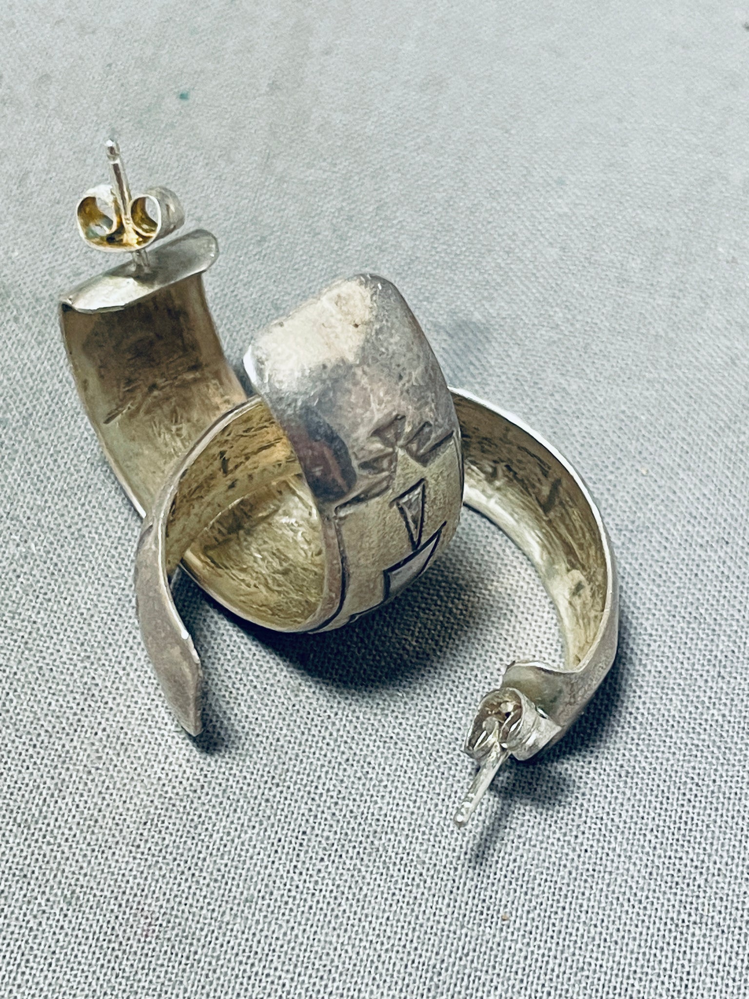 We are proud to offer this sparkling pair of vintage Navajo earrings! They feature silver hoops with hand carved geometric patterns, and silver posts for pierced ears! Impressive Artistry! Sterling silver. Each earring measures 1-1/4" long and 3/8" wide. The earrings weigh around 8 grams.