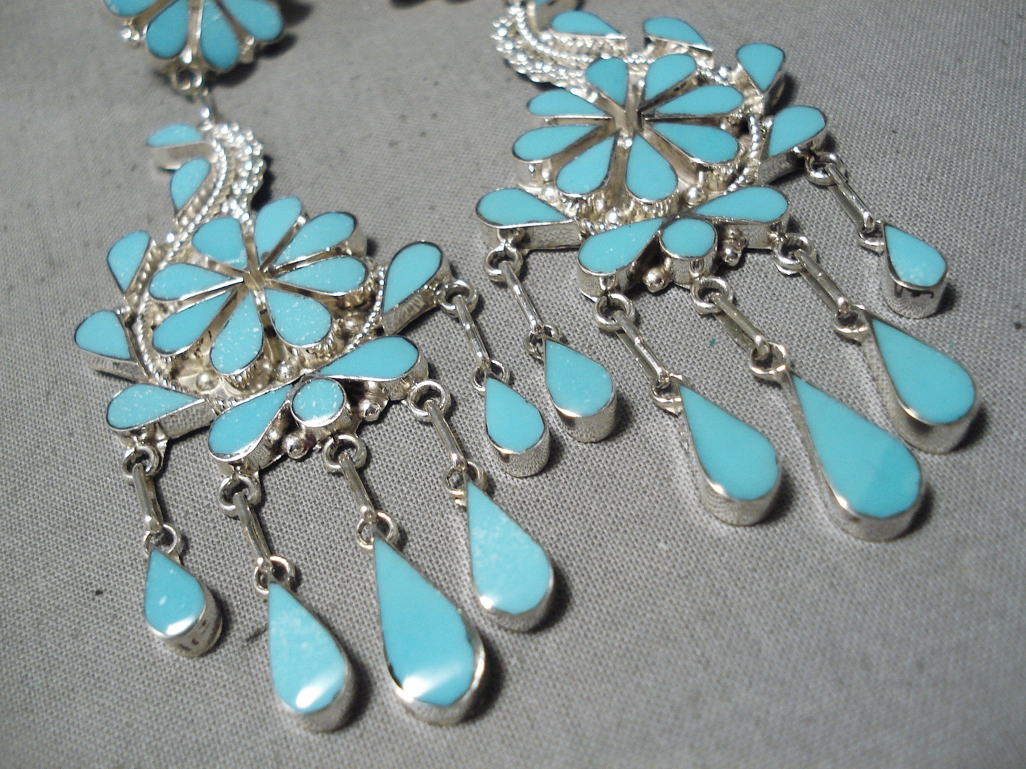 Tremendous Native American Zuni Chandelier Turquoise Sterling Silver Earrings
