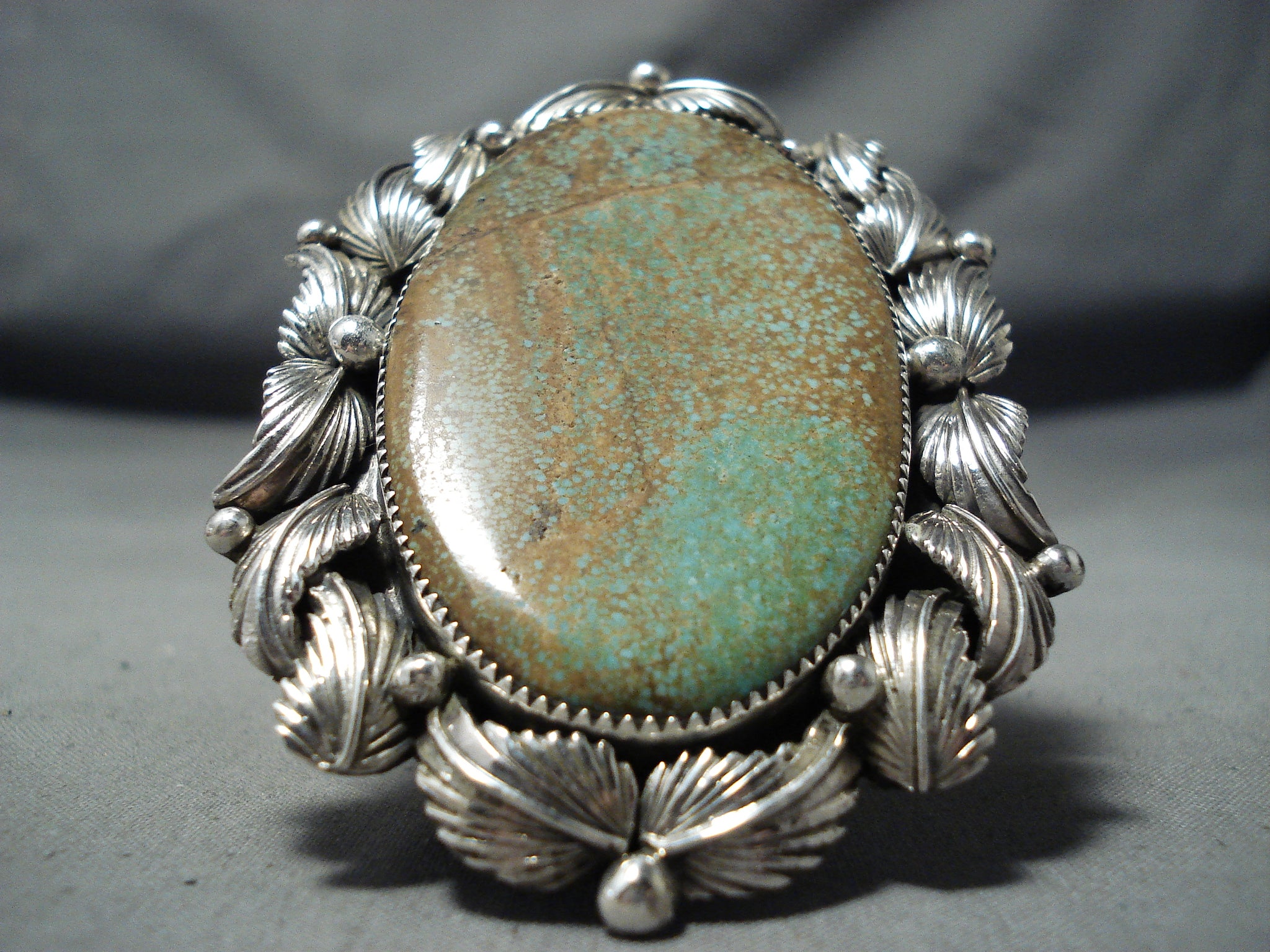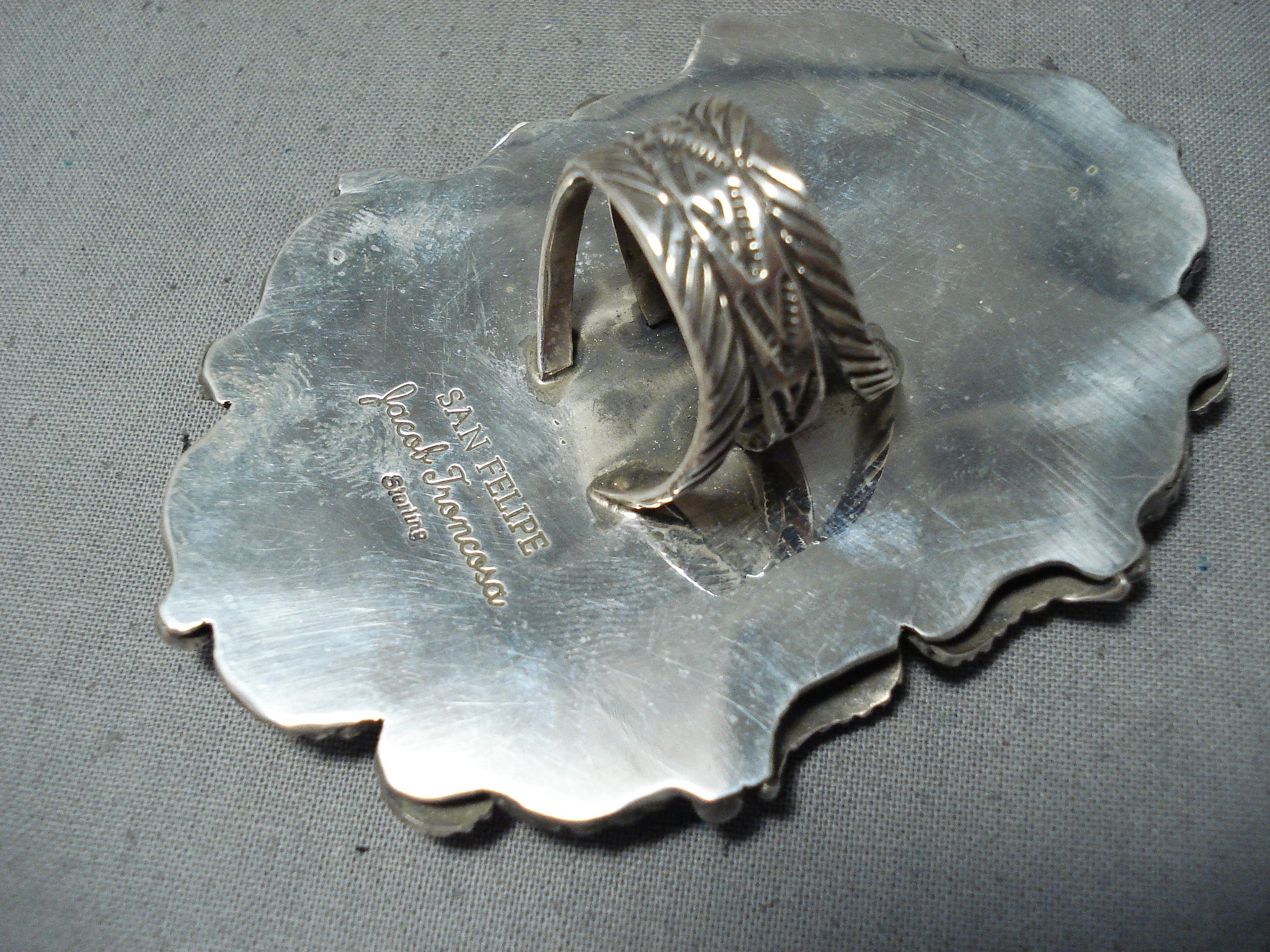 Here we have an incredible San Felipe silver ring having a huge #8 turquoise oval surrounded by a handcarved silver leaf and silver bead border! The ring has a handcarved graduated triple silver rail band accented with silver handstampings! Absolutey Fabulous! The center stone measures around 2-3/8" x 1-3/8". The ring face measures around 3-1/8" x 2-1/4". Signed by San Felipe artist, Jake Francosa. The ring size is around 9. Sterling silver, marked. Sturdy 53 grams.