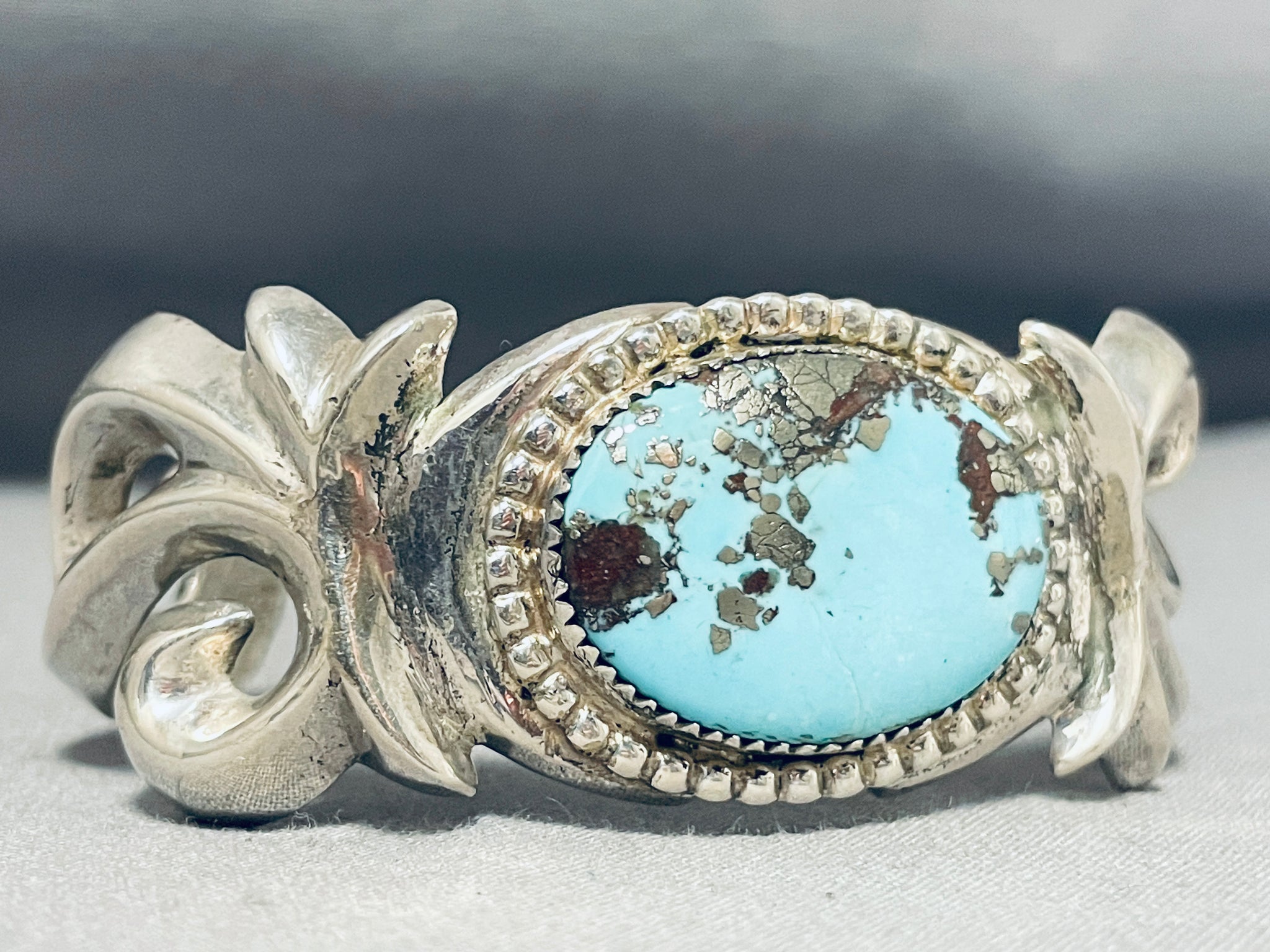Up for sale is this superlative vintage Navajo silver bracelet. The scroll design cast cuff beautifully hosts the tremendous Godber turquoise stone at the heart of the cuff, surrounded with its silver bead border! The center stone measures around 1" x 3/4". The width of the bracelet measures around 1". Sterling silver. The inside end to end measures around 5" with an additional 1-1/4" gap. Sturdy 66 grams.