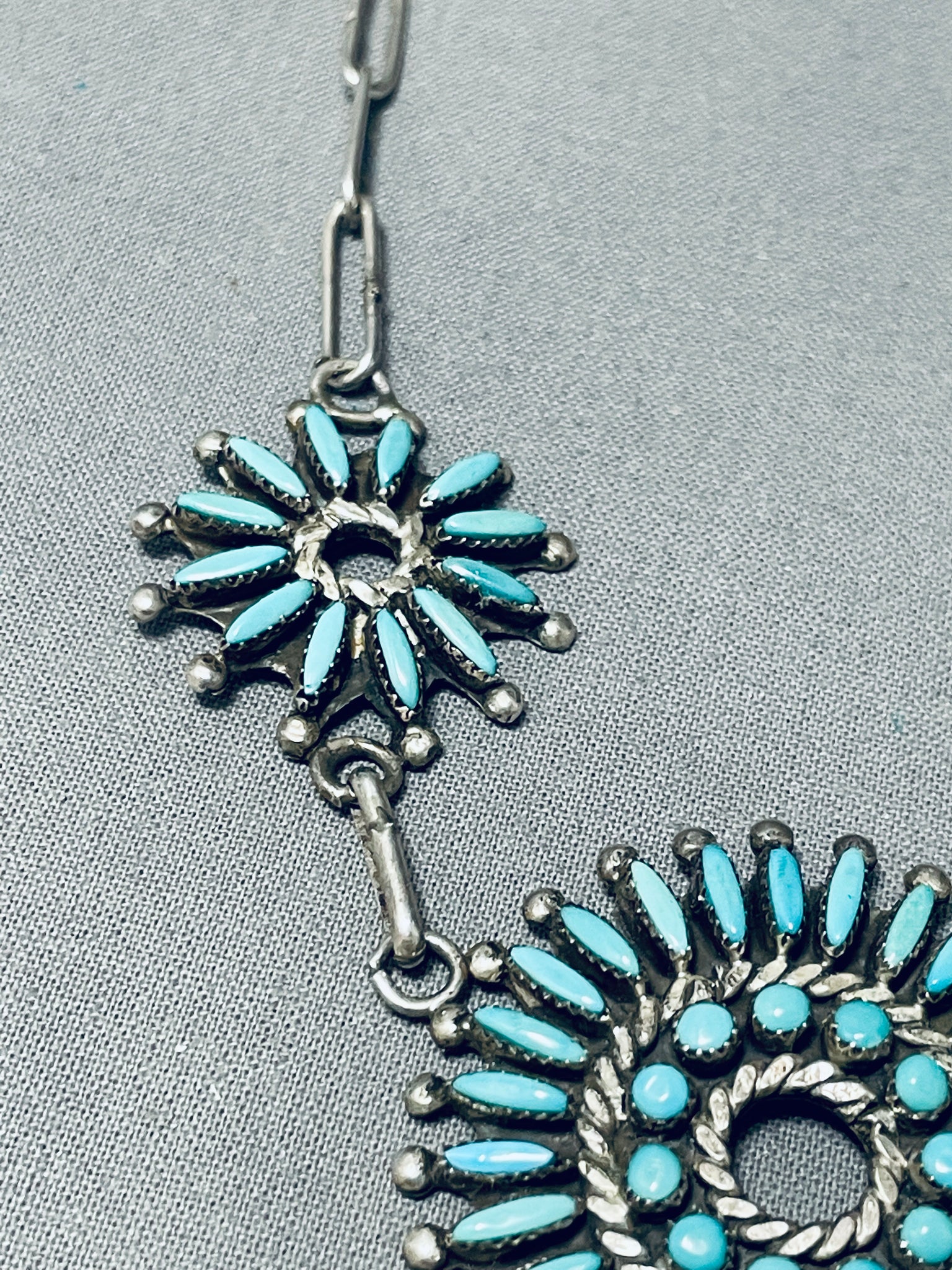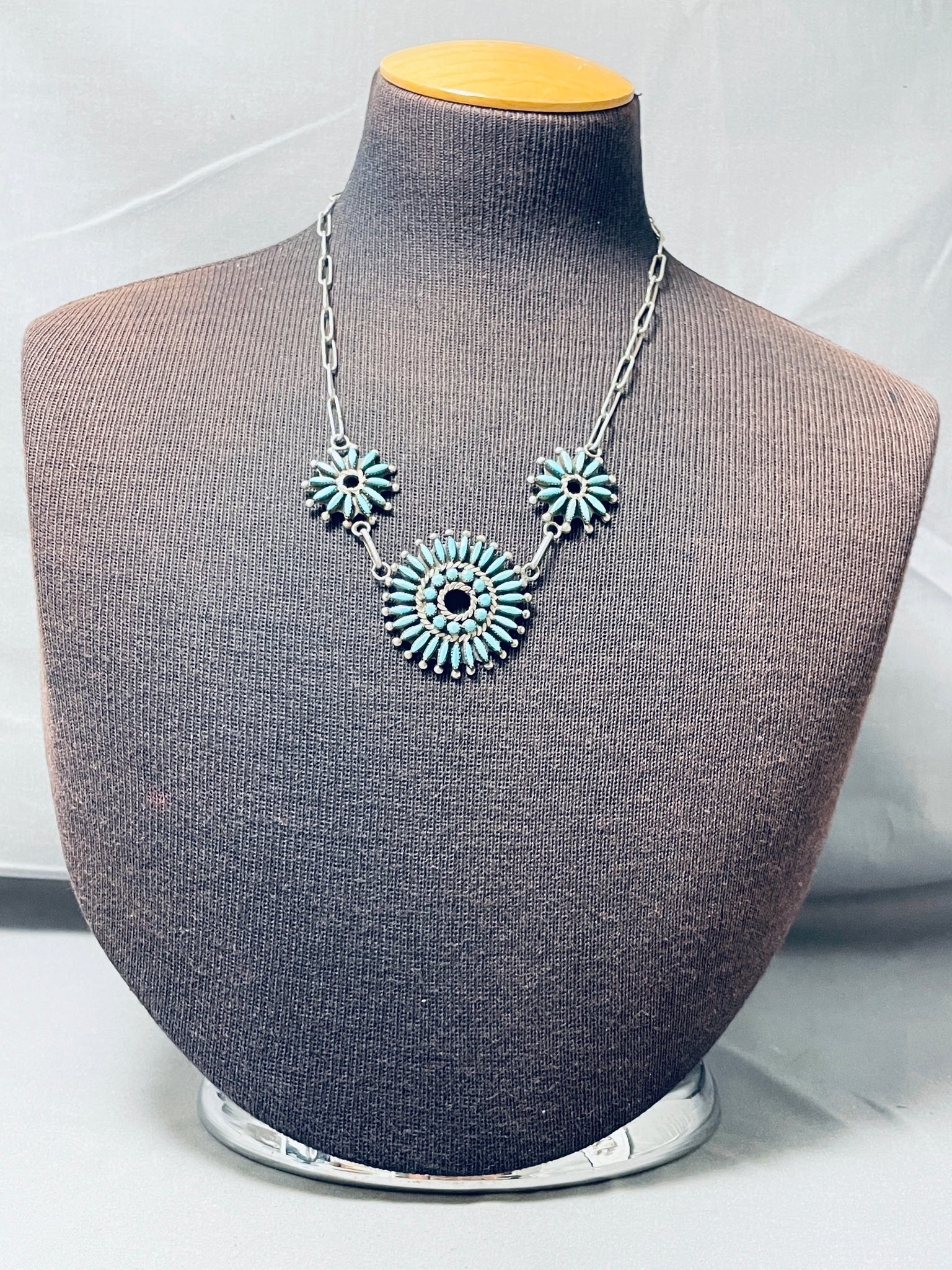 Tripe Turquoise Sun Vintage Native American Zuni Sterling Silver Necklace