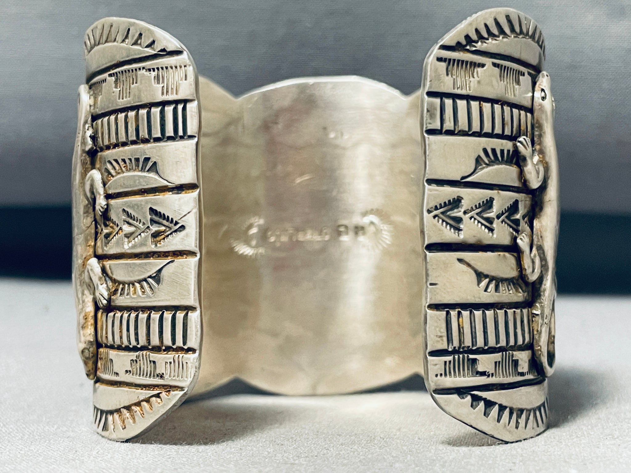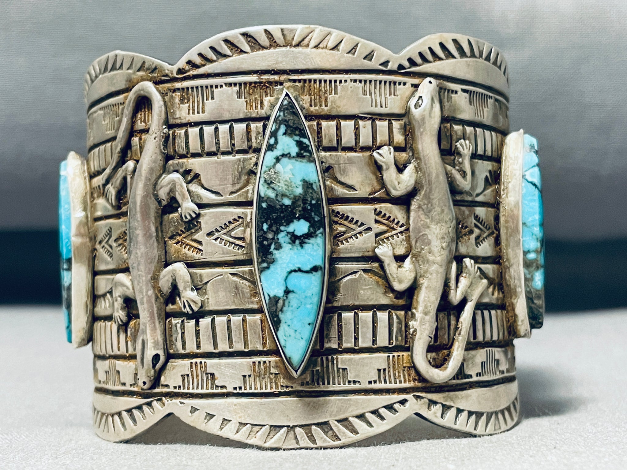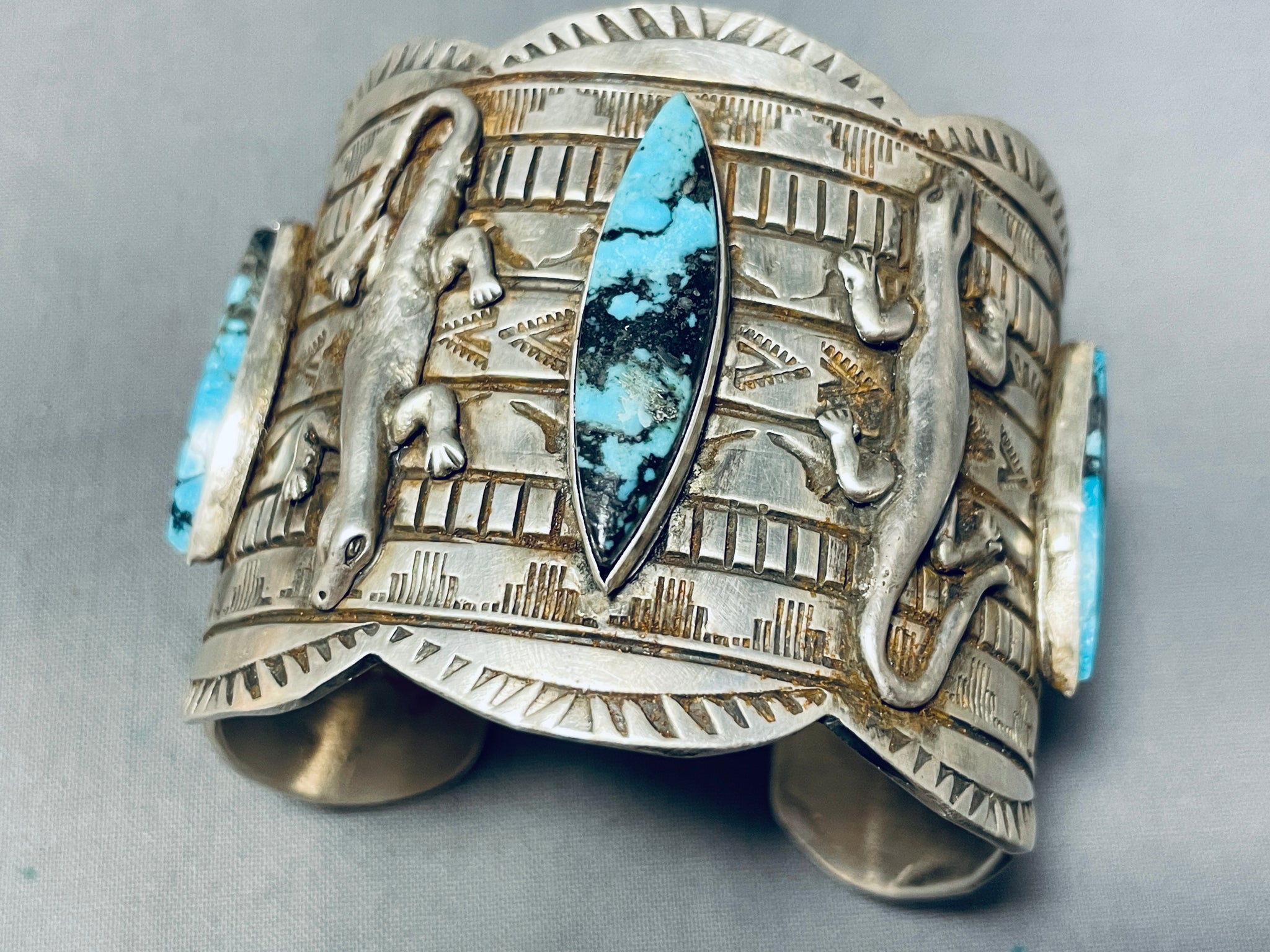 Unbelievable Native American Navajo 3 Blue Diamond Turquoise 4 Silver Gekkos Huge Bracelet