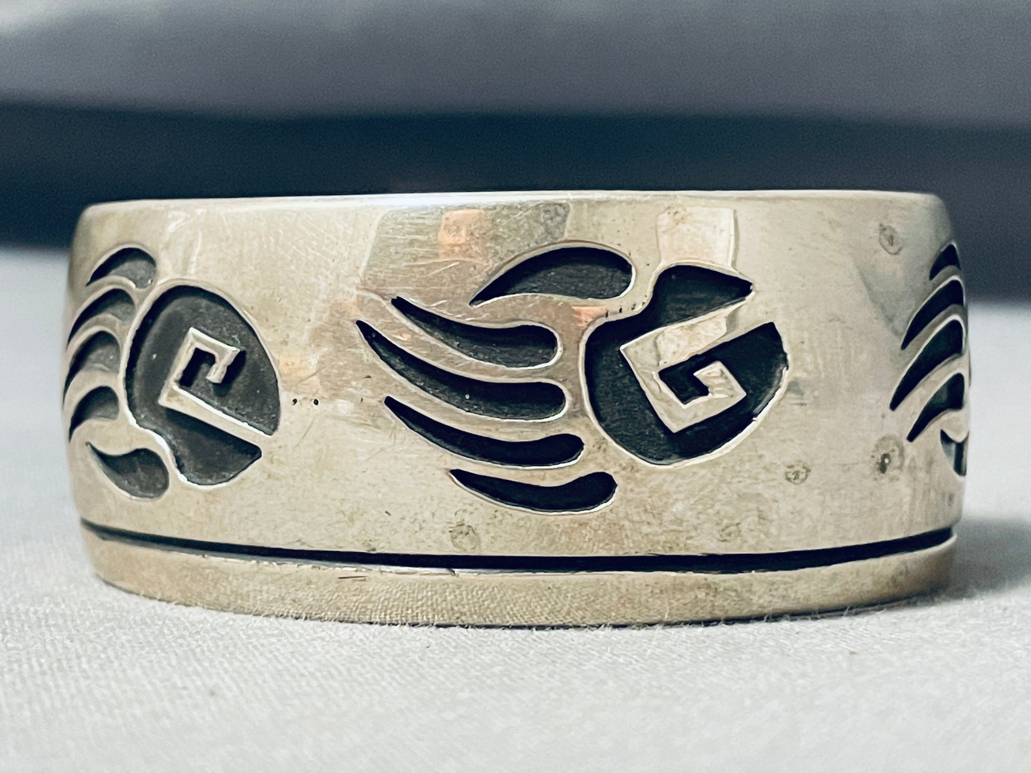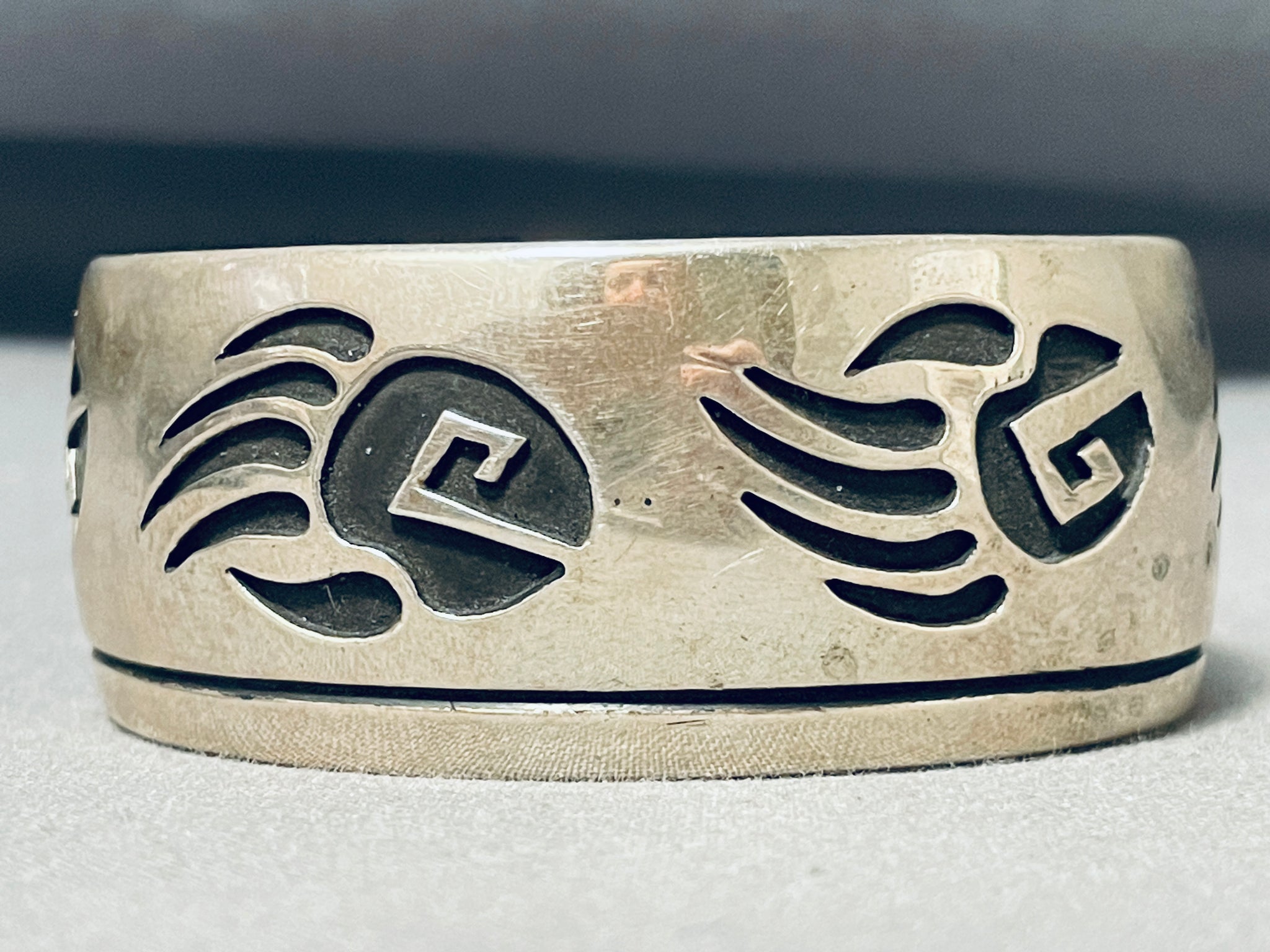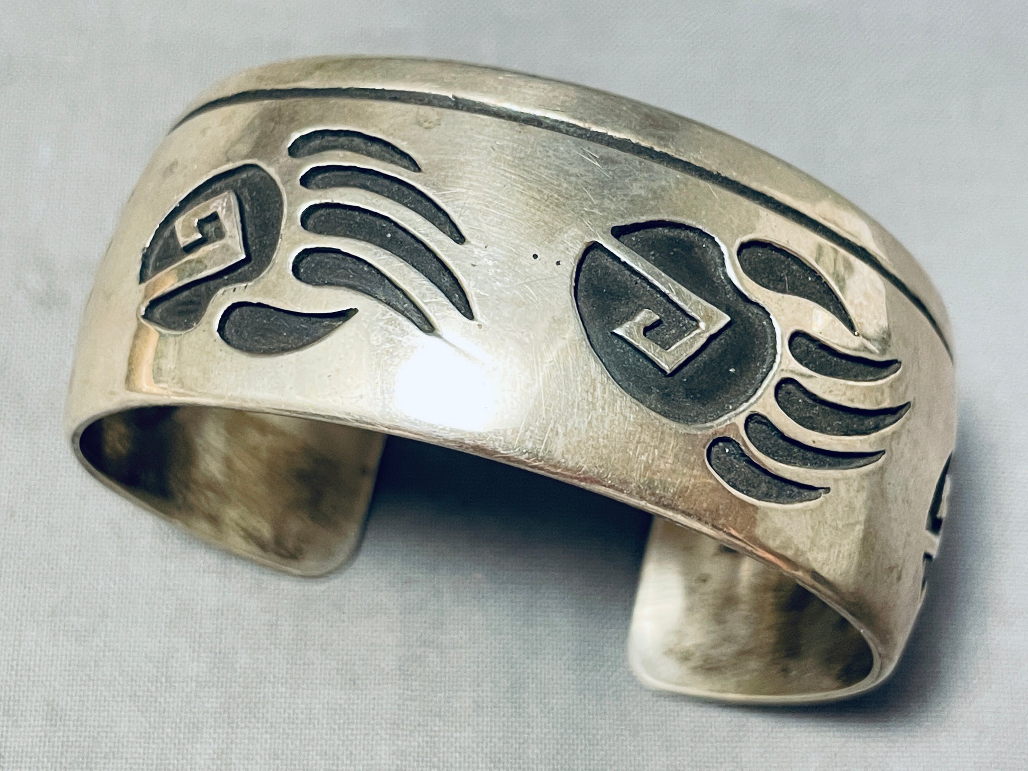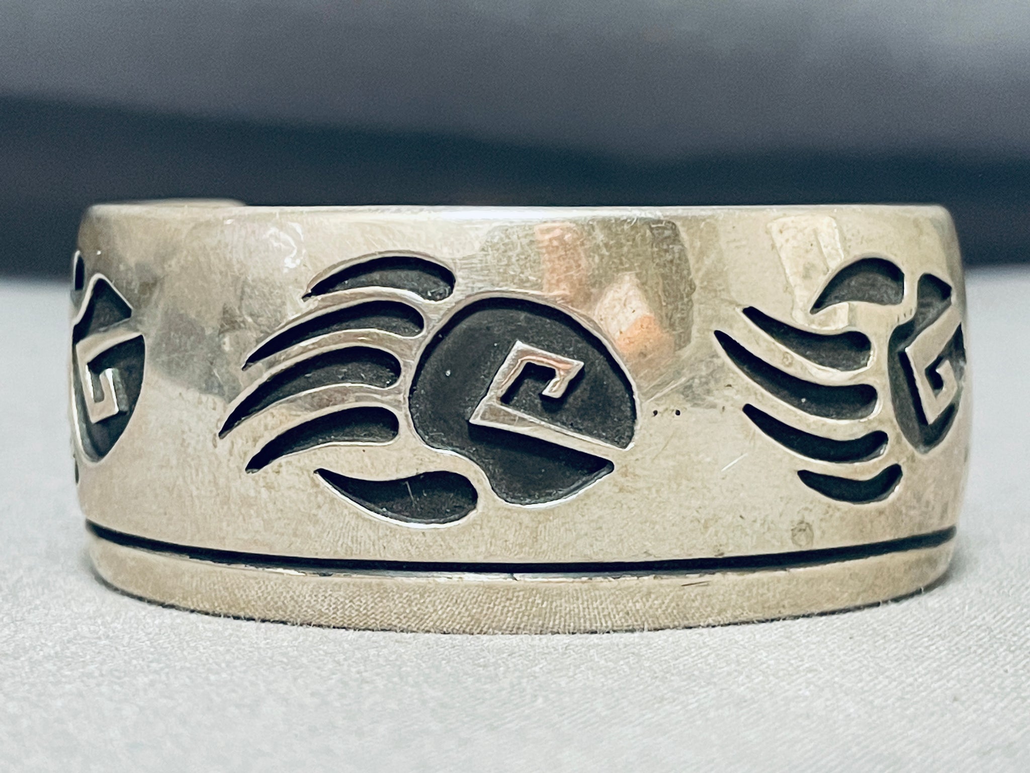 Unbelievable Native American Navajo Signed Sterling Silver Handcarved Tracks Bracelet