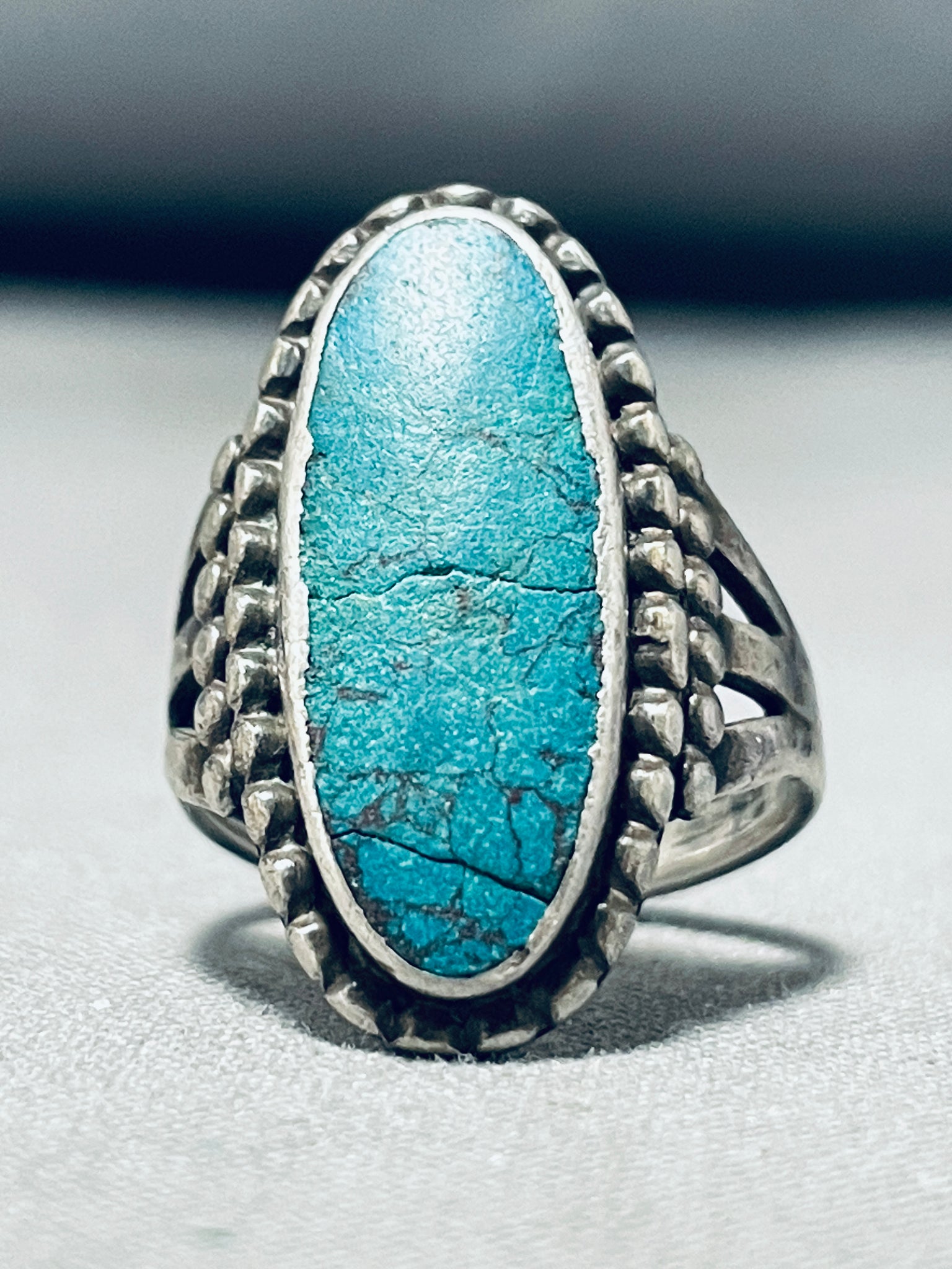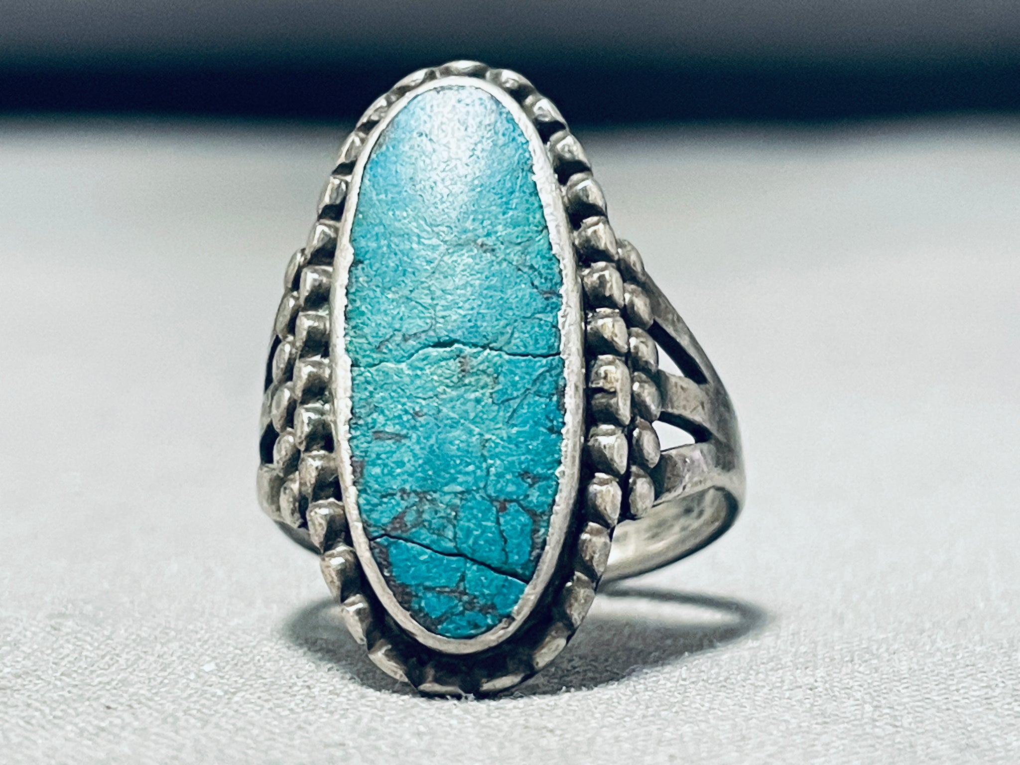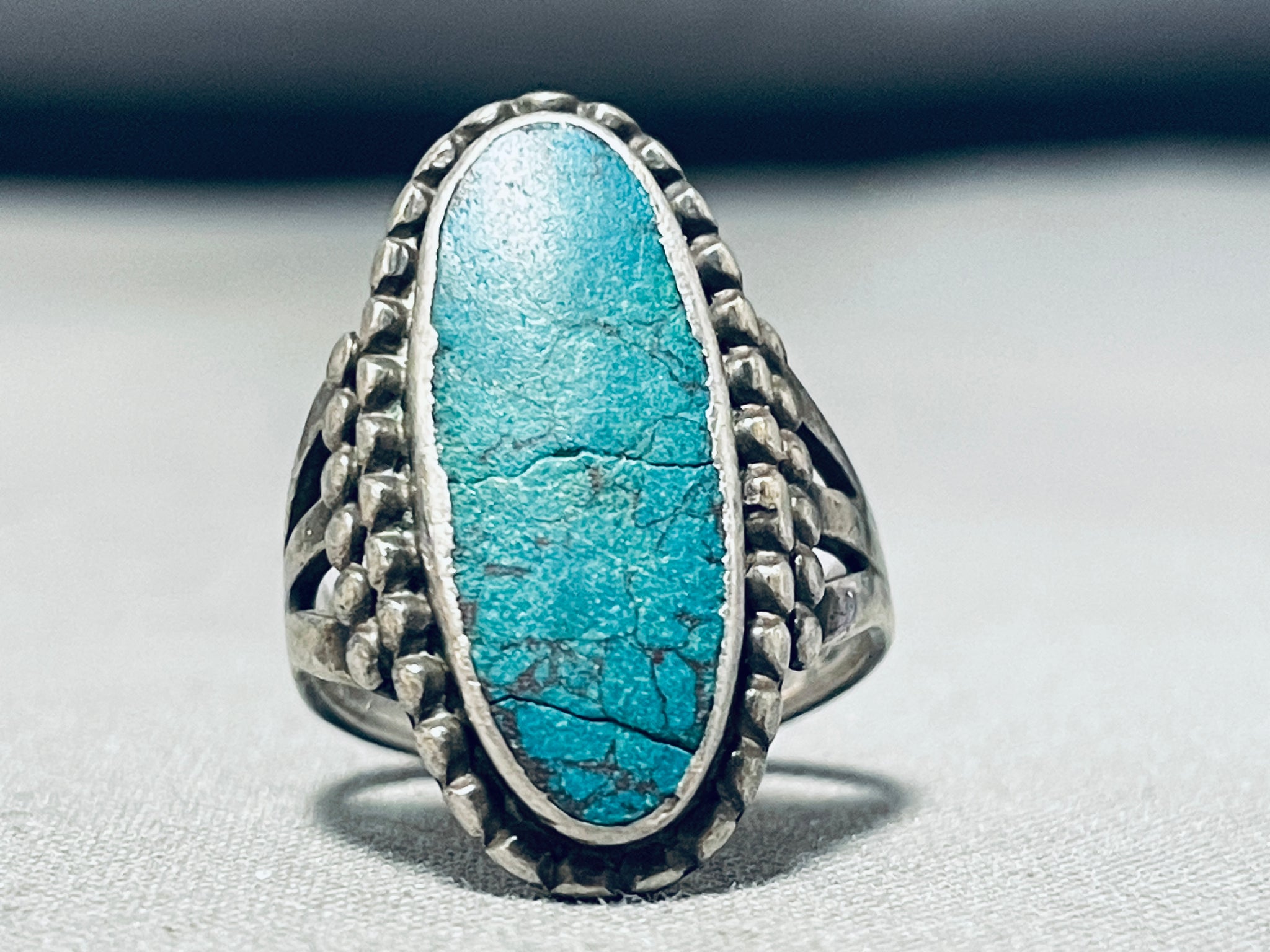 Here we have an astounding vintage Navajo silver ring. Wow! If this incredible 1940's+ piece of history could talk - the stories of life it could share! The tremendous, elongated Pilot Mountain turquoise stone is surrounded with silver rope, with the additional side bars of silver beads at each side to greet its triple rail band! Pilot Mountain Turquoise is a variety of turquoise mined from the Pilot Mountain Mine located in Nevada, USA. Pilot Mountain turquoise jewelry is cherished not only for its beauty but also for its connection to Native American culture and traditions. Pilot Mountain turquoise, with its vibrant blue and green hues and intricate matrix patterns, is highly sought after by Native American jewelry artisans. The center stone measures around 13/16" x 5/16". The ring face measures around 1" x 11/16". The ring size is around 5-1/4. Cir. 1940's+. Sterling silver, marked. Sturdy 6 grams.