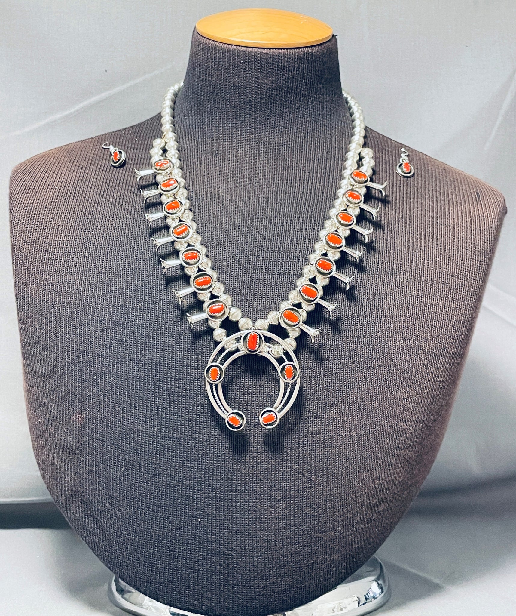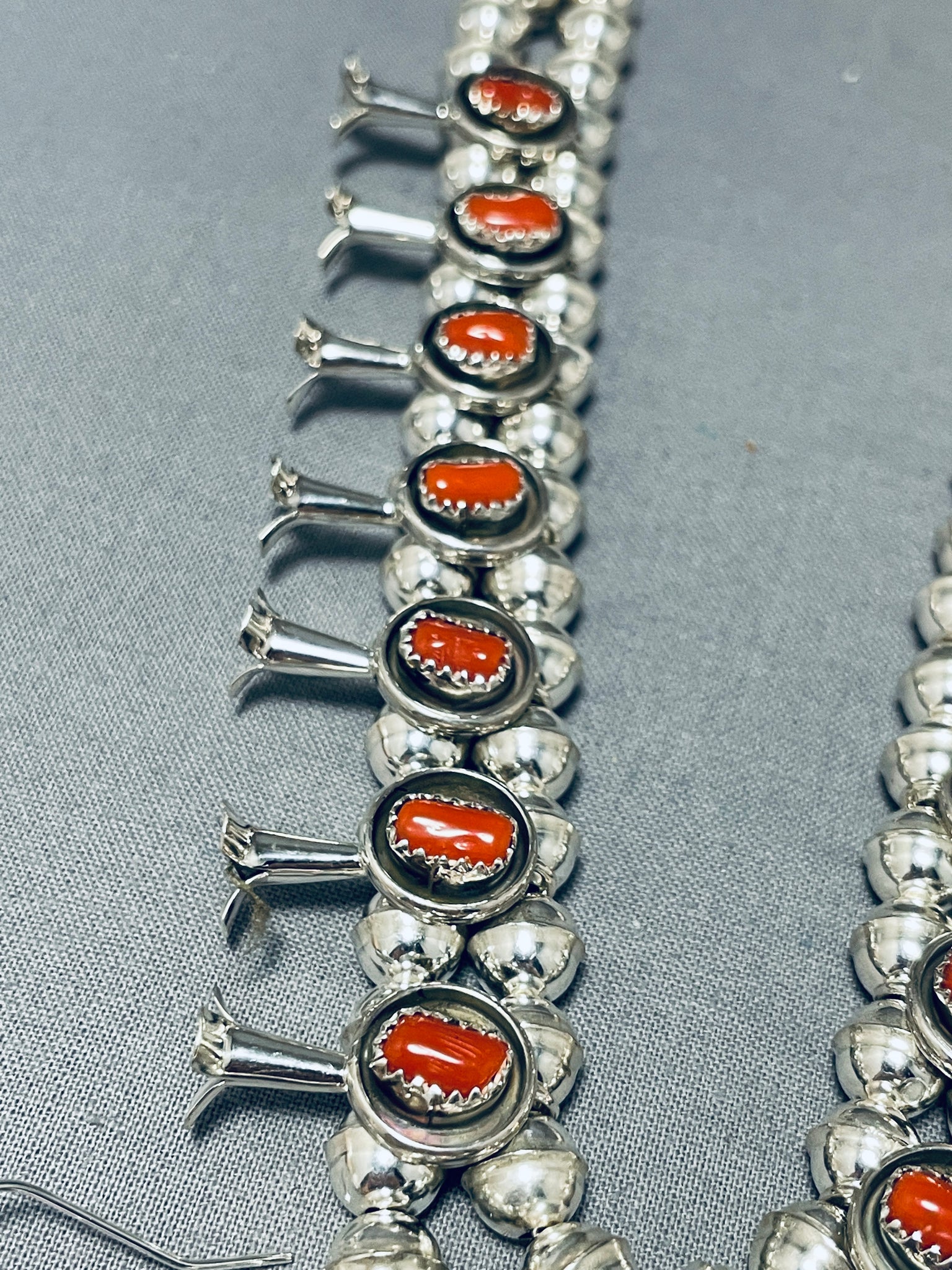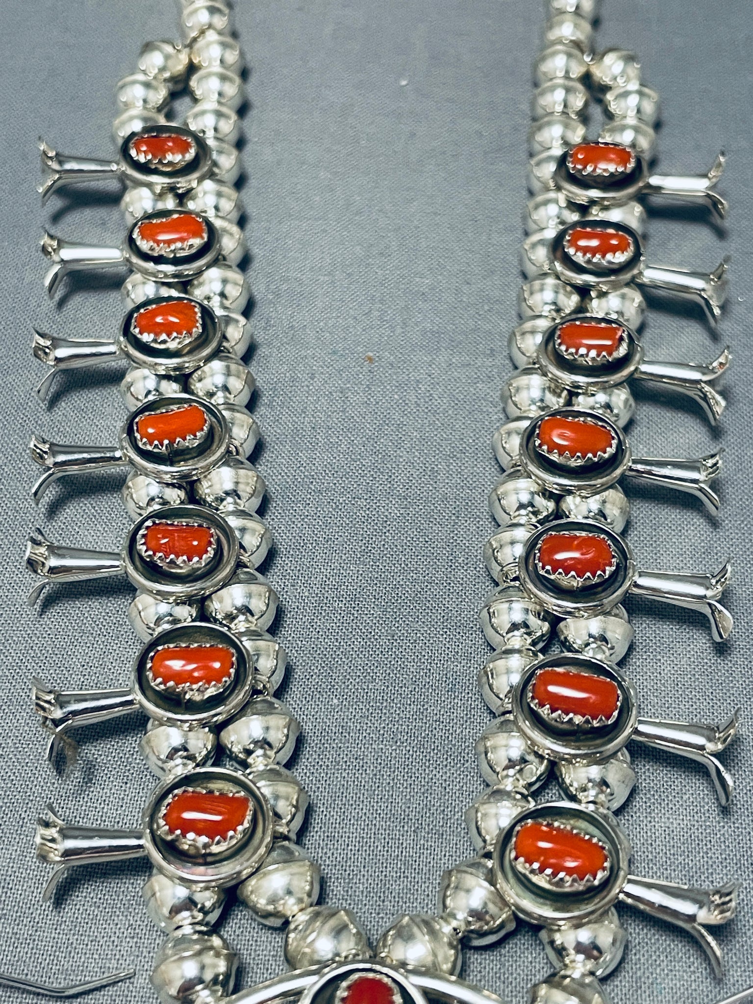 Unforgettable Native American Navajo Coral Sterling Silver Squash Blossom Necklace