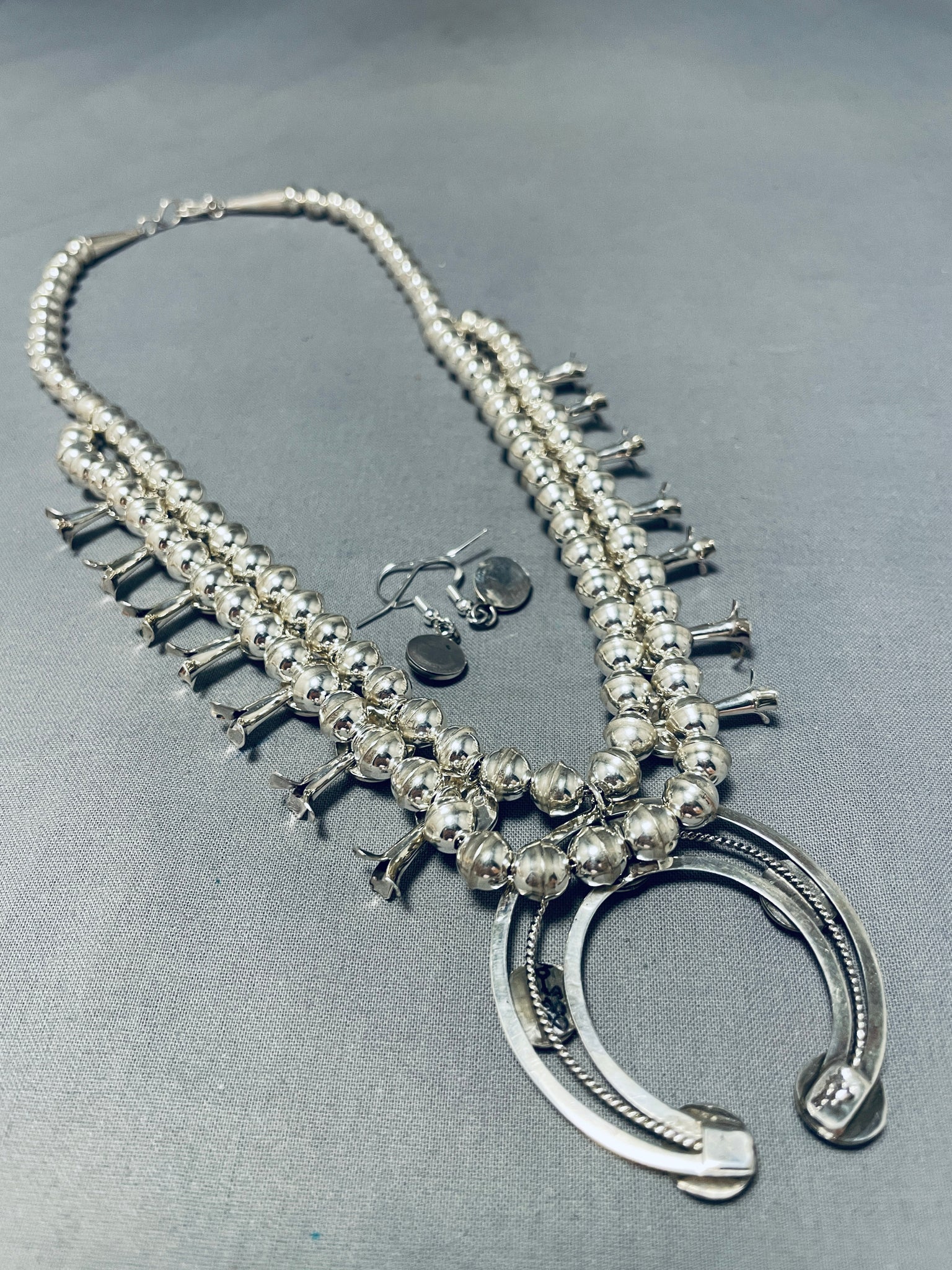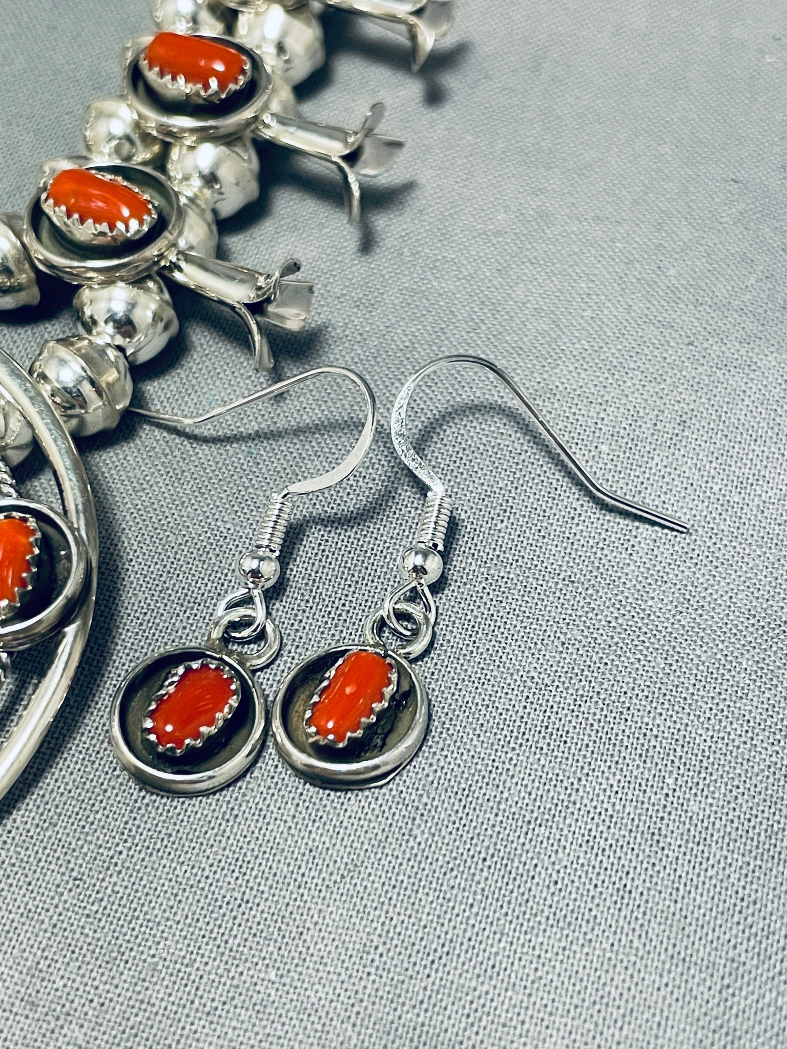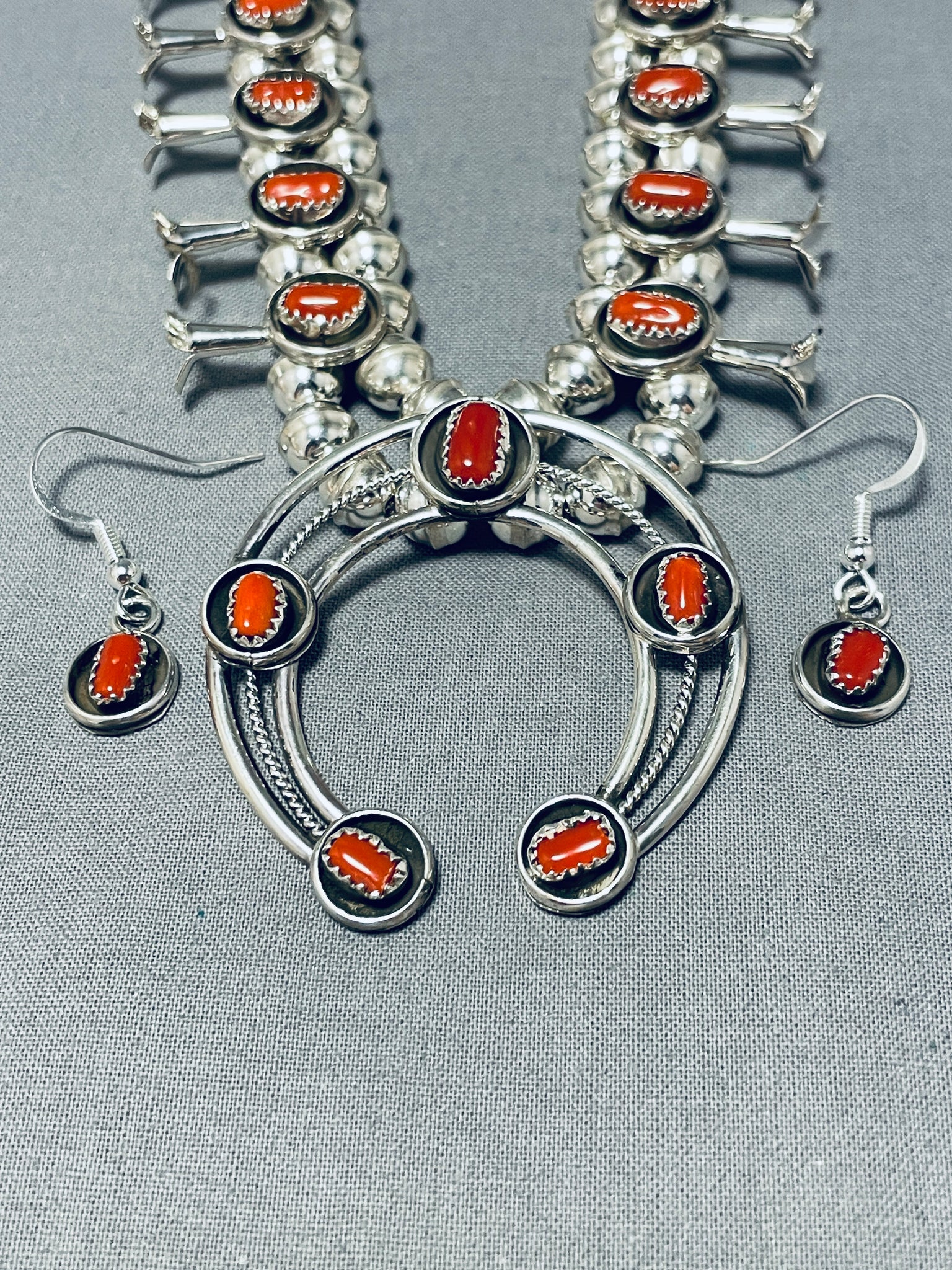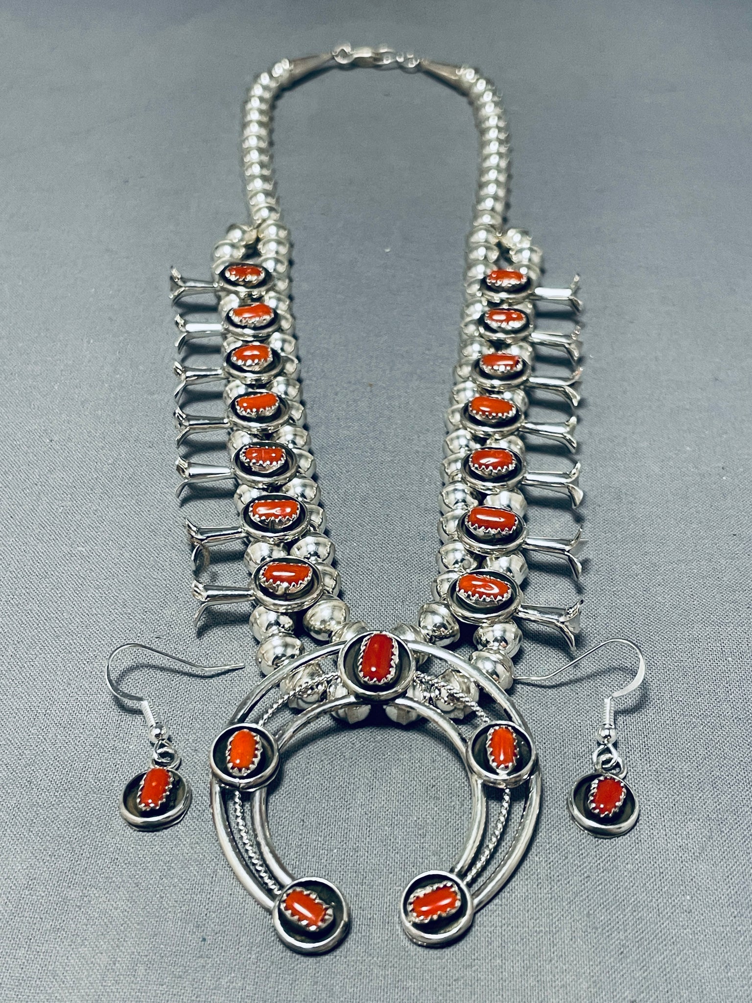 Unforgettable Native American Navajo Coral Sterling Silver Squash Blossom Necklace