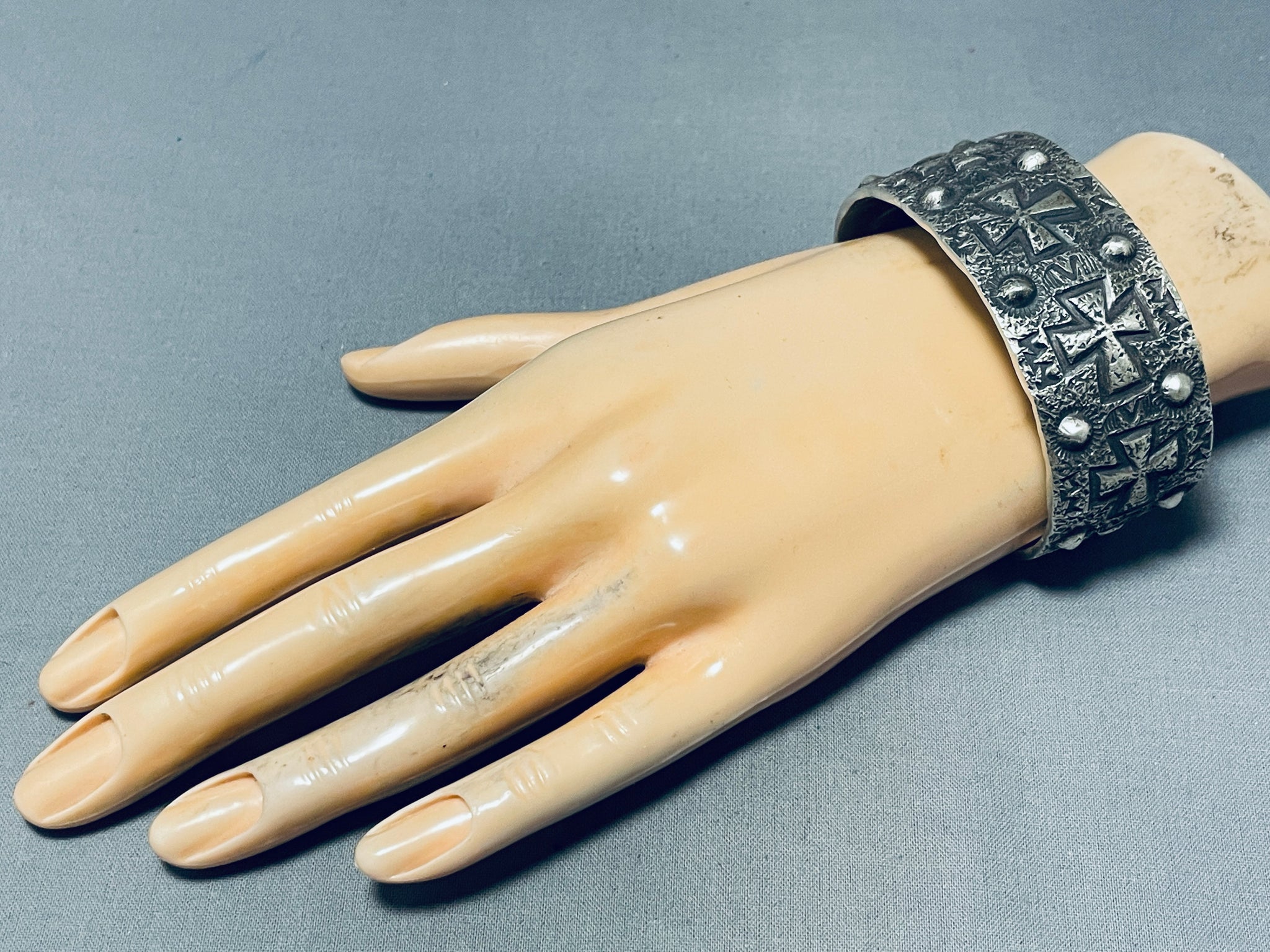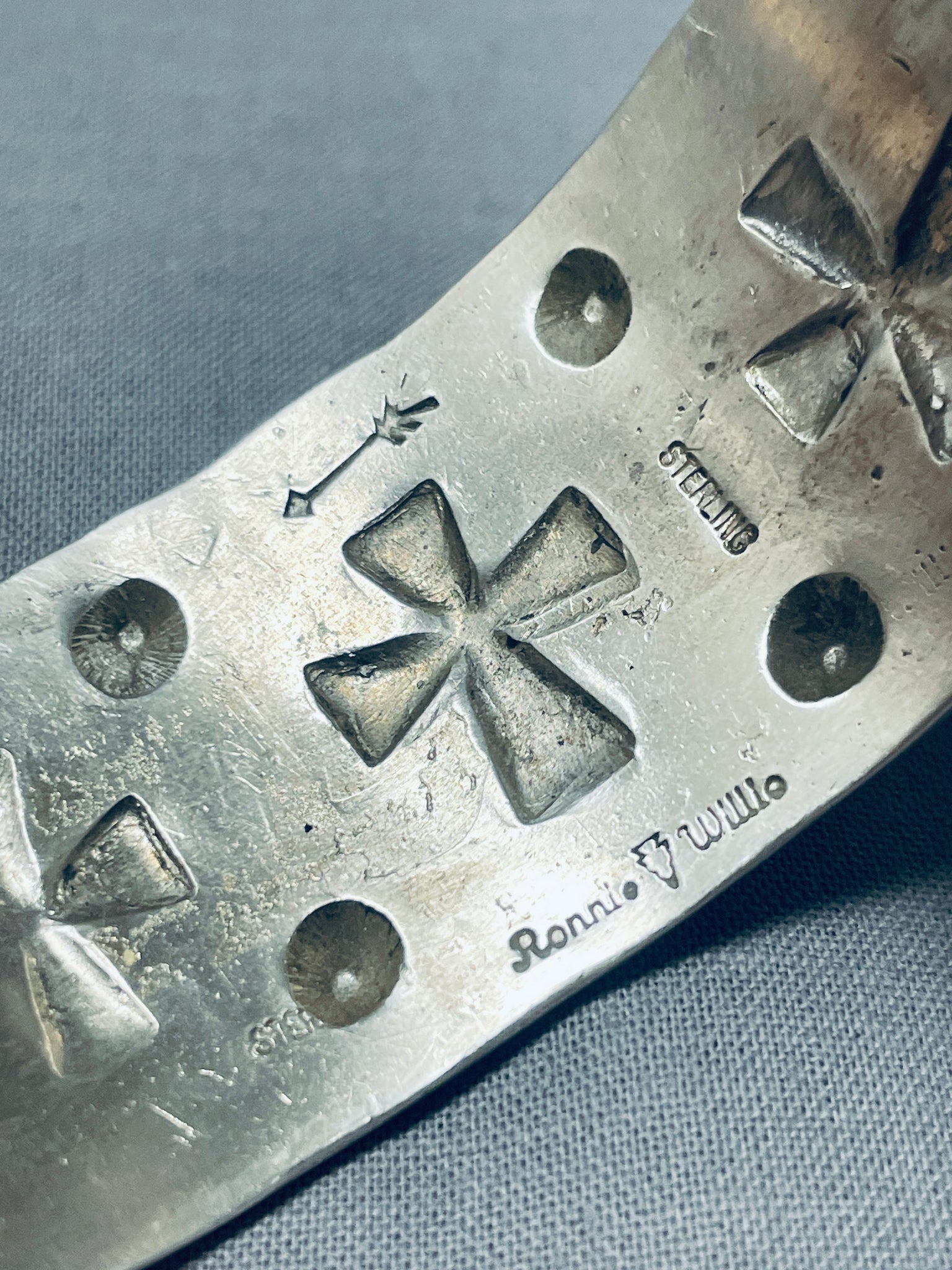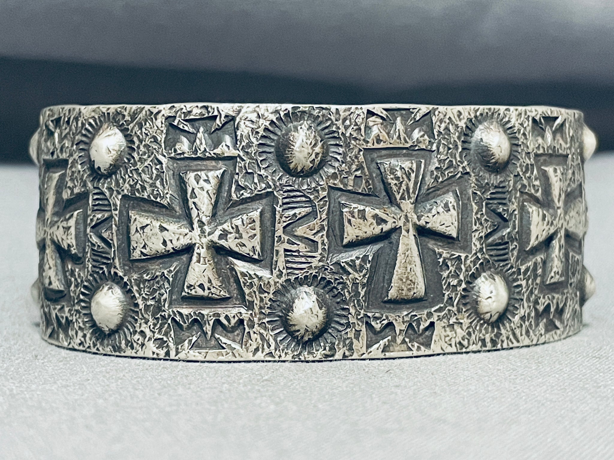 A magnificent Navajo silver bracelet. Repousse crosses and rounds seemingly burst forth from the sandcast textured backdrop of this thick, silver cuff as they reach from end to end! Ronnie Willie's work has been featured in various exhibitions and shows, where he has received recognition for his craftsmanship and creativity. His jewelry has gained popularity among collectors and Native American art enthusiasts, contributing to his reputation as a notable Navajo artist.