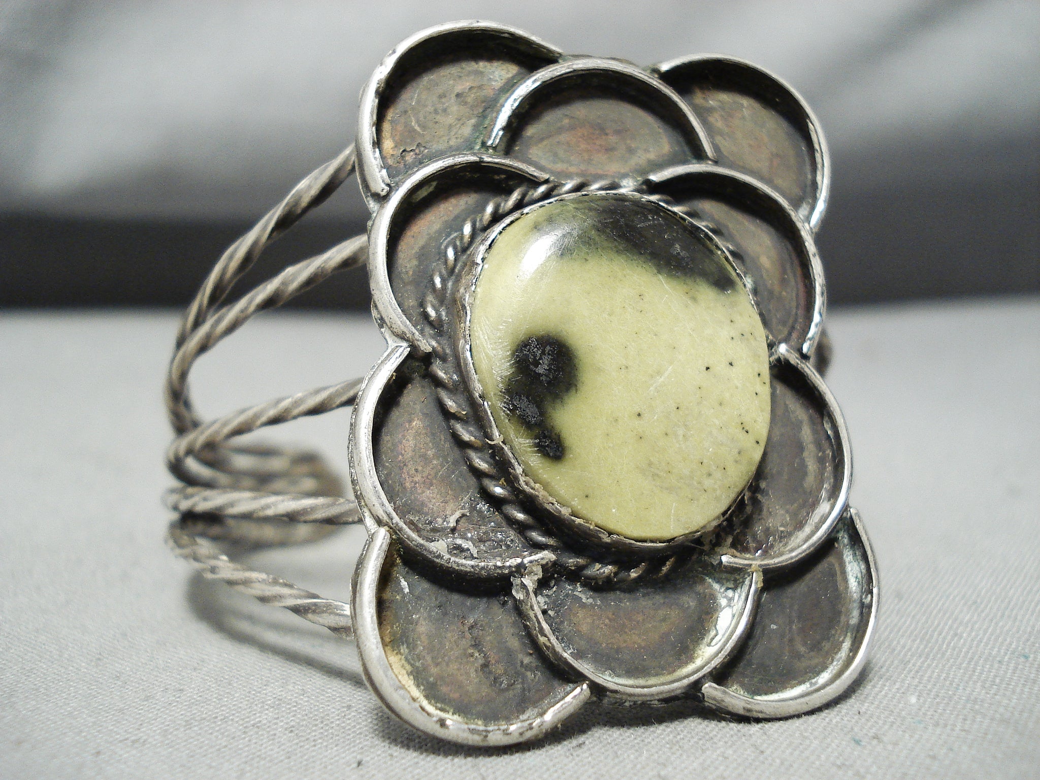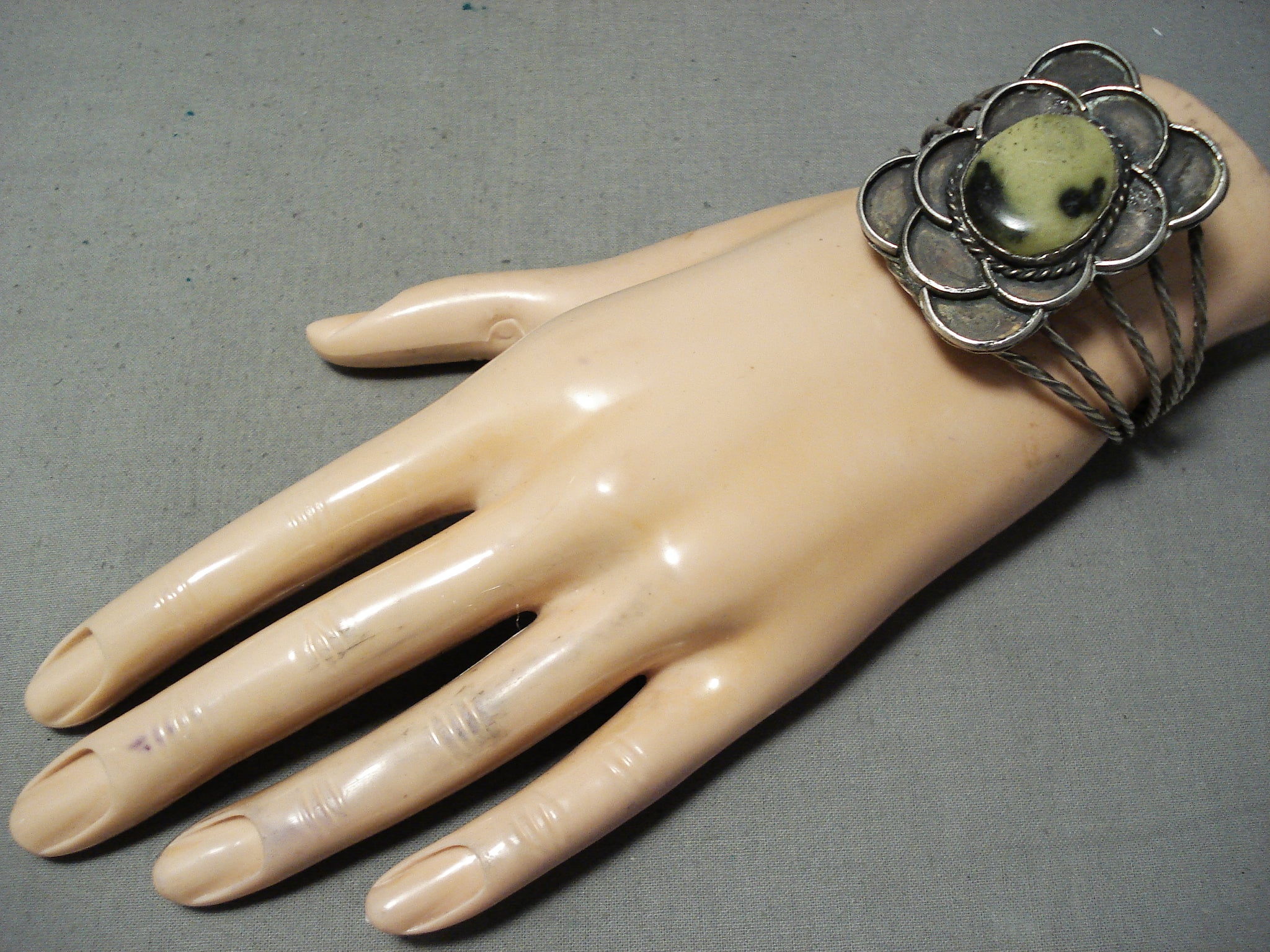 This is a breathtaking vintage Navajo single stone silver bracelet. This bracelet contains a beautiful center moss colored stone. Surrounding the stone are wonderful silver works that consist of ropes and wave works that appear as clouds. The bracelet includes a superior five silver shank cuff with each shank being beautifully coiled from one end to the other. The center stone measures around 7/8" x 3/4". The width of the bracelet measures around 1-3/4". Sterling silver. Cir. Mid century . The inside end to end measures around 5-1/2" with an additional 1" gap. Sturdy 32 grams.
