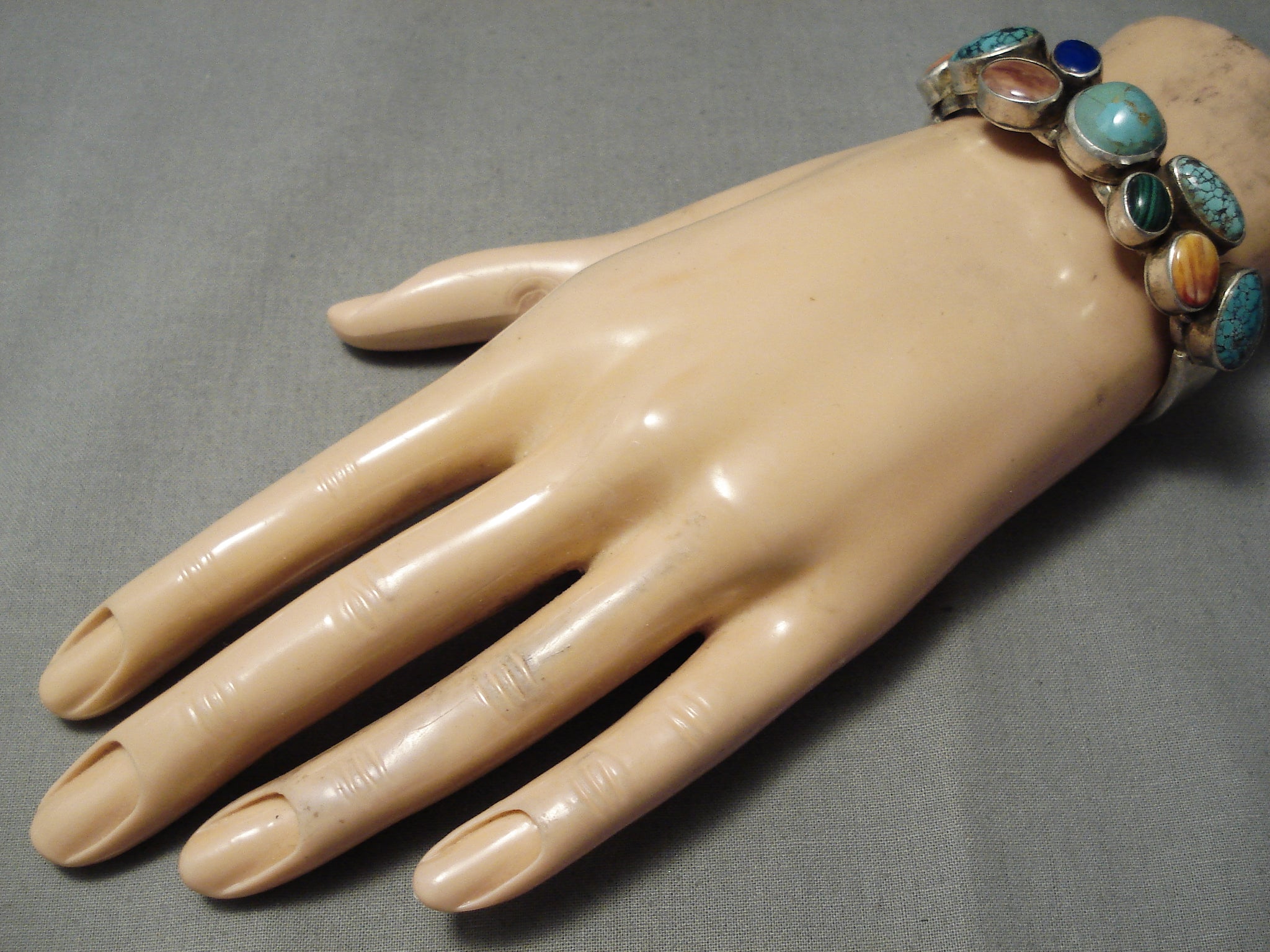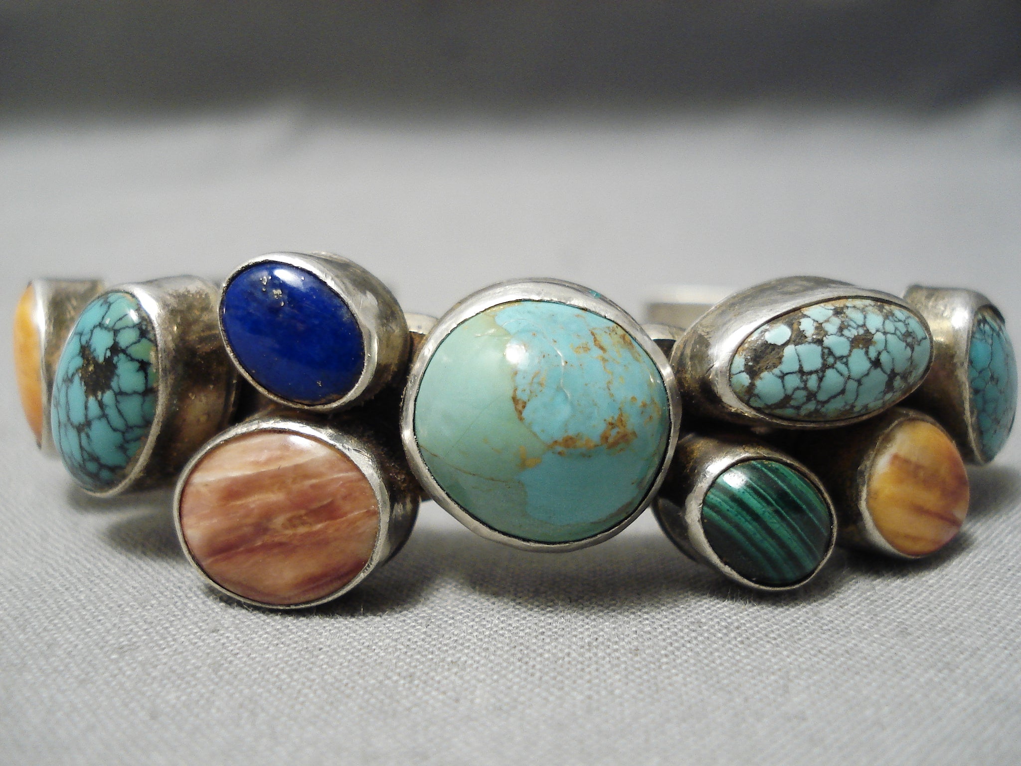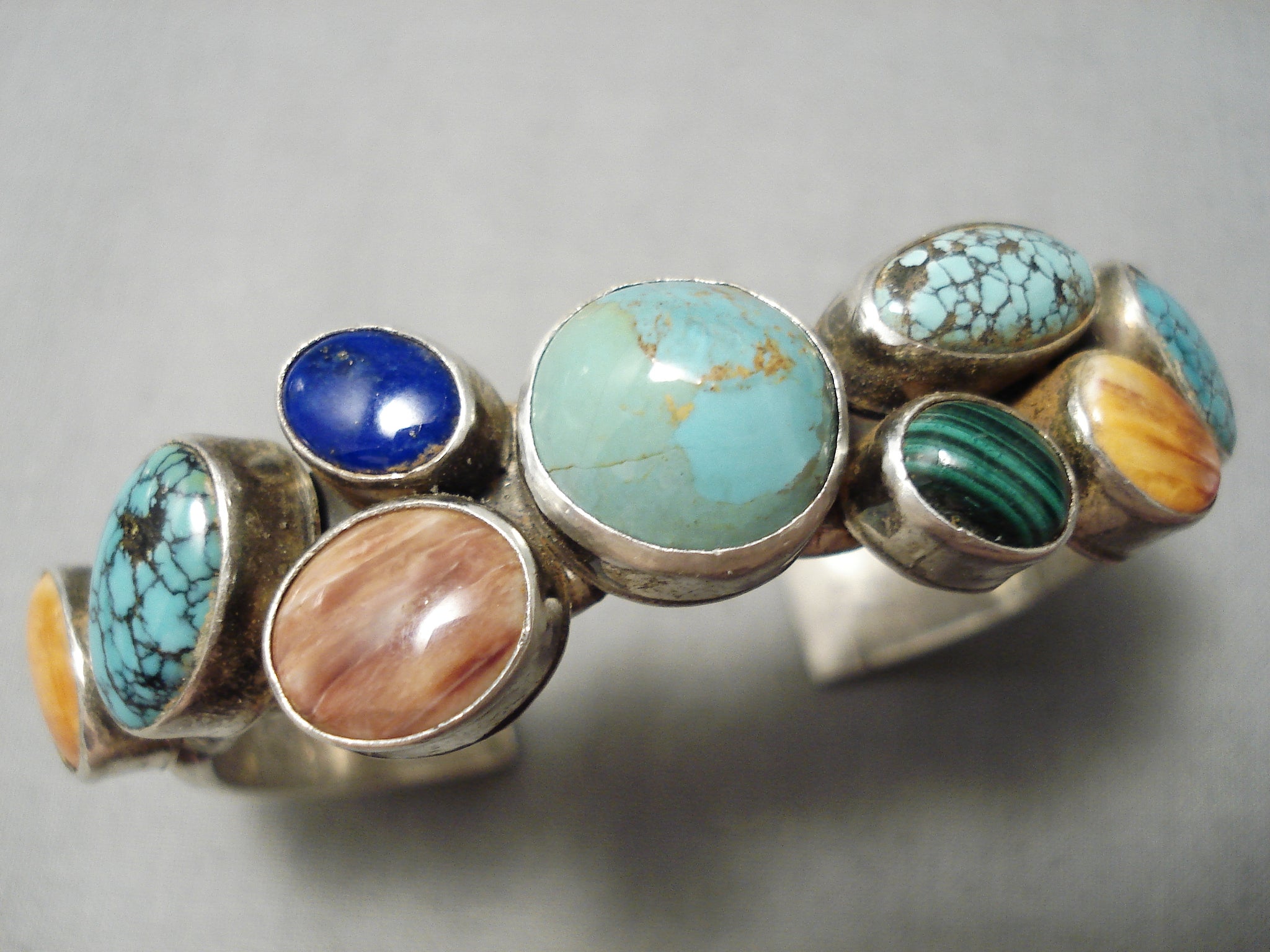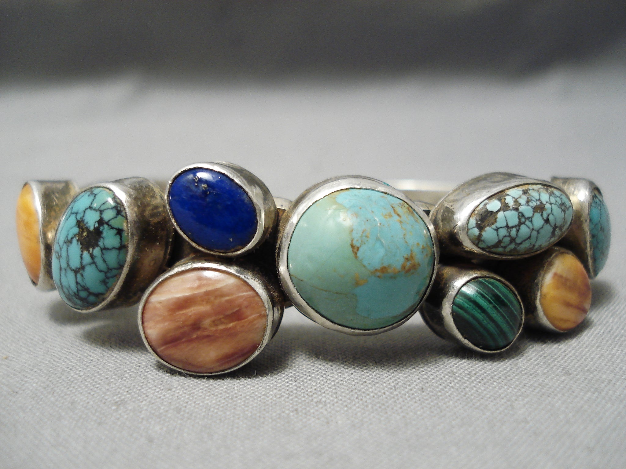 Unique Multi Stone Vintage Native American Navajo Spiderweb Turquoise Sterling Silver Bracelet