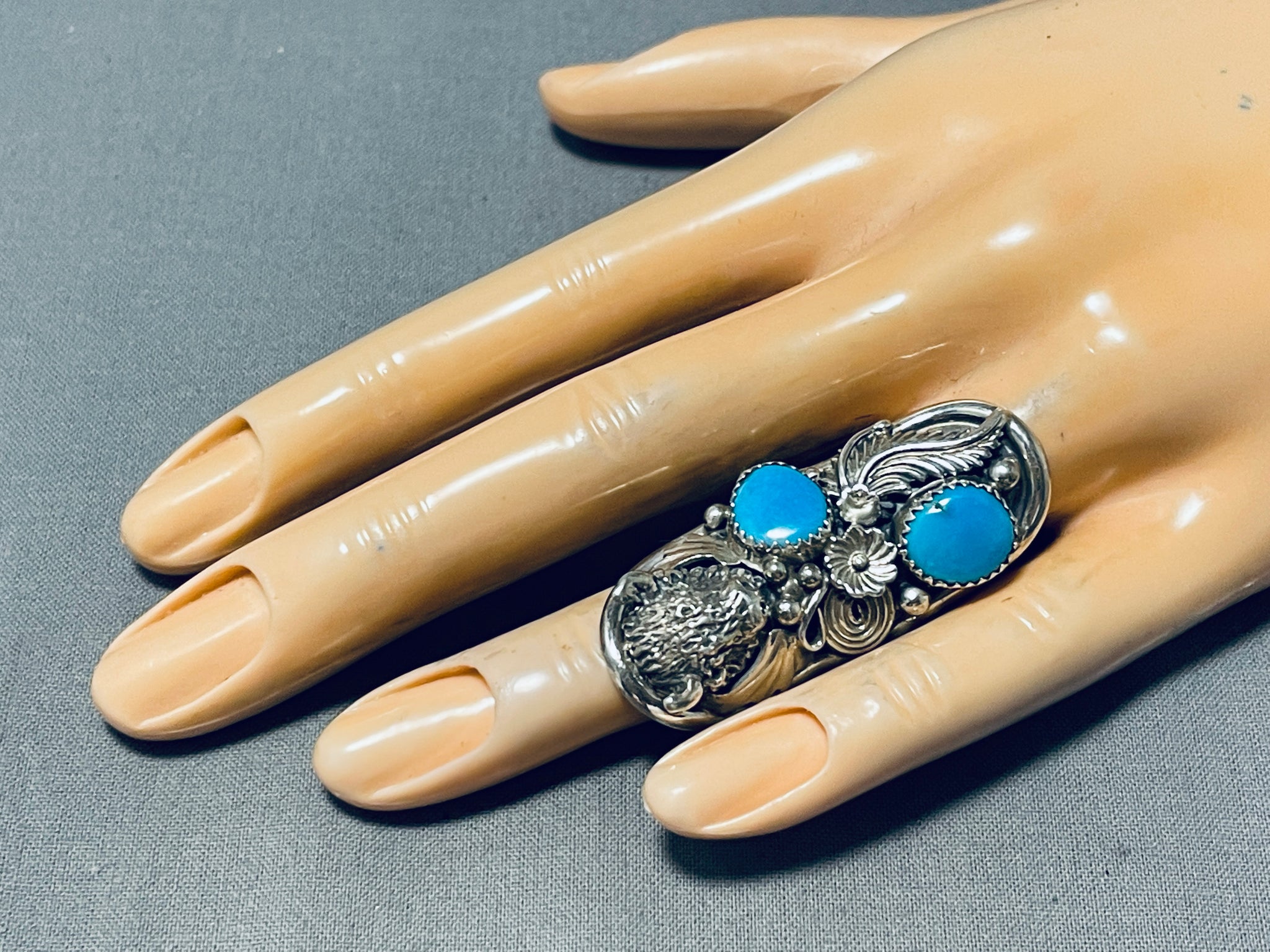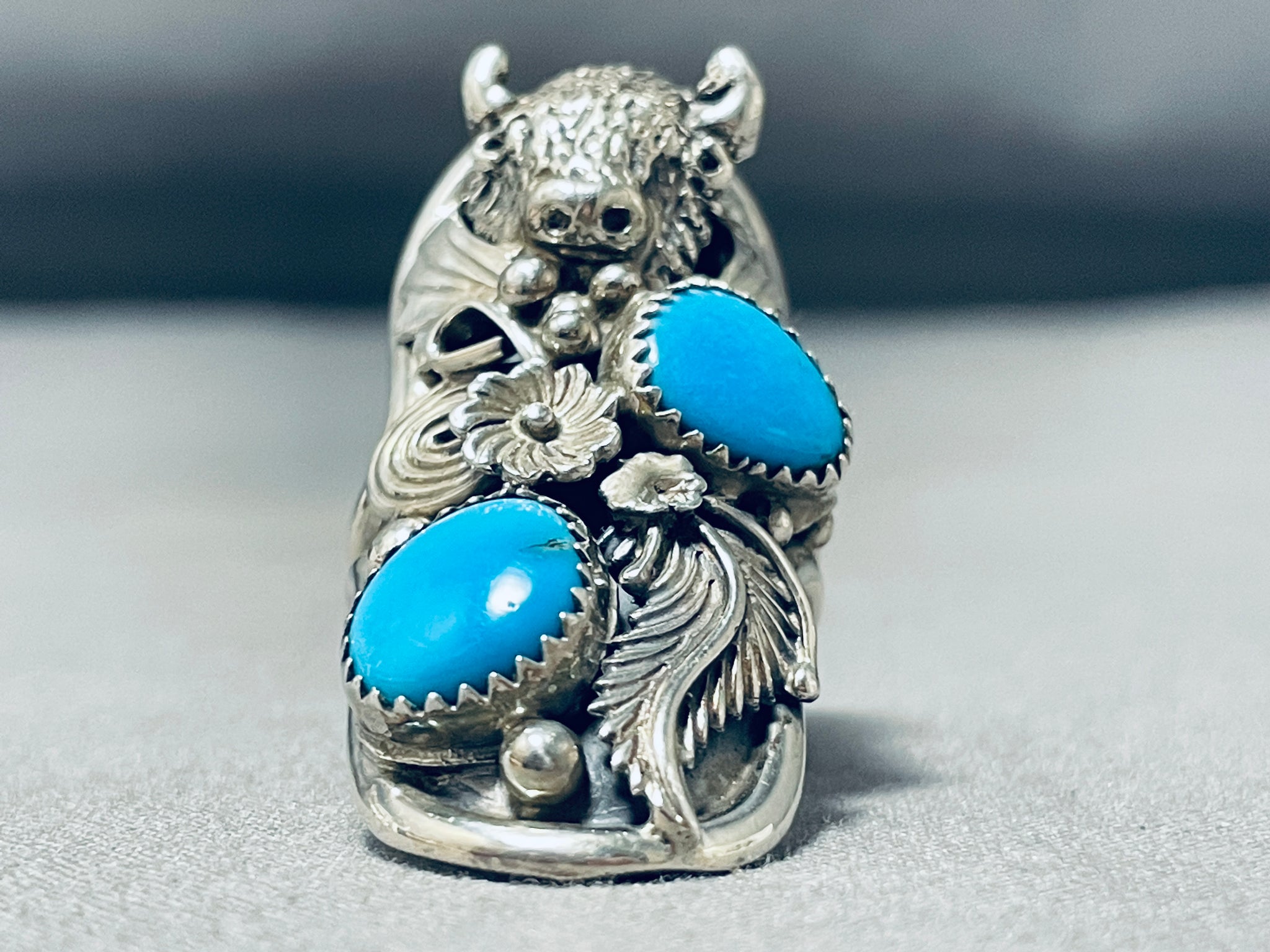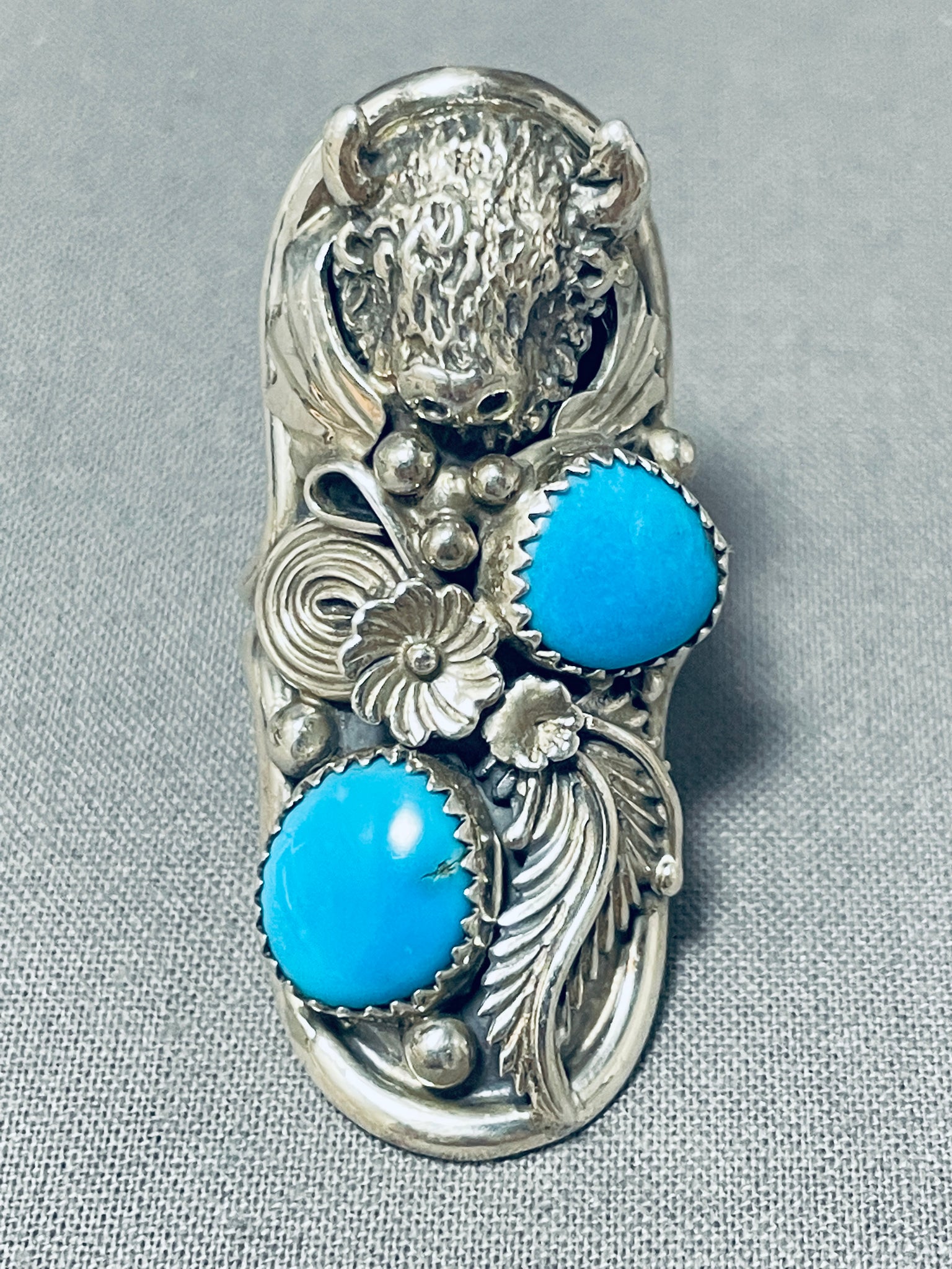 This is an impressive Navajo silver ring having 2 Kingman turquoise ovals and an intricately handcarved silver buffalo surrounded by silver leaves, silver fans, silver swirls, silver beads, silver stems and silver florals with a handcarved silver border and a double silver rail band! Truly Unbelievable Masterpiece! The silver buffalo measures around 1/2" x 1/2". The stones measure around 3/8" x 3/8". The ring face measures around 1-3/4" x 3/4". The ring size is around 7. Sterling silver, marked. Sturdy 16 grams.